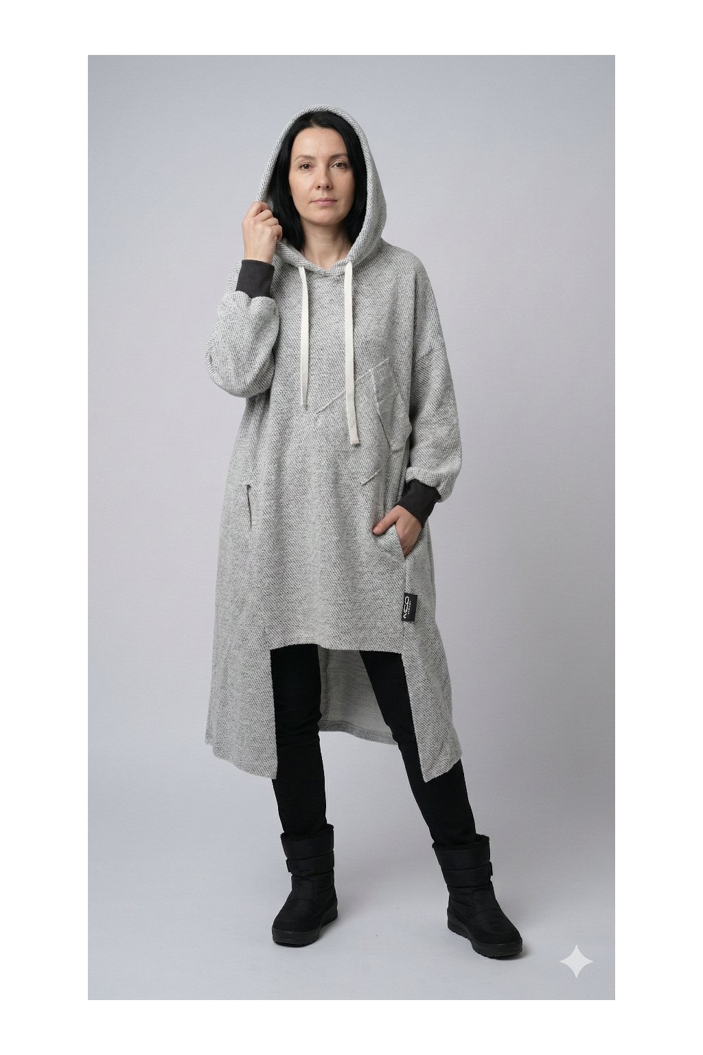 Mikinové dlouhé šaty značky Miss City Official. Šaty mají rovný střih, kapuci, kapsy v na bocích a jednu v přední části. Spodní část šatů je "vykouslá" Jsou vyrobené z velice příjemného, kvalitního a lehce zatepleného materiálu.
