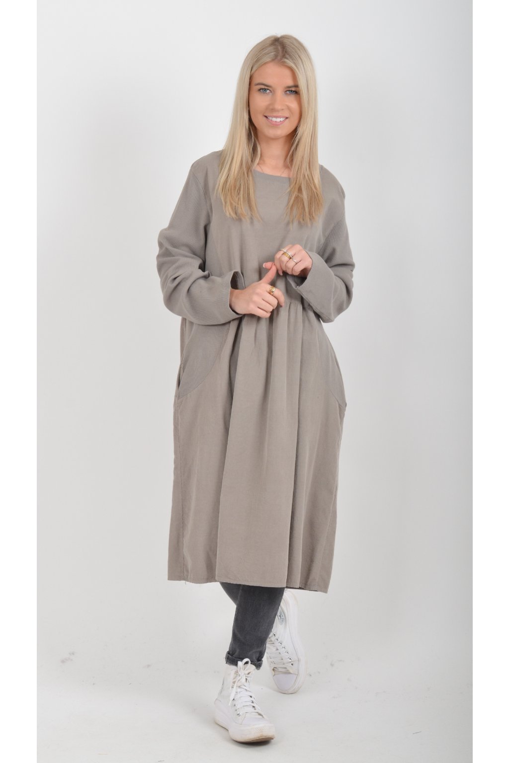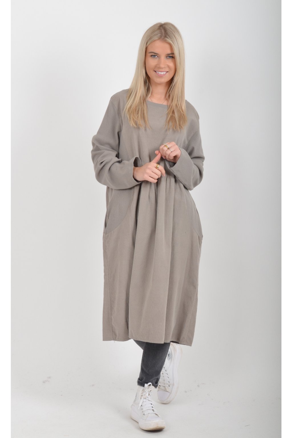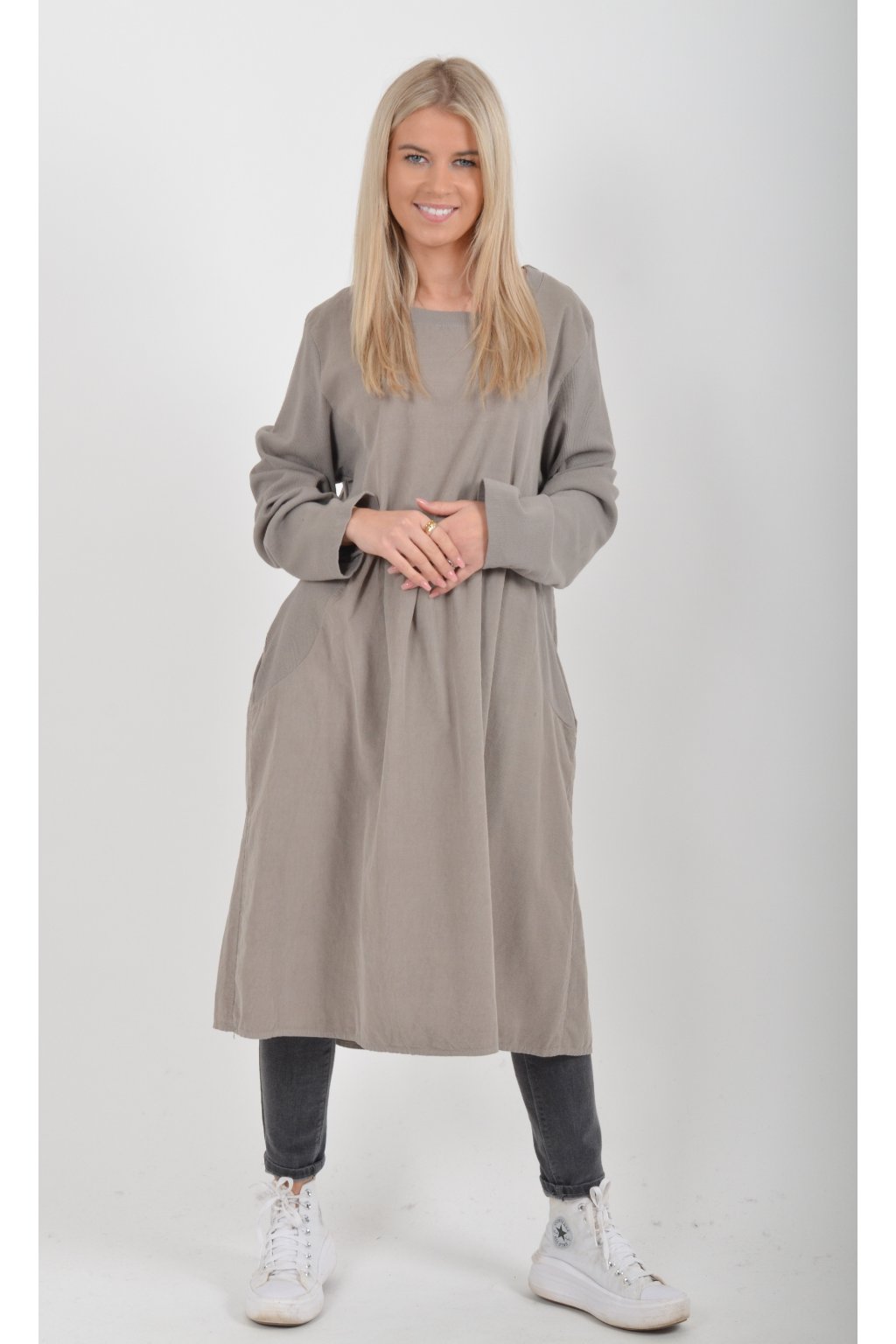 Jednobarevné manšestrové šaty s dlouhým rukávem a kapsami na bocích. Šaty jsou vyrobeny z velice příjemného a kvalitního materiálu. Jsou vhodné pro každodenní nošení a mají áčkový střih.