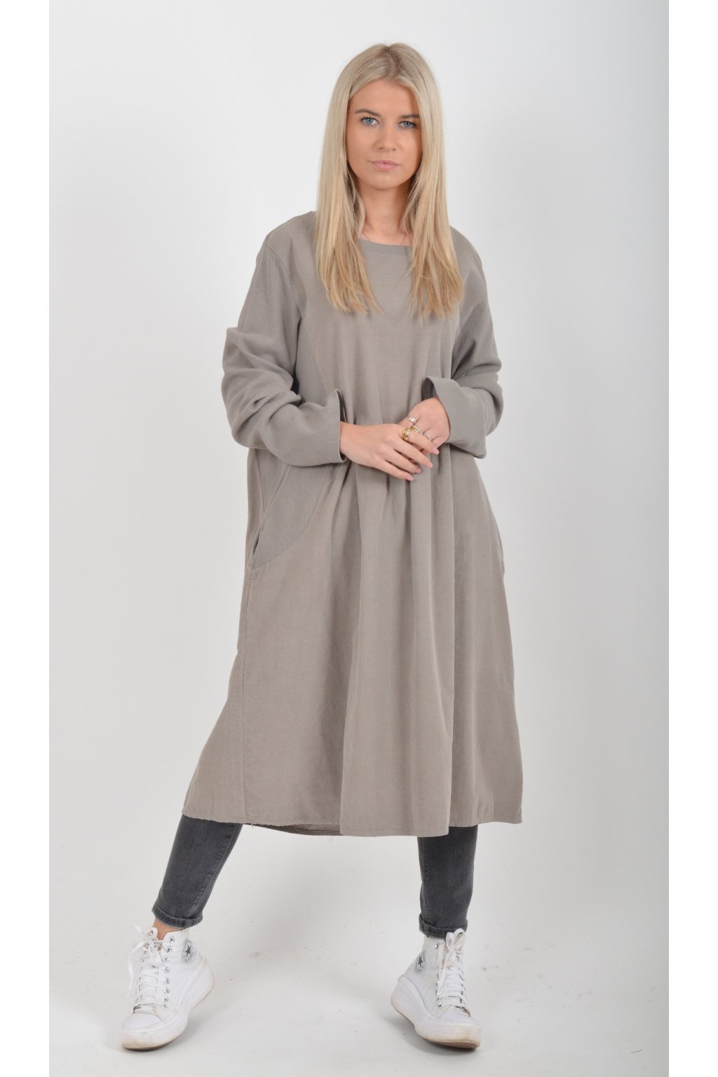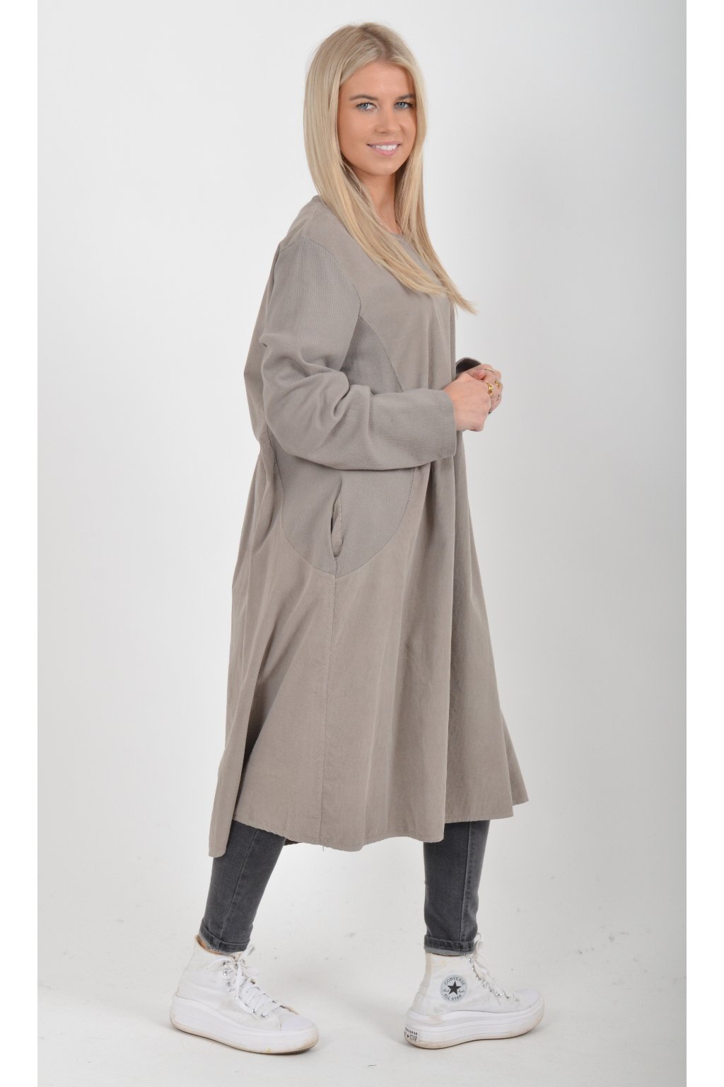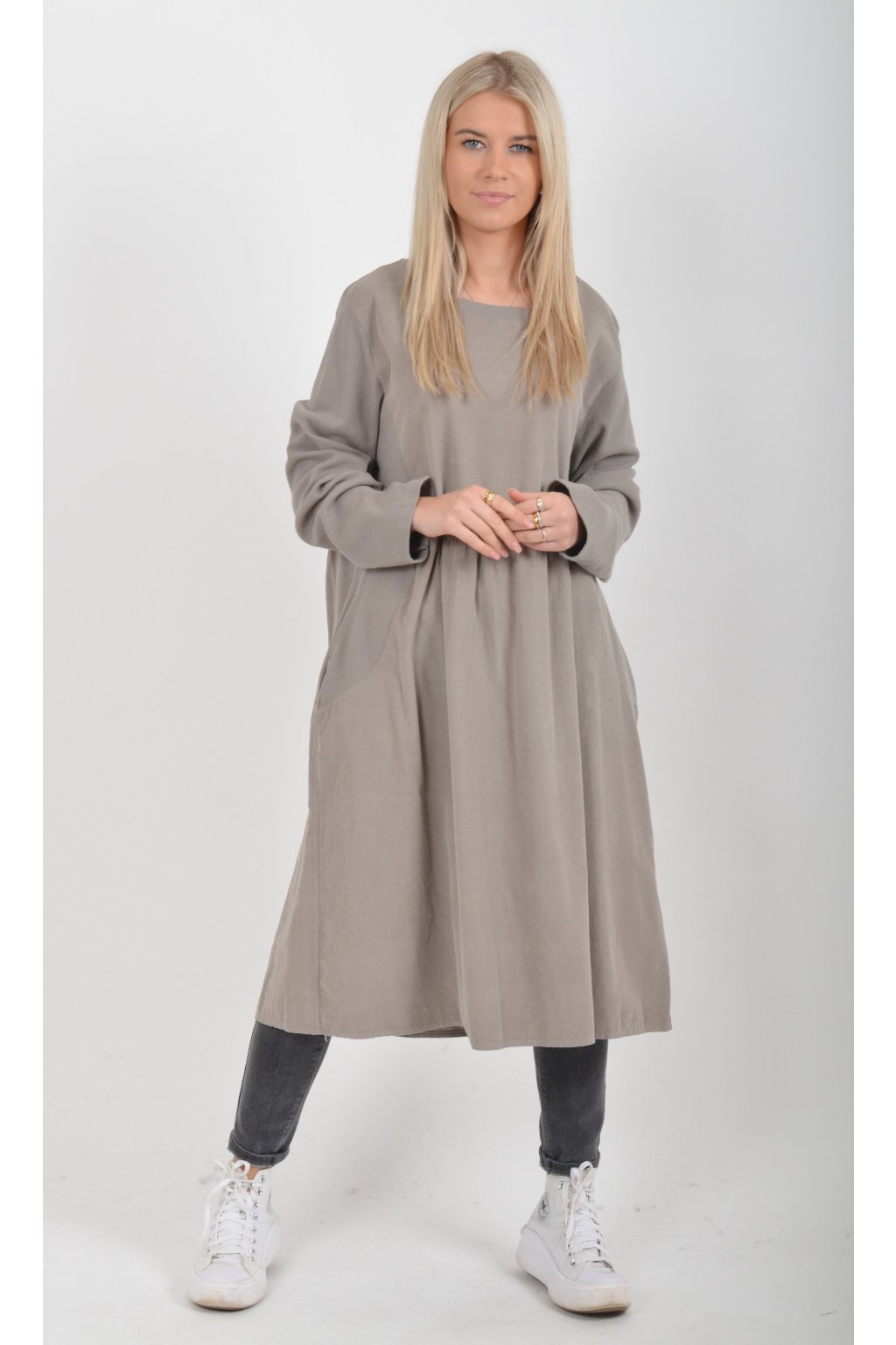 Jednobarevné manšestrové šaty s dlouhým rukávem a kapsami na bocích. Šaty jsou vyrobeny z velice příjemného a kvalitního materiálu. Jsou vhodné pro každodenní nošení a mají áčkový střih.