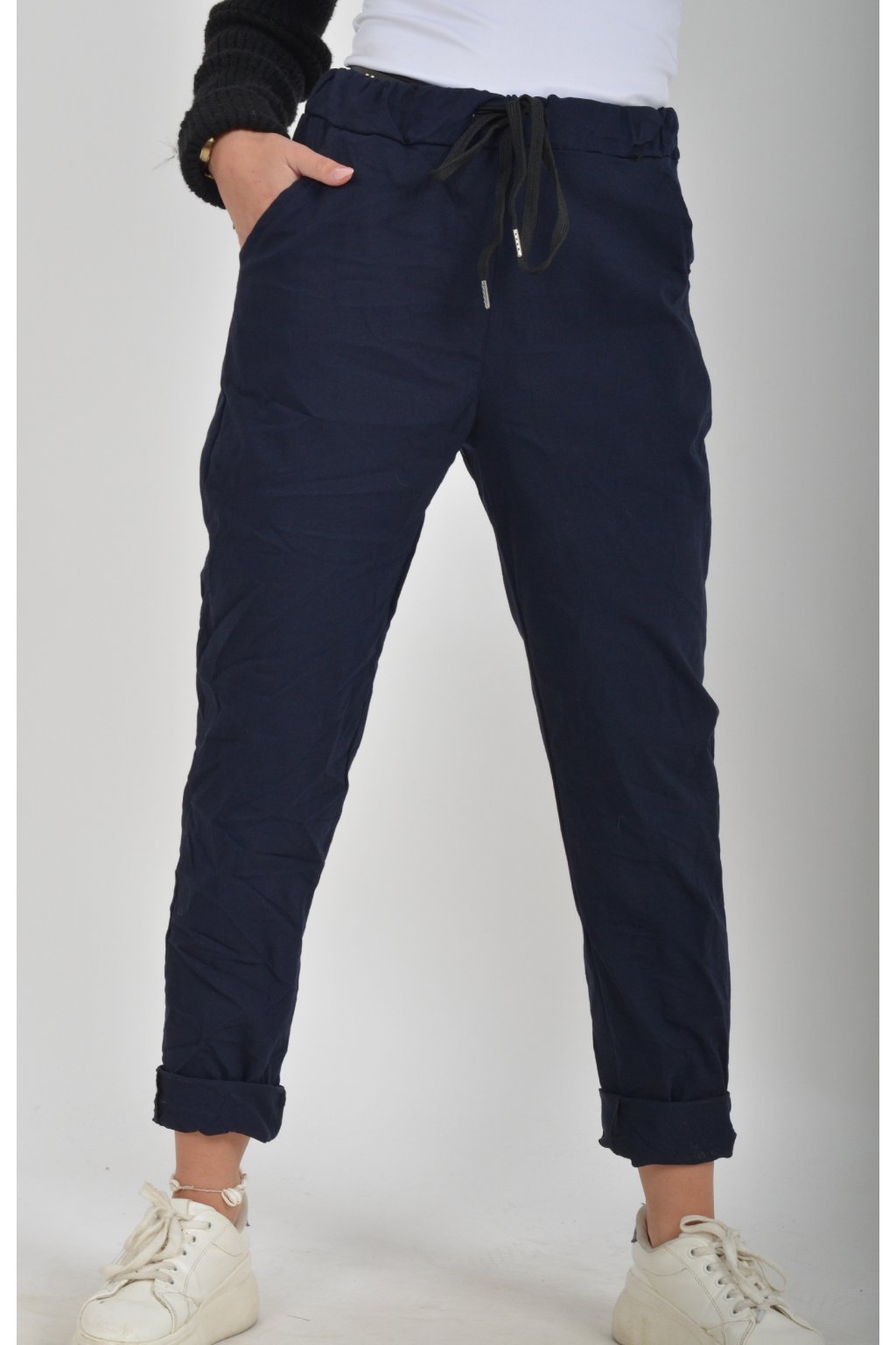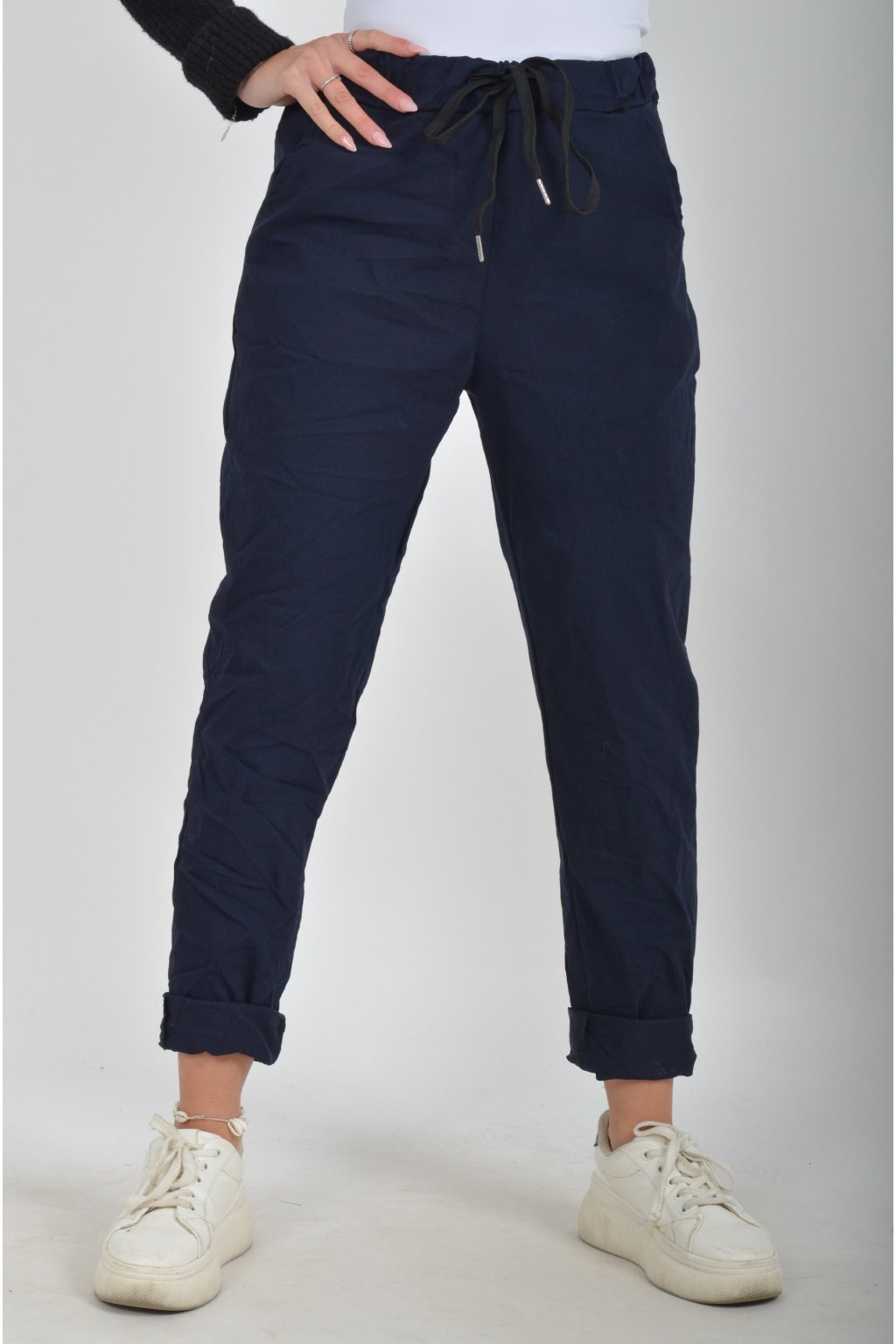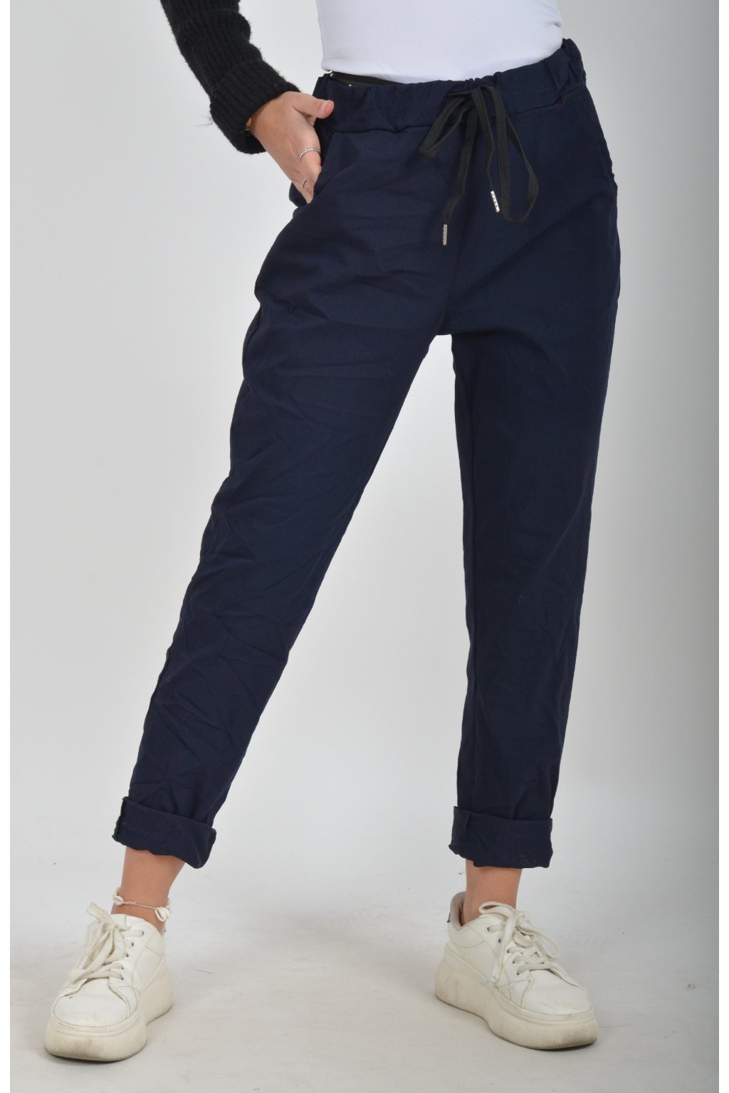 Jednobarevné kalhoty s kapsami na bocích, které se krásně přizpůsobí postavě, díky podílu elastanu. Jsou vhodné pro každodenní nošení. V pase je zapracovaná guma a tkanička pro libovolné stažení.