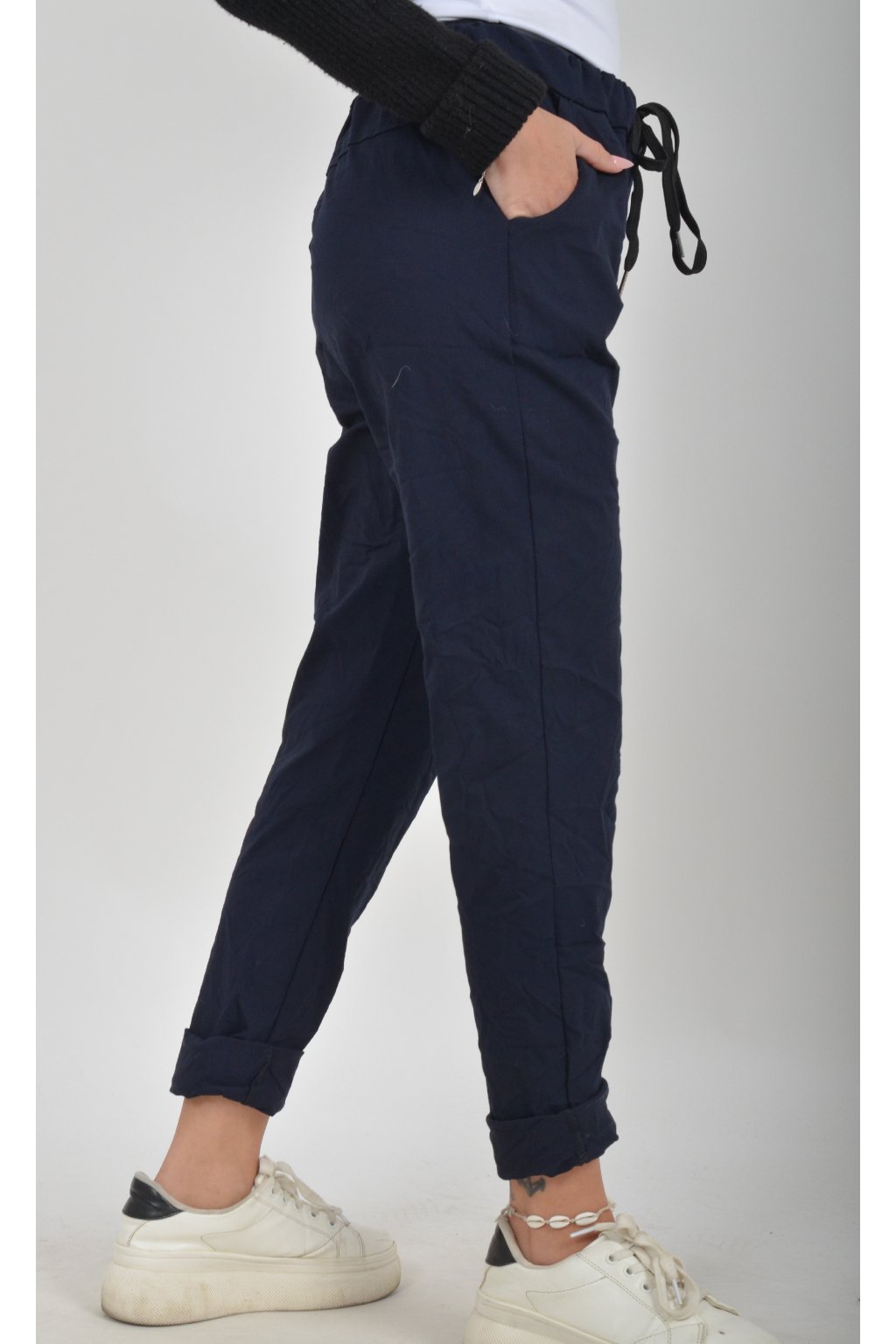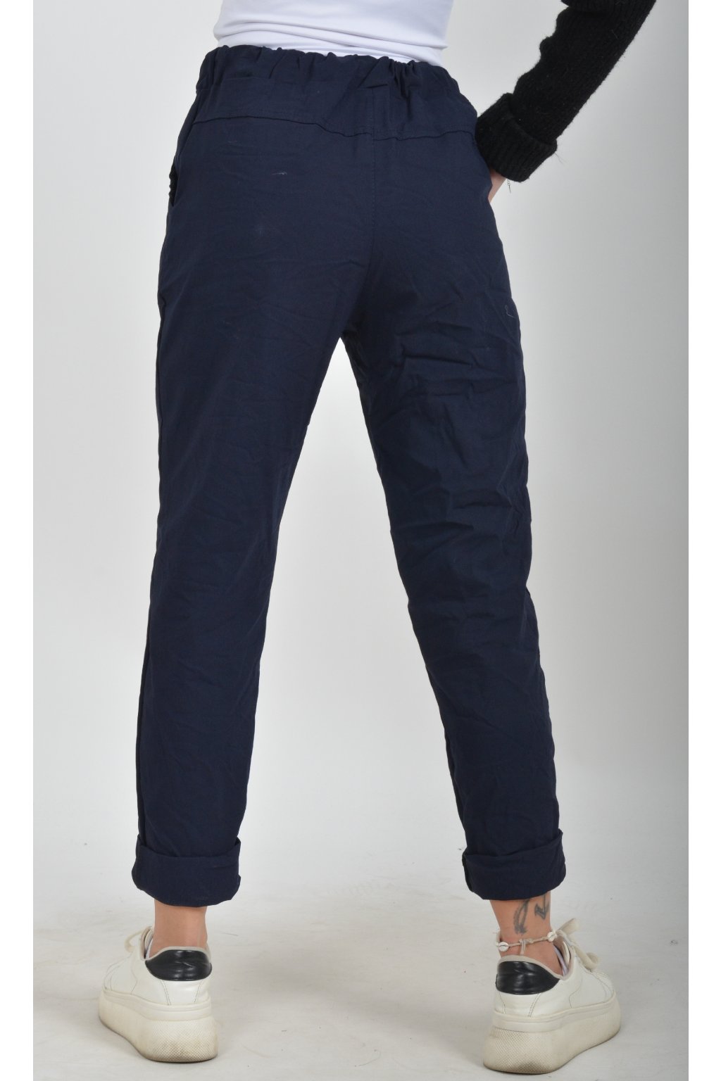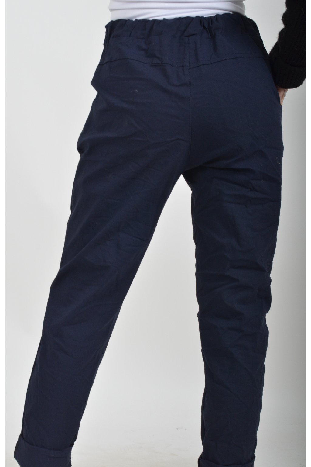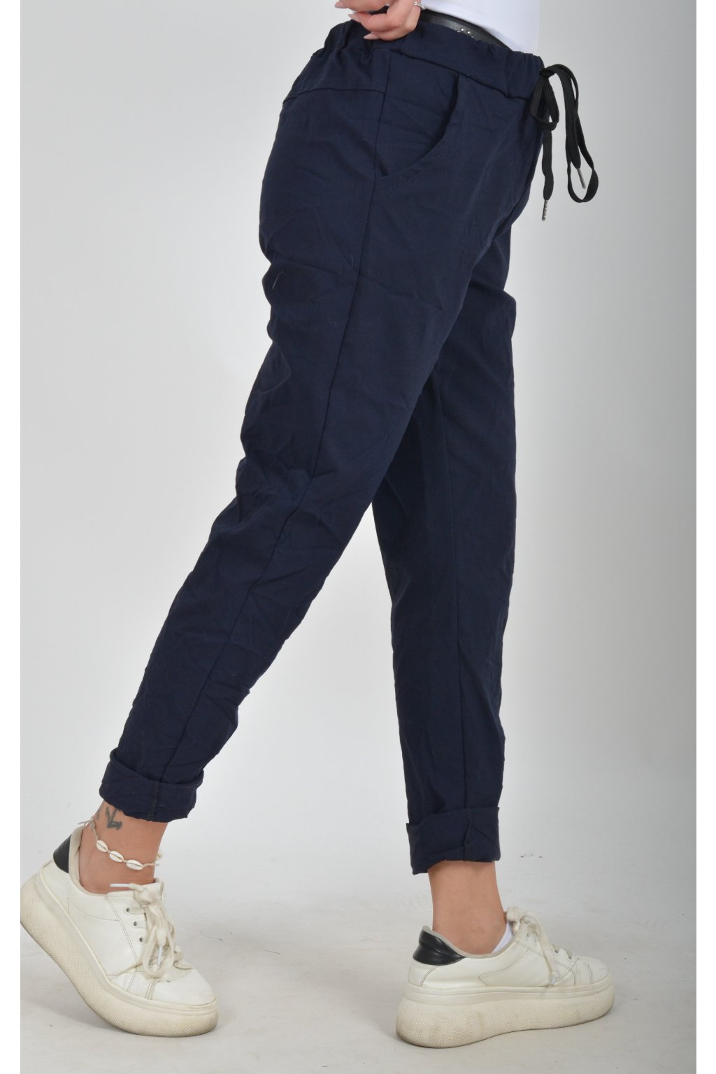Jednobarevné kalhoty s kapsami na bocích, které se krásně přizpůsobí postavě, díky podílu elastanu. Jsou vhodné pro každodenní nošení. V pase je zapracovaná guma a tkanička pro libovolné stažení.