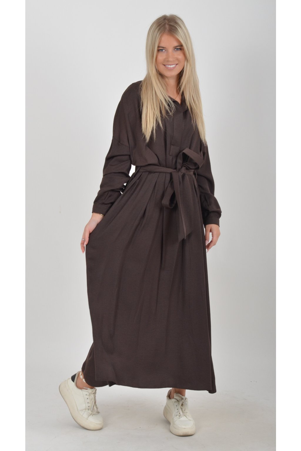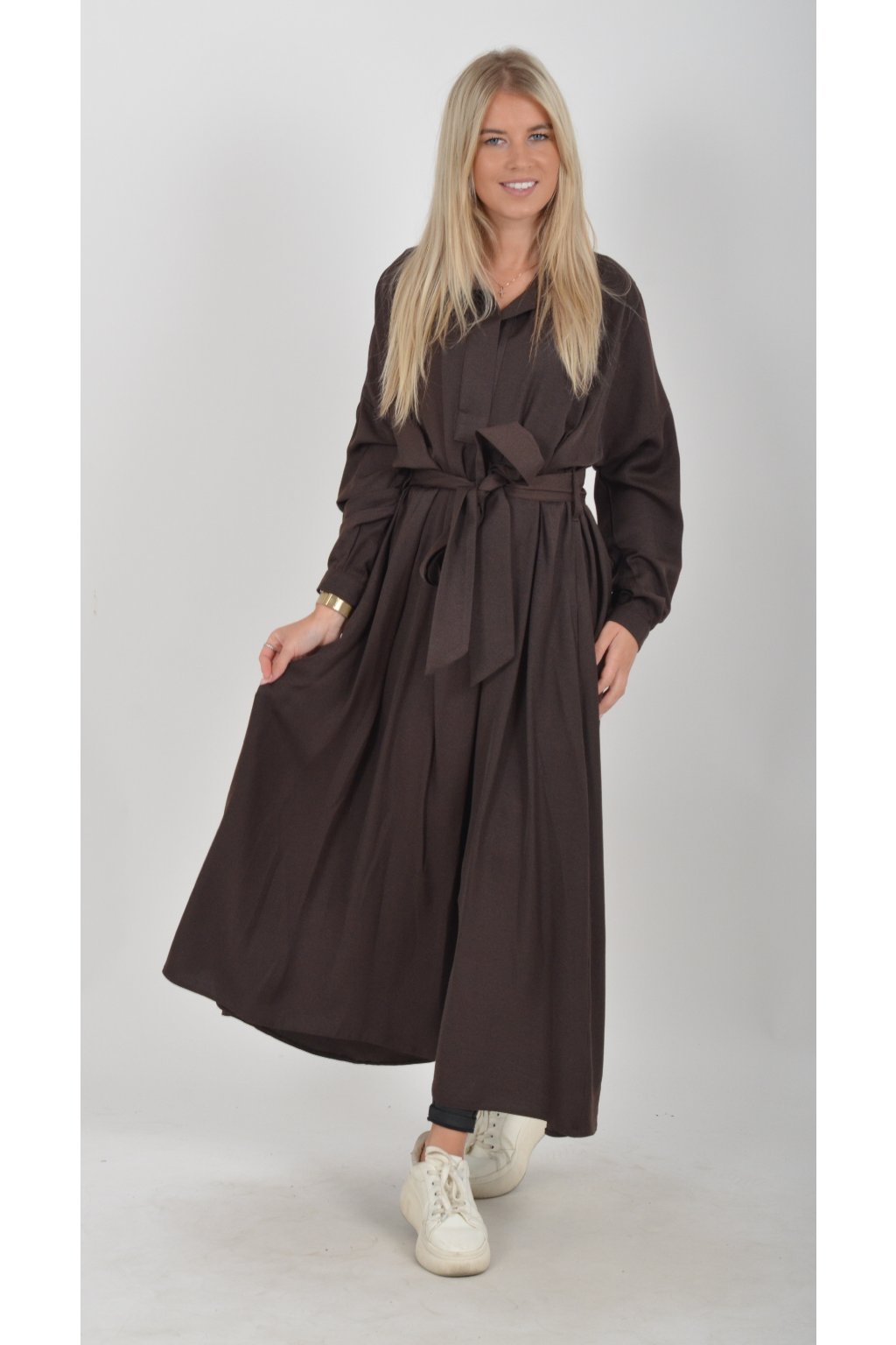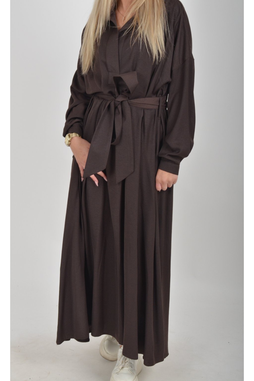 Dlouhé elegantní šaty áčkového střihu s dlouhým rukávem a páskem kůže. Šaty jsou z velice příjemného materiálu.