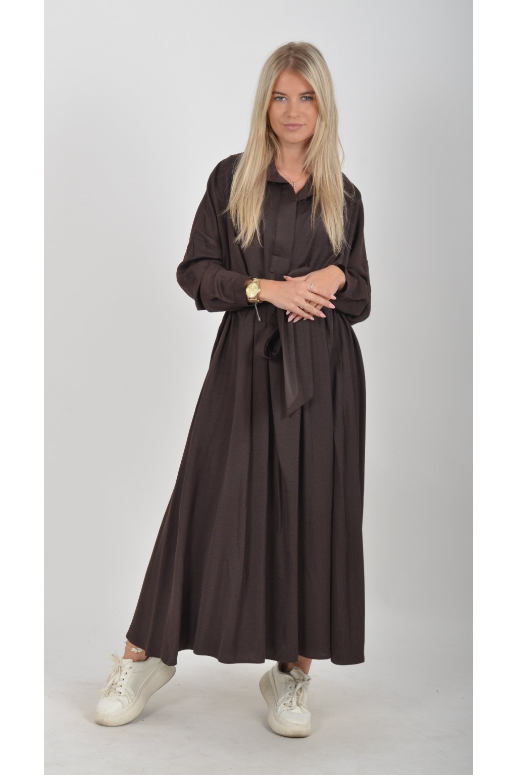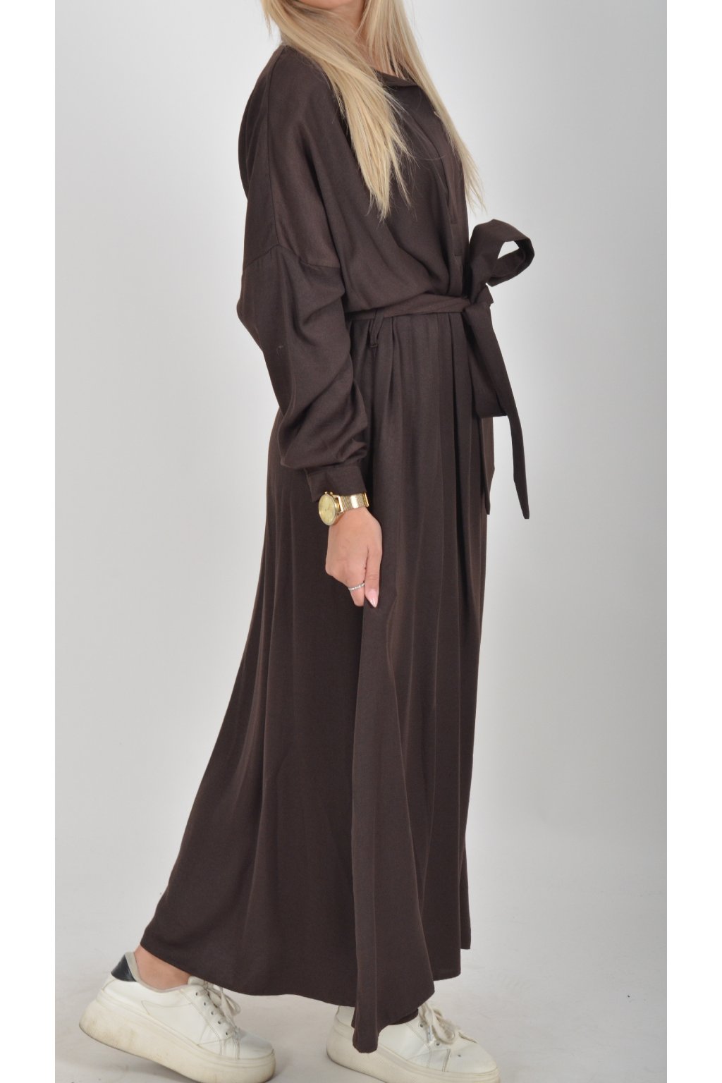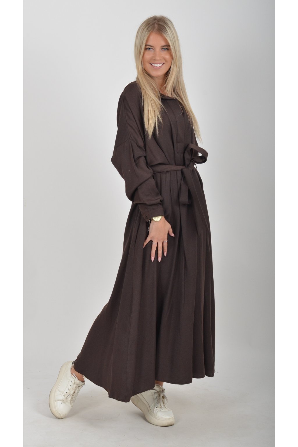 Dlouhé elegantní šaty áčkového střihu s dlouhým rukávem a páskem kůže. Šaty jsou z velice příjemného materiálu.