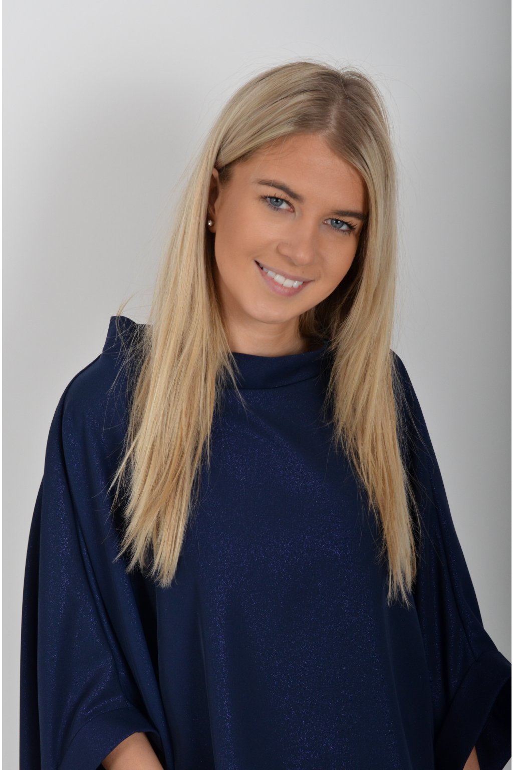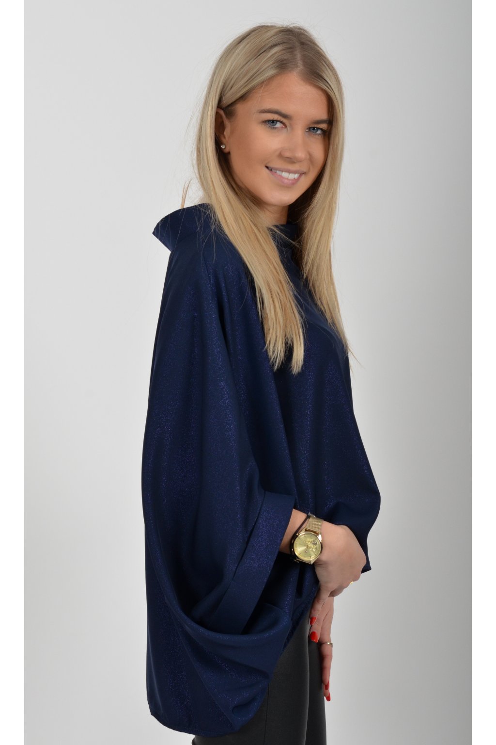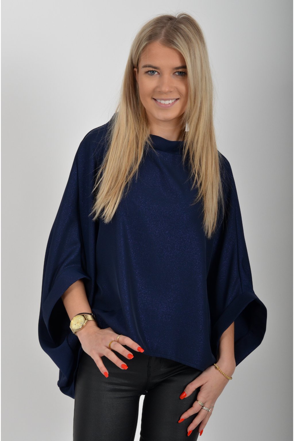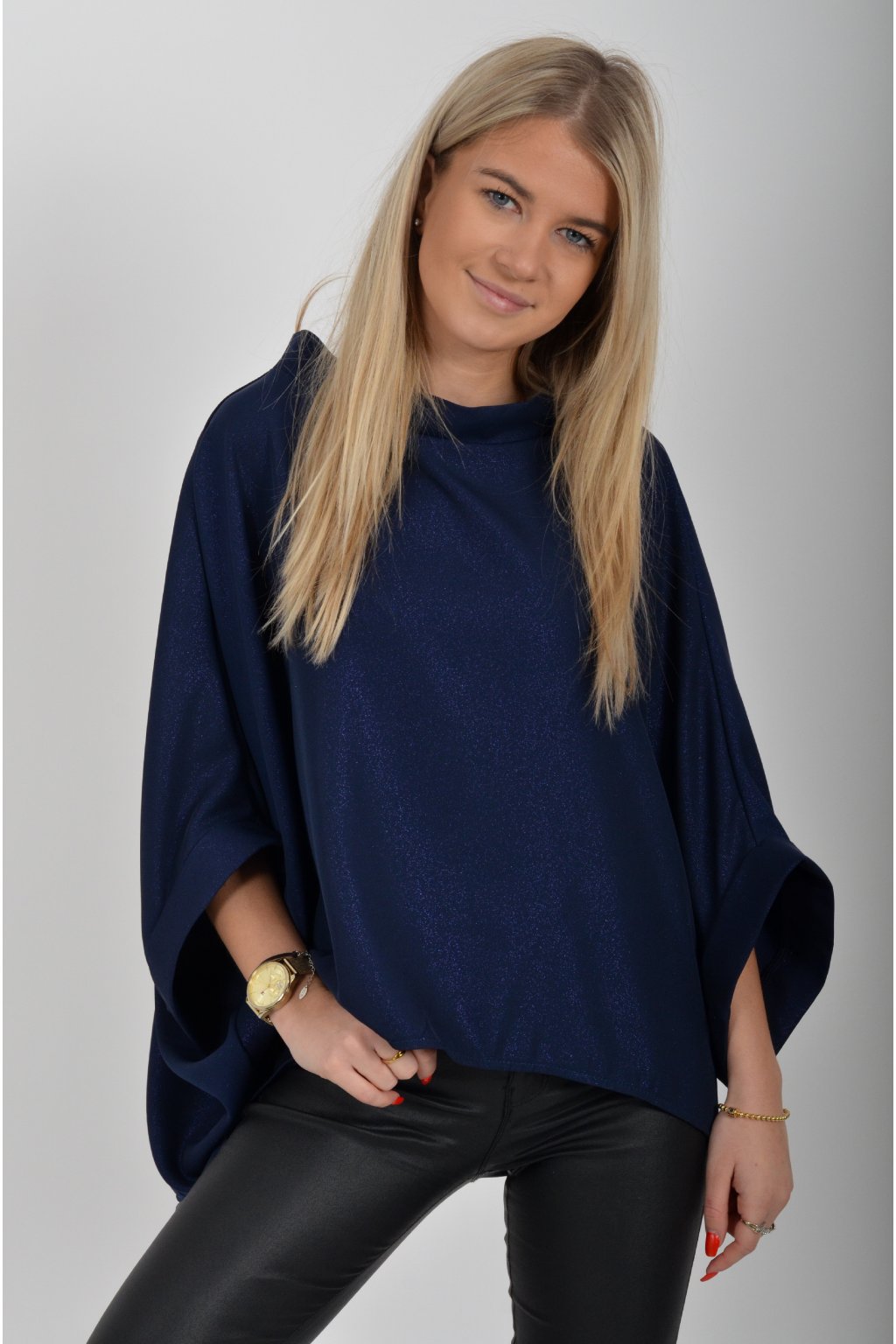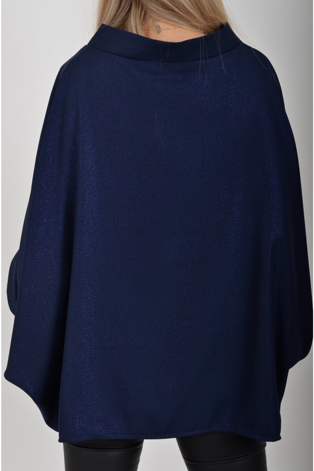 Halenka značky Miss City Official s netopýřím rukávem vhodná jak pro společenské události, tak i volnočasové nošení. Je vyrobena z velice příjemného a pevného materiálu. Materiál má lehce lesklý efekt podobný lurexu. Přední část halenky je kratší než zadní. Halenka je volnějšího nadčasového střihu.