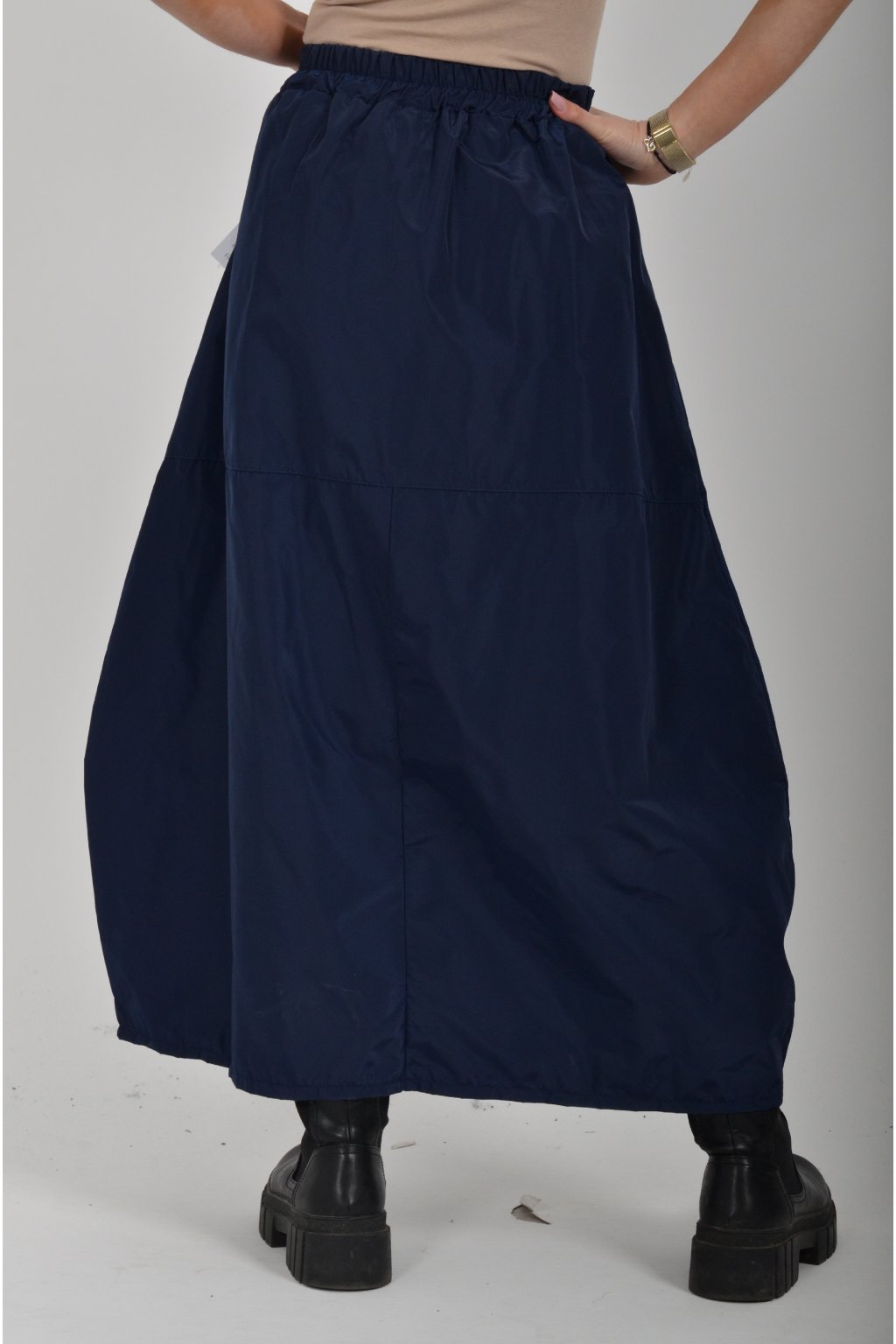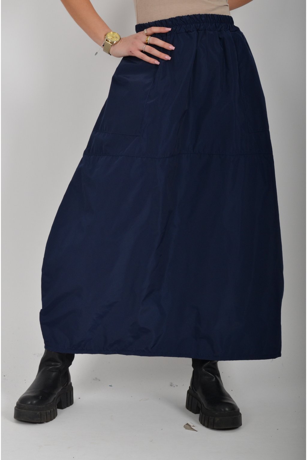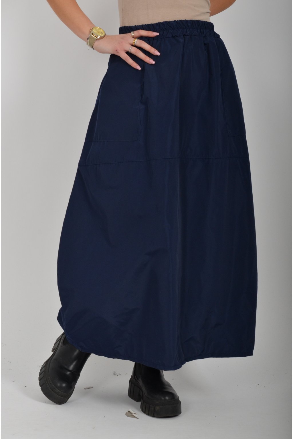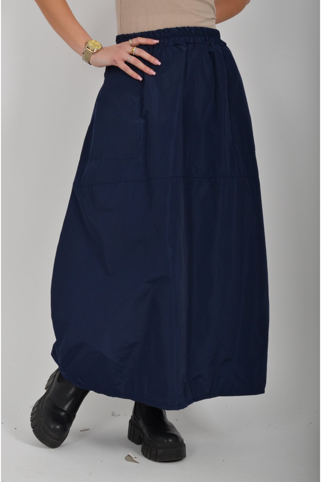 Šusťáková sukně balónového střihu s kapsami na bocích. V pase má sukně zapracovanou gumu.