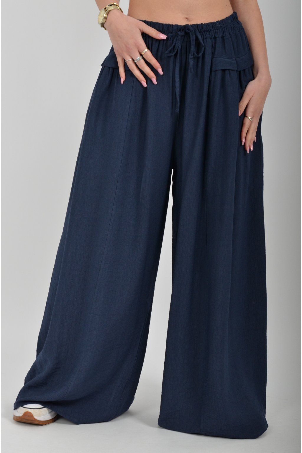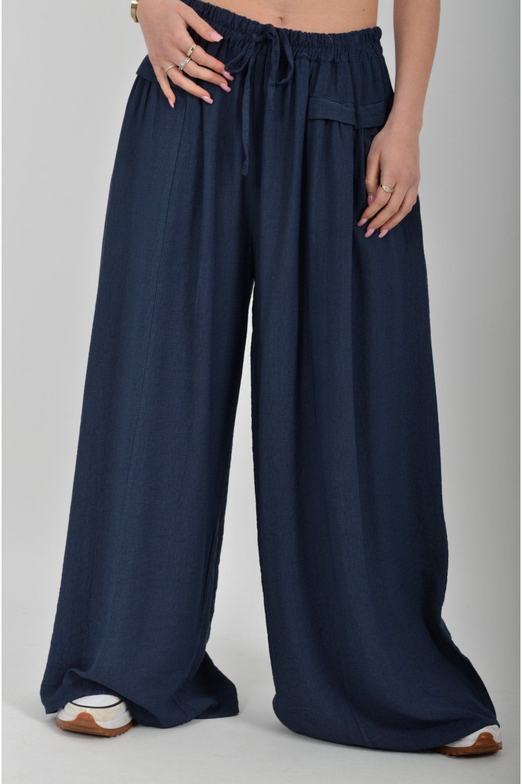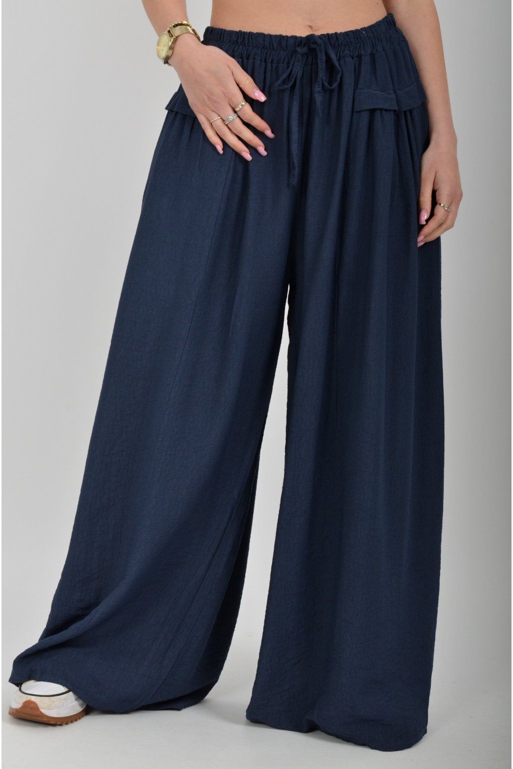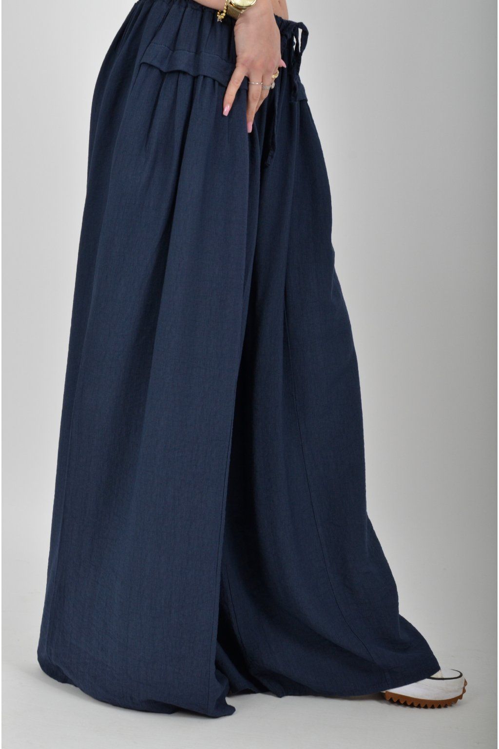 Kalhoty se širokými nohavicemi a kapsami na bocích, které se krásně přizpůsobí postavě, díky zapracované gumě v pase. Jsou vhodné pro každodenní nošení. Šňůrka, v přední části je "falešná" (nejde pomocí ní kalhoty stáhnout v pase)