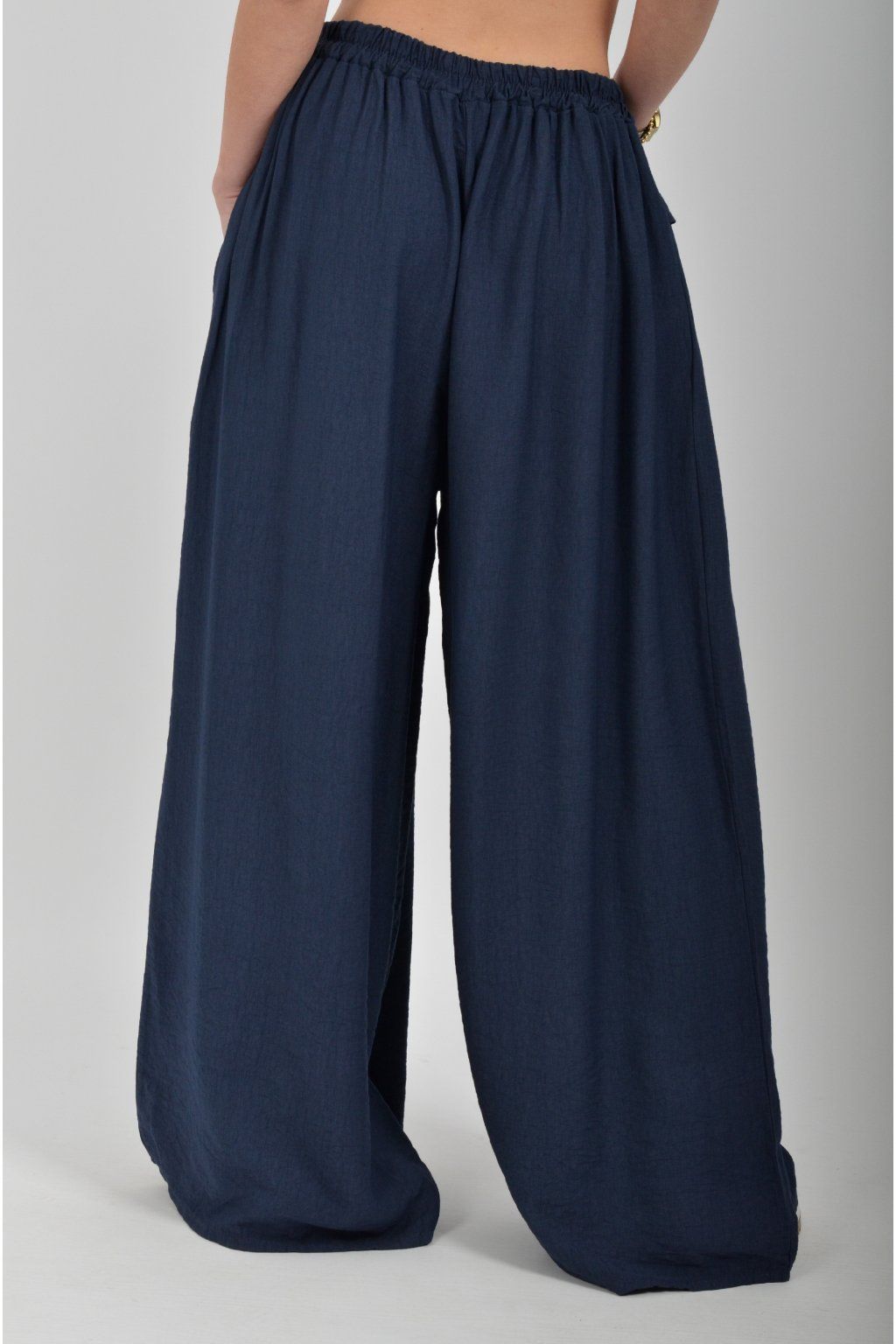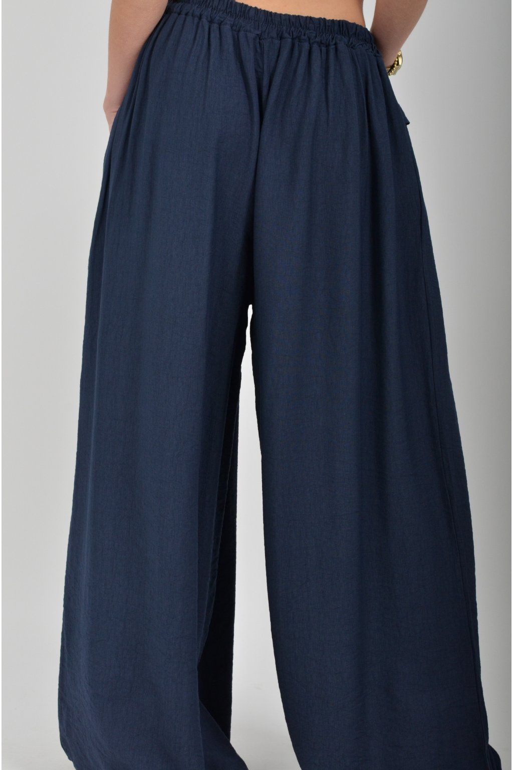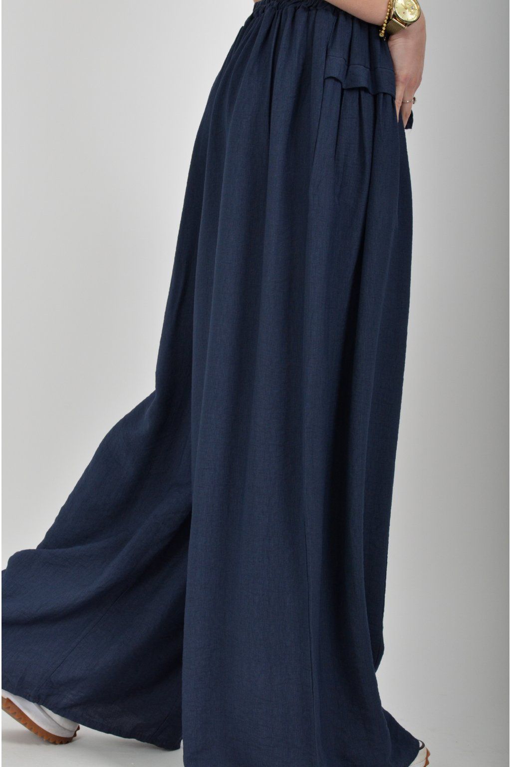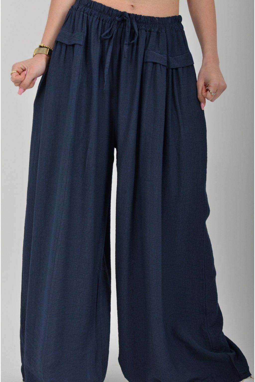 Kalhoty se širokými nohavicemi a kapsami na bocích, které se krásně přizpůsobí postavě, díky zapracované gumě v pase. Jsou vhodné pro každodenní nošení. Šňůrka, v přední části je "falešná" (nejde pomocí ní kalhoty stáhnout v pase)