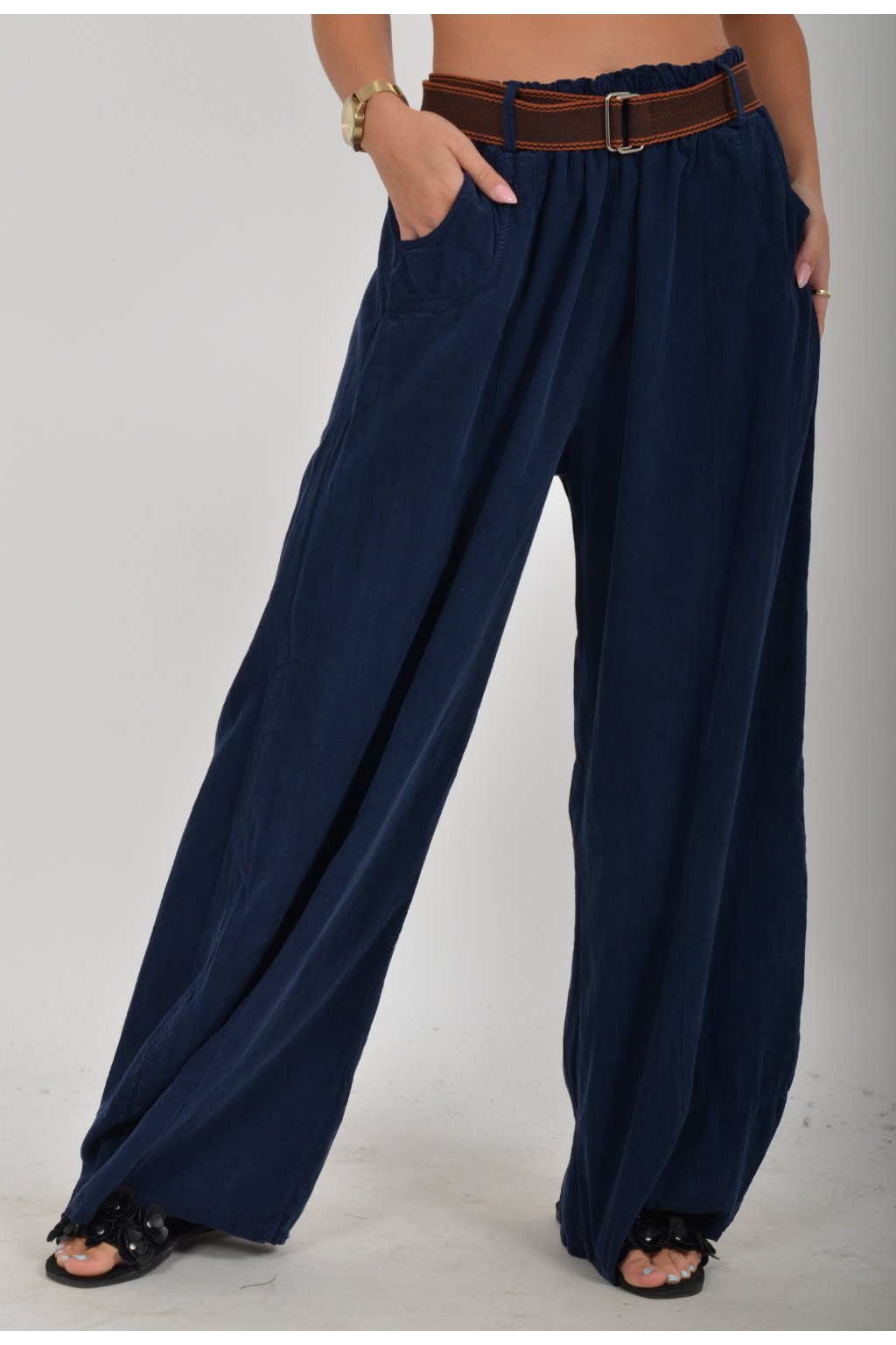 Pohodlné manšestrové kalhoty s kapsami na bocích. V pase mají zapracovanou gumu, součástí kalhot je pásek pro libovolné stažení. Kalhoty jsou z velice příjemného materiálu a jsou vhodné pro každodenní nošení.