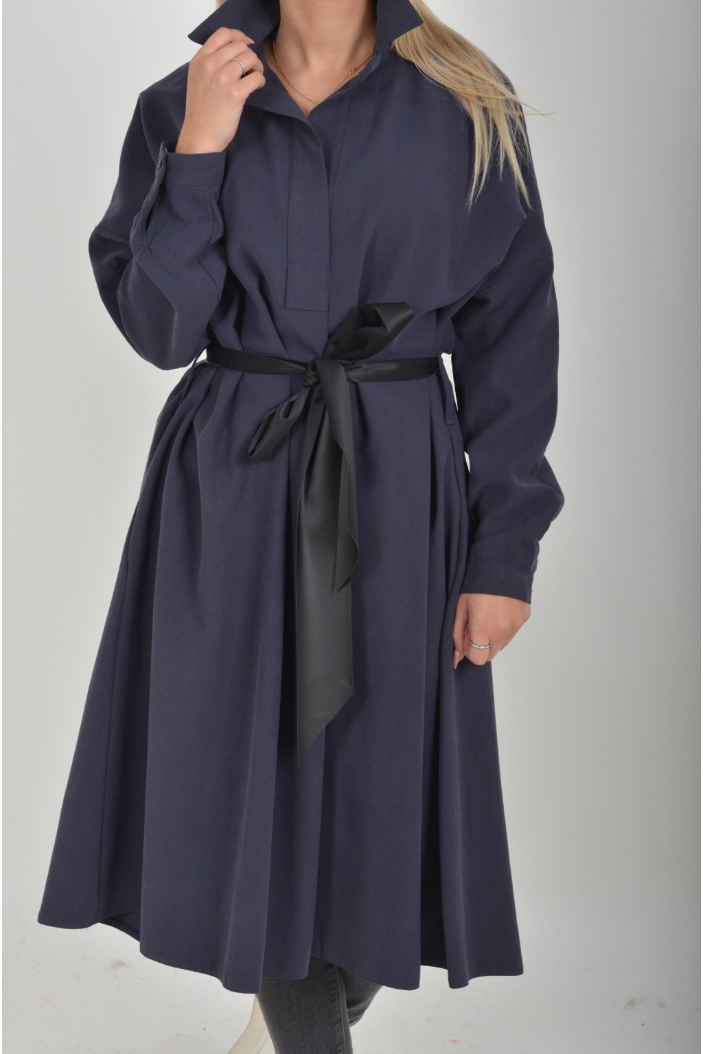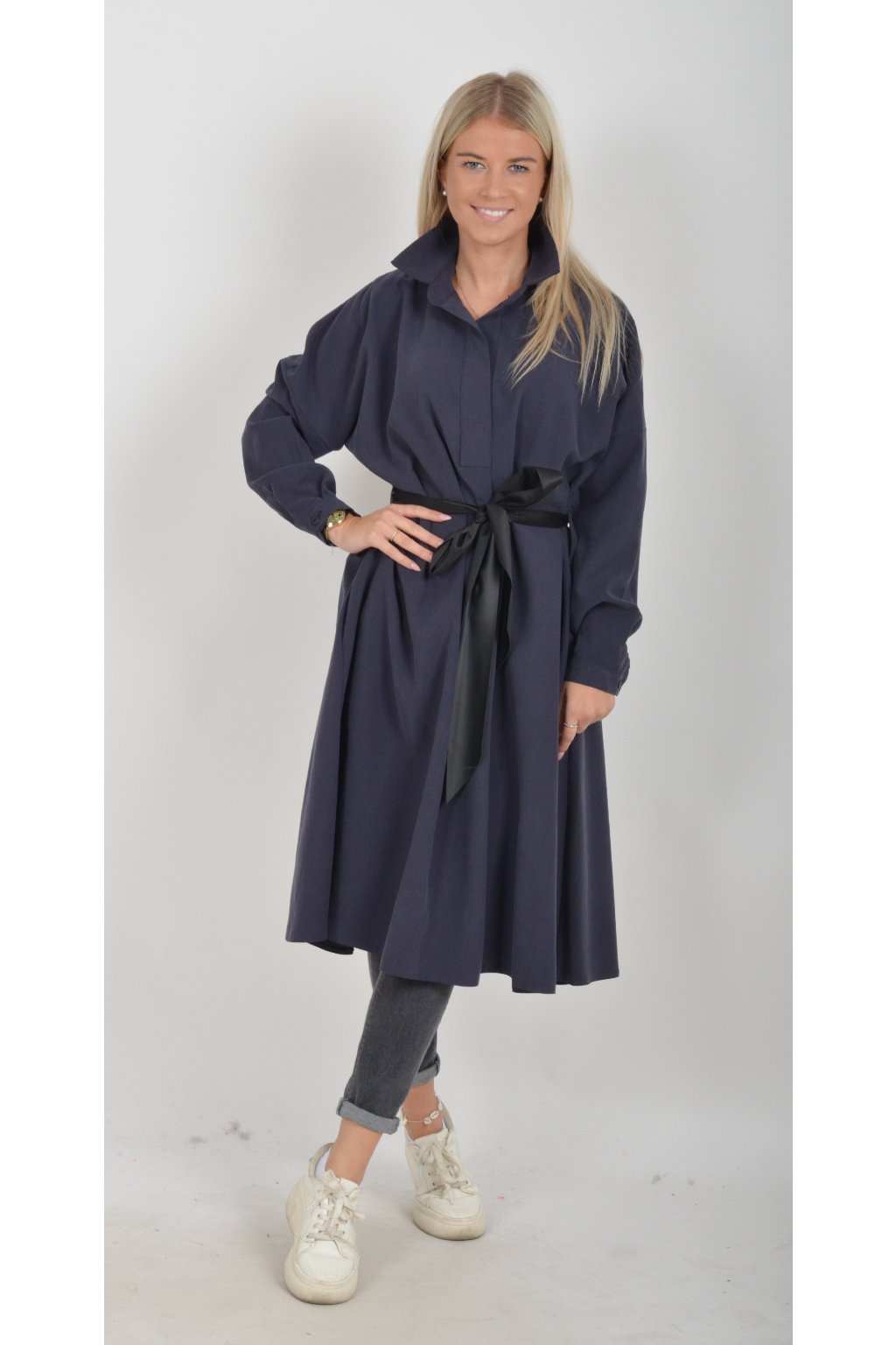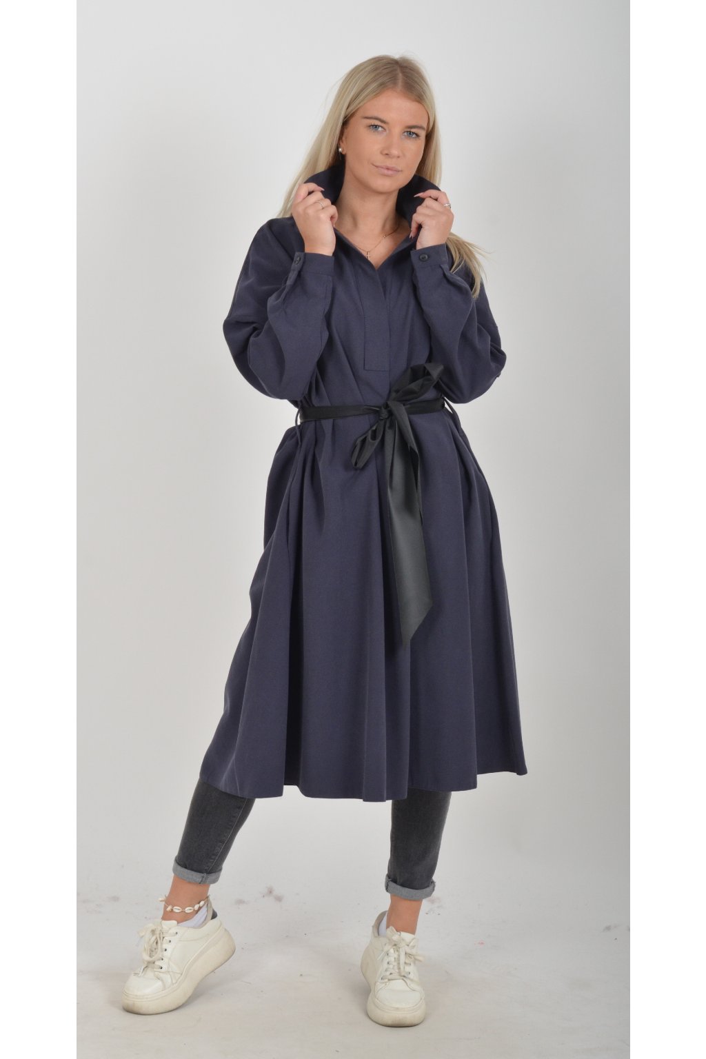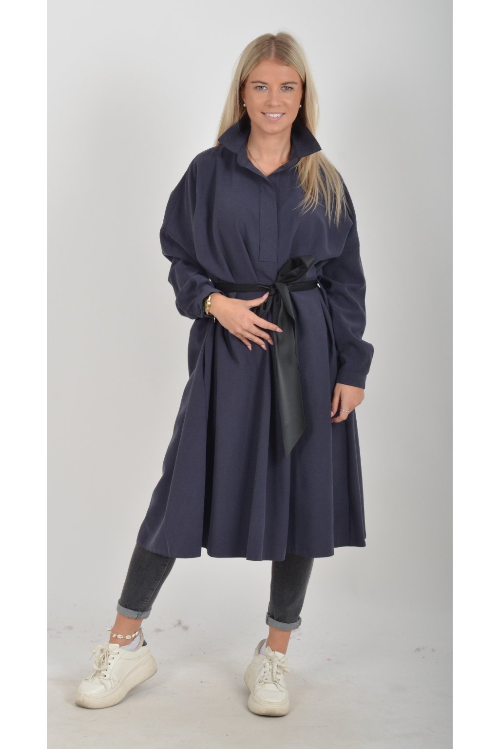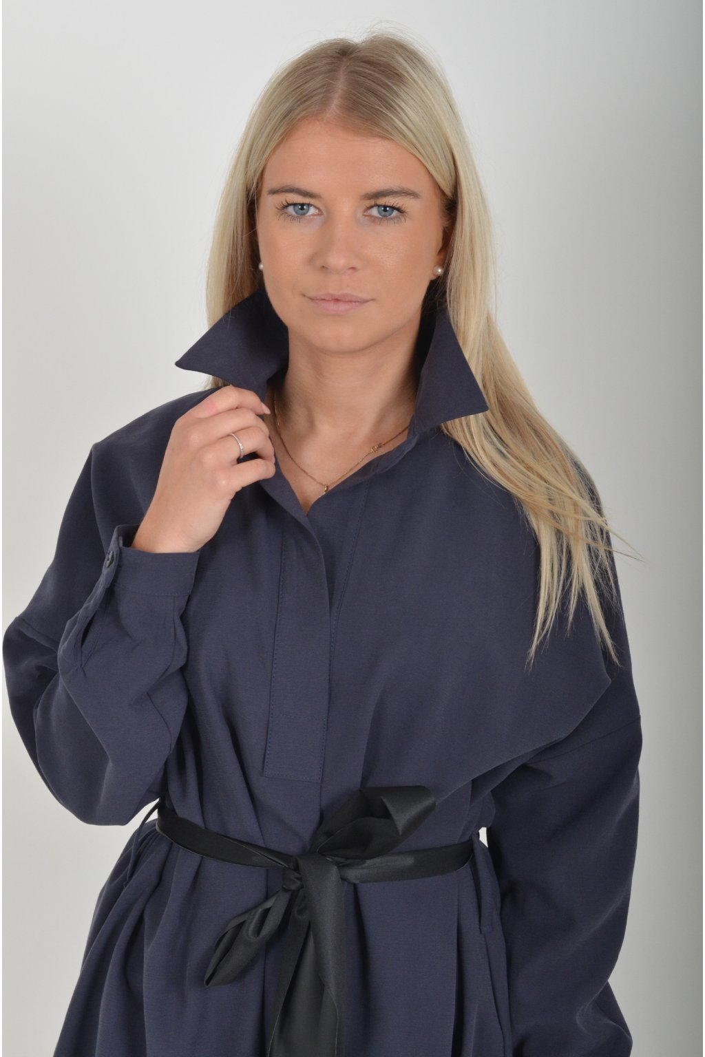 Jednou za dámu, jednou jen tak ven, tyto šaty splní oboje. Mají košilový áčkový střih s rozevlátou sukní, která je v zadní části mírně delší. Šaty mají na bocích kapsy. Rukávy jsou dlouhé, ale dají se zkrátit na knoflíček. Výrazným doplňkem šatů je pásek s imitací kůže, který můžete jakkoliv vázat a kombinovat. K šatům doporučujeme ozdobnou brož nebo šperky z naší kolekce.