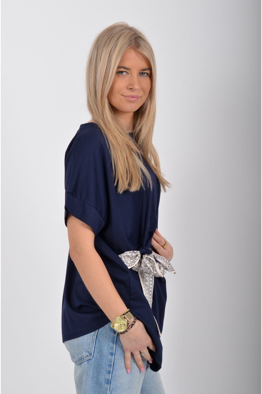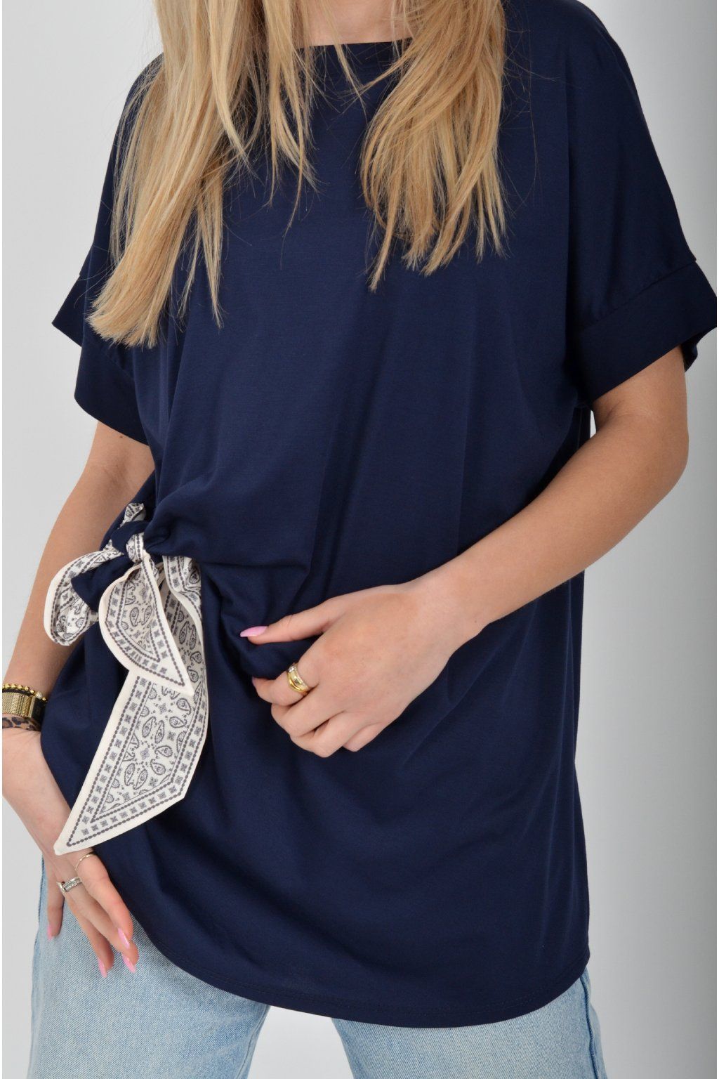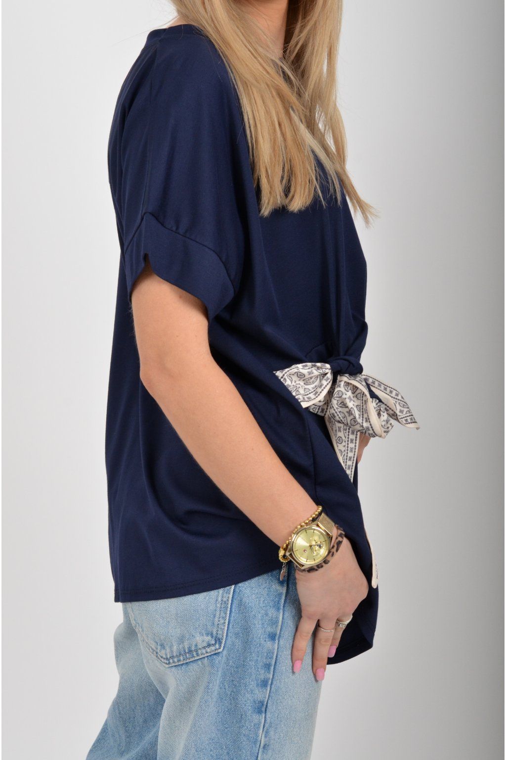 Tričko s krátkým rukávem a vázáním na boku vyrobené z velice příjemného a elastické materiálu. Je ideální pro každodenní nošení.