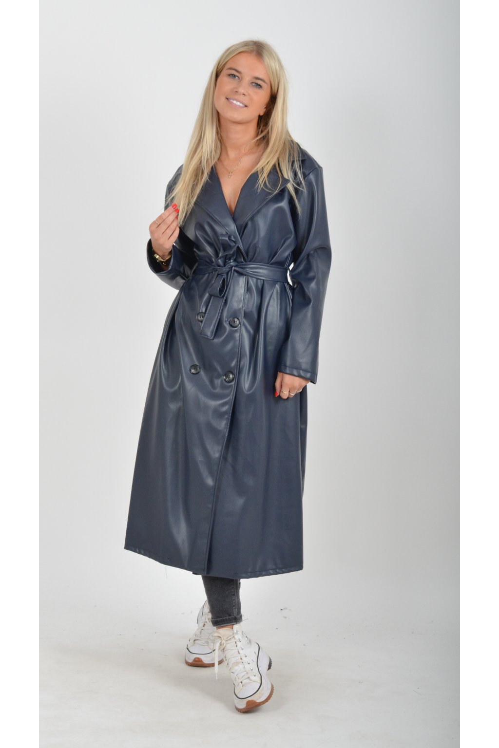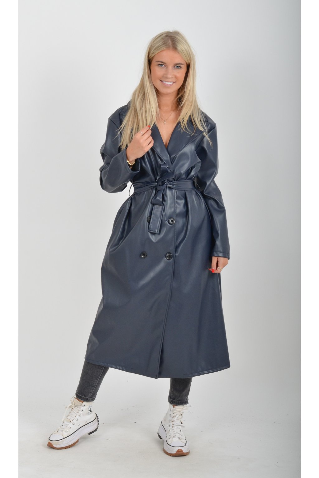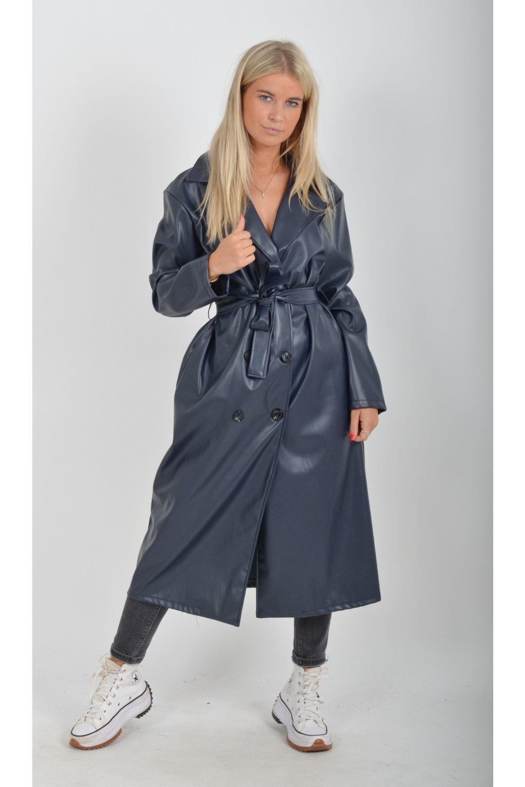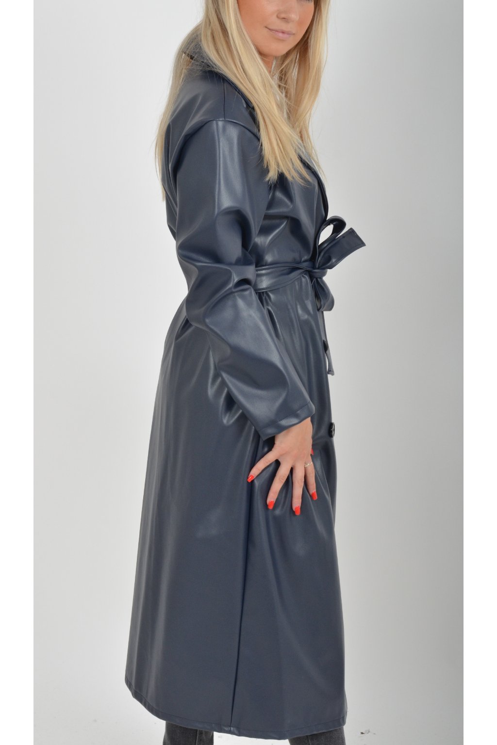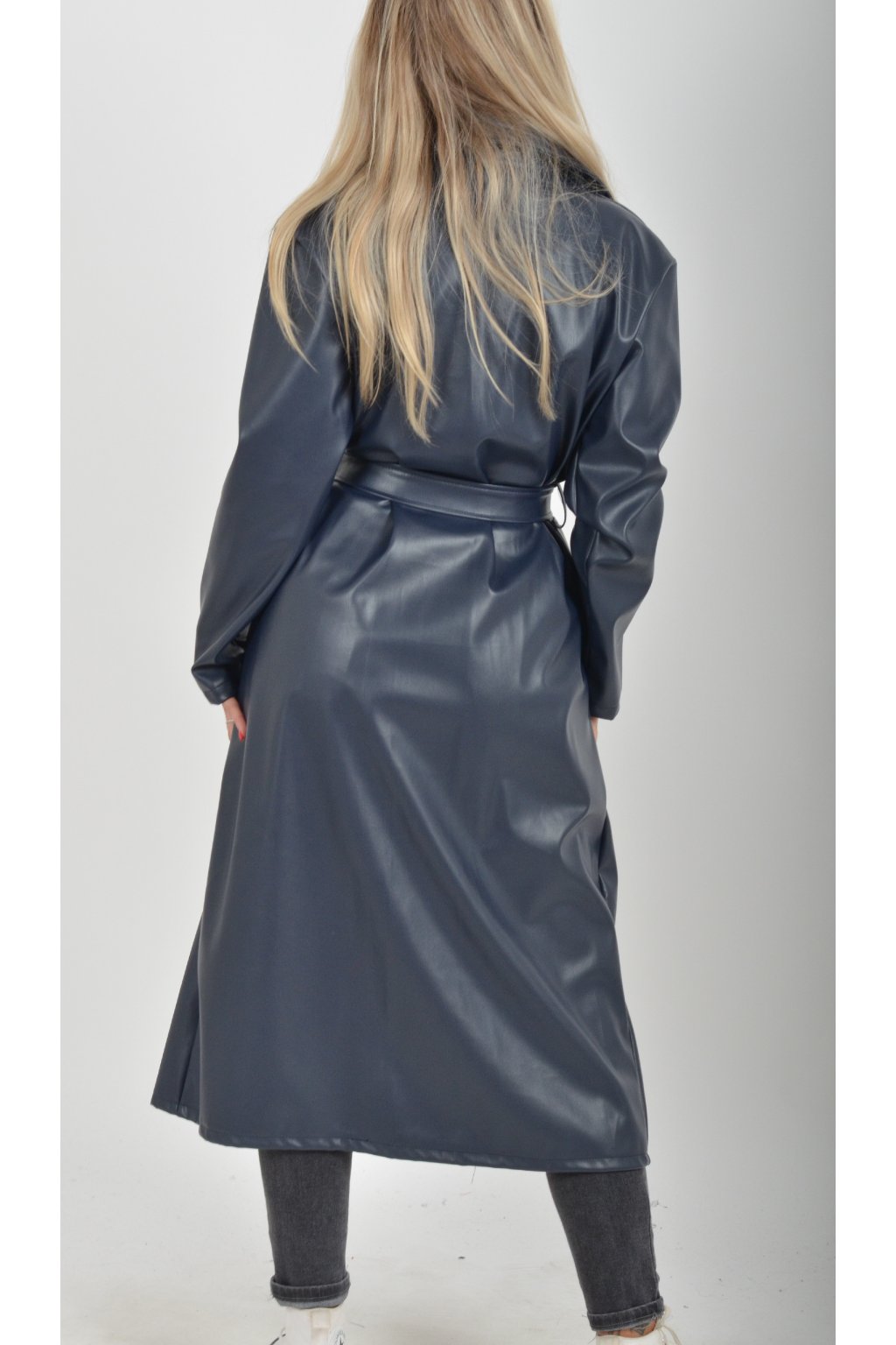 Elegantní dámský kabát s klasickým prodlouženým střihem. V pase má koženkový pásek pro libovolné stažení.