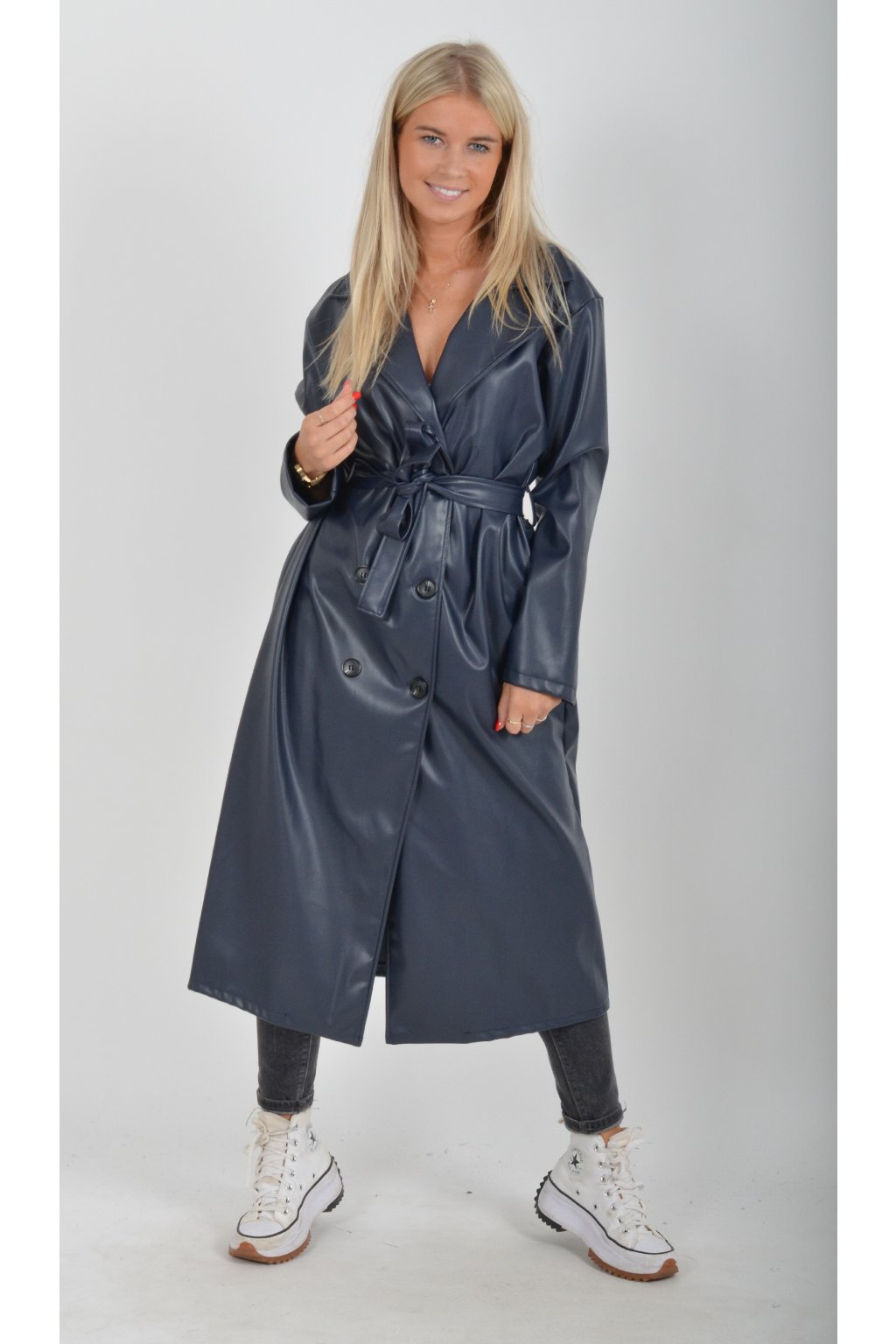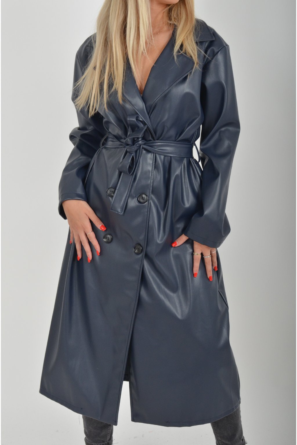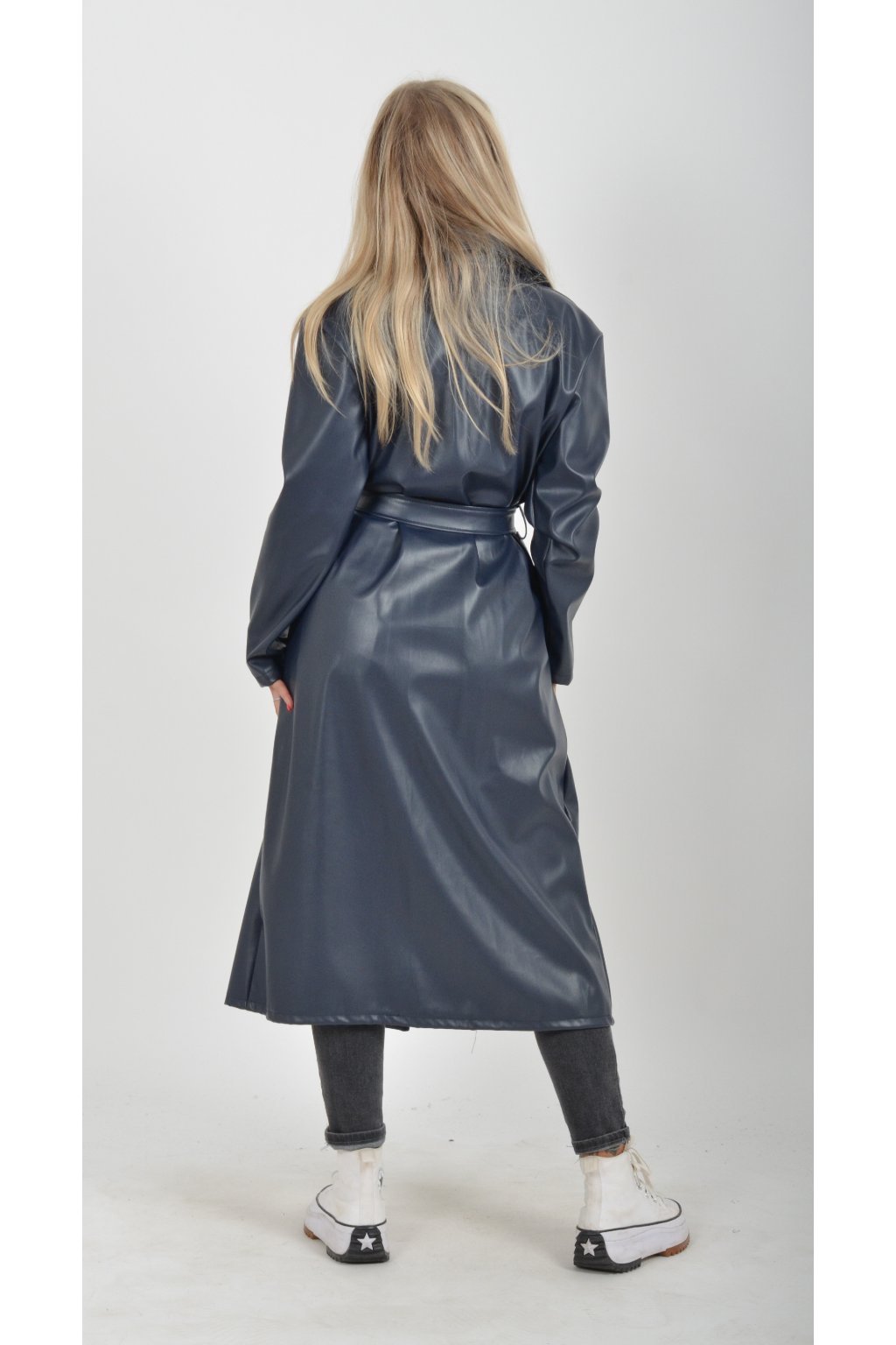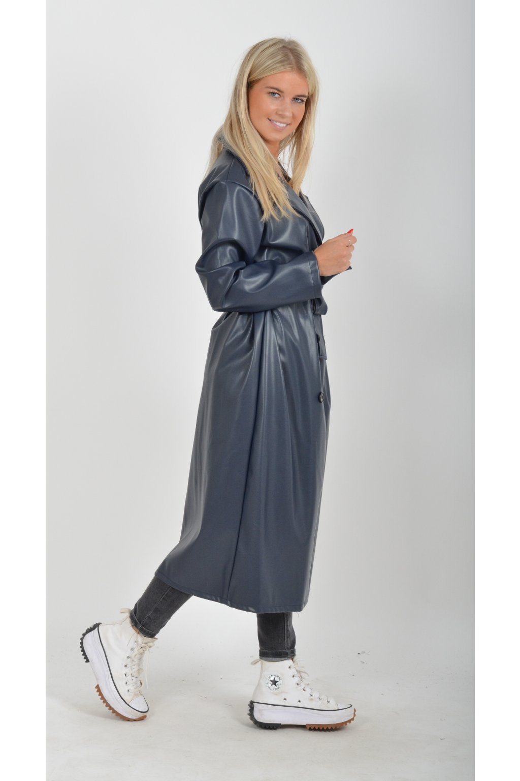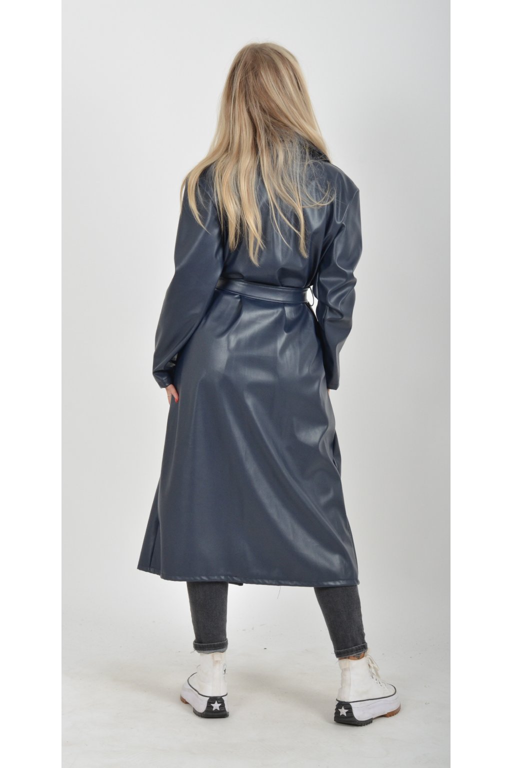 Elegantní dámský kabát s klasickým prodlouženým střihem. V pase má koženkový pásek pro libovolné stažení.