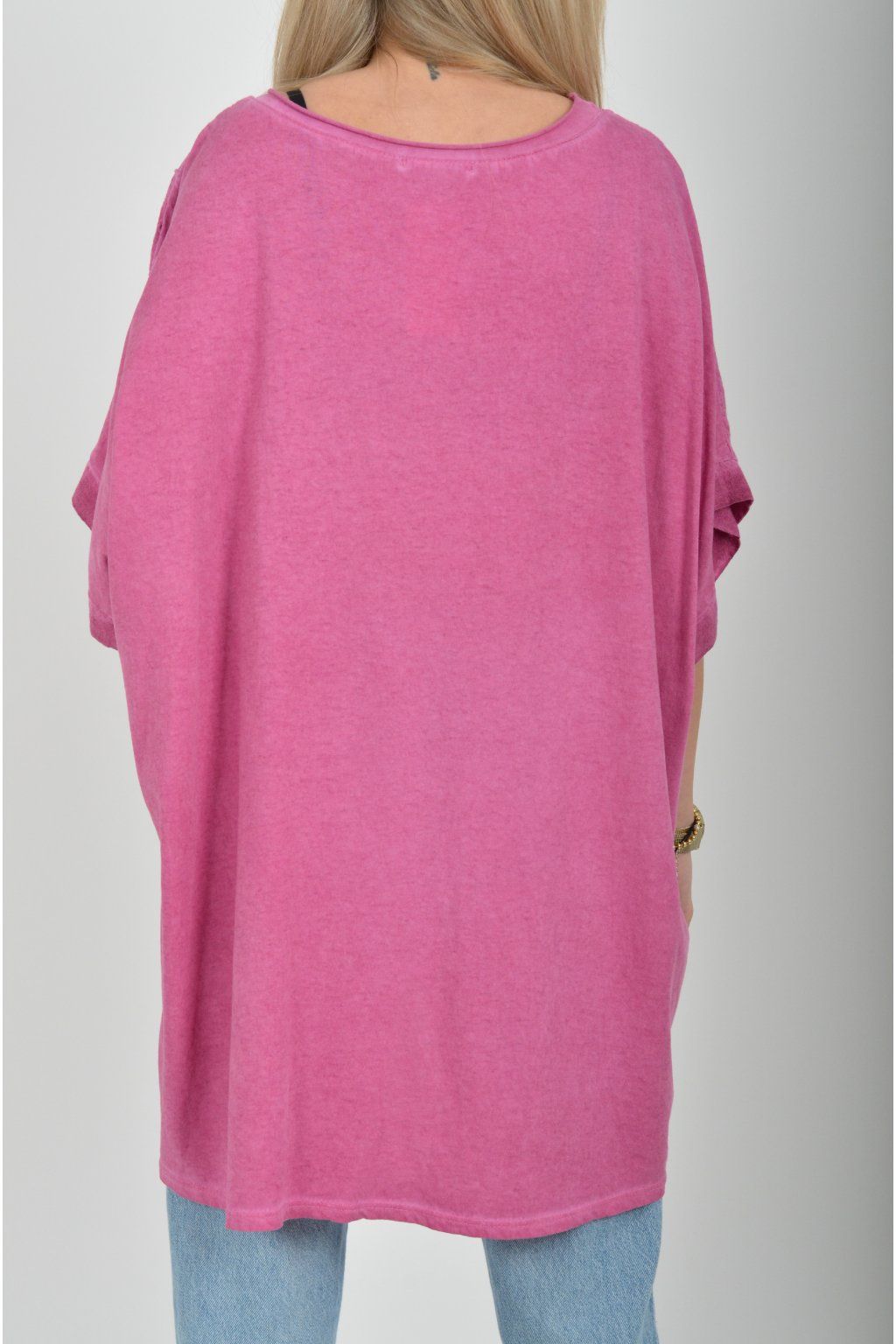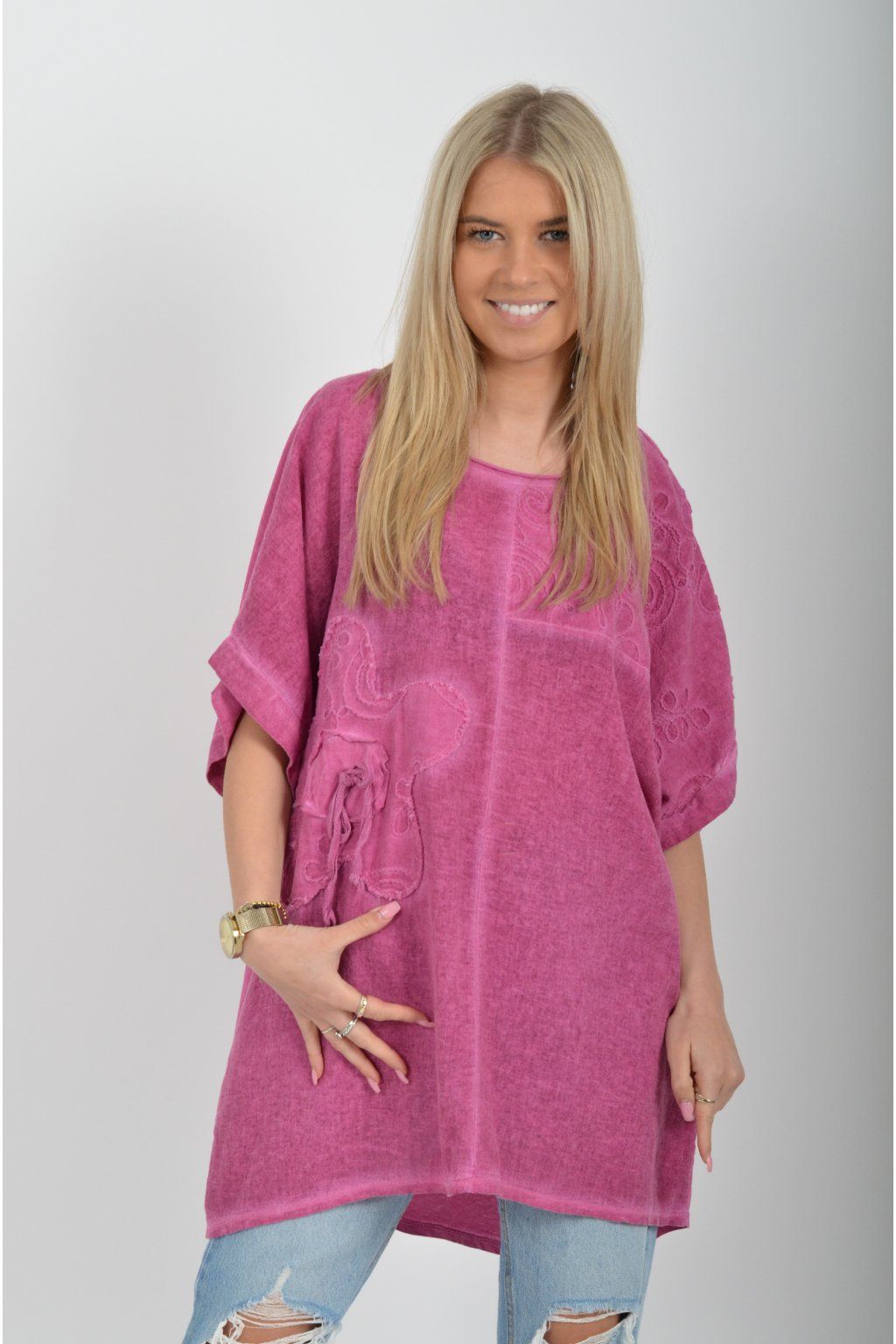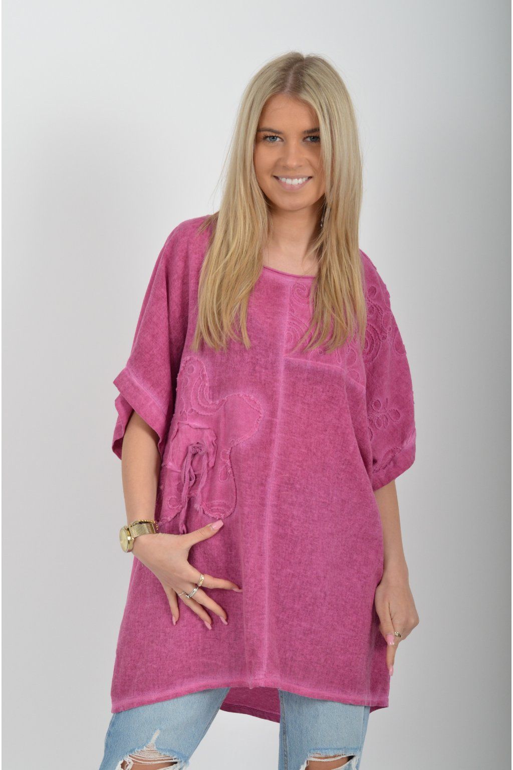 Oversize halenka s krátkým rukávem a vyšívaným vzorem vyrobená z velice příjemné bavlny. Materiál halenky je lehce pružný. Je volnějšího stylu nošení (není na tělo)