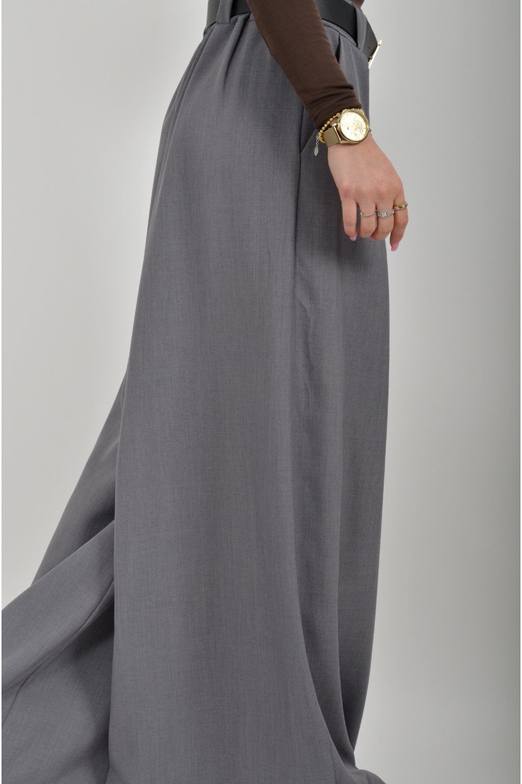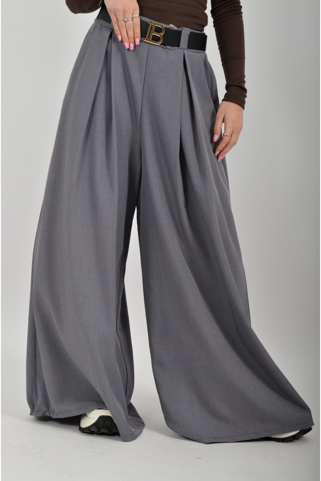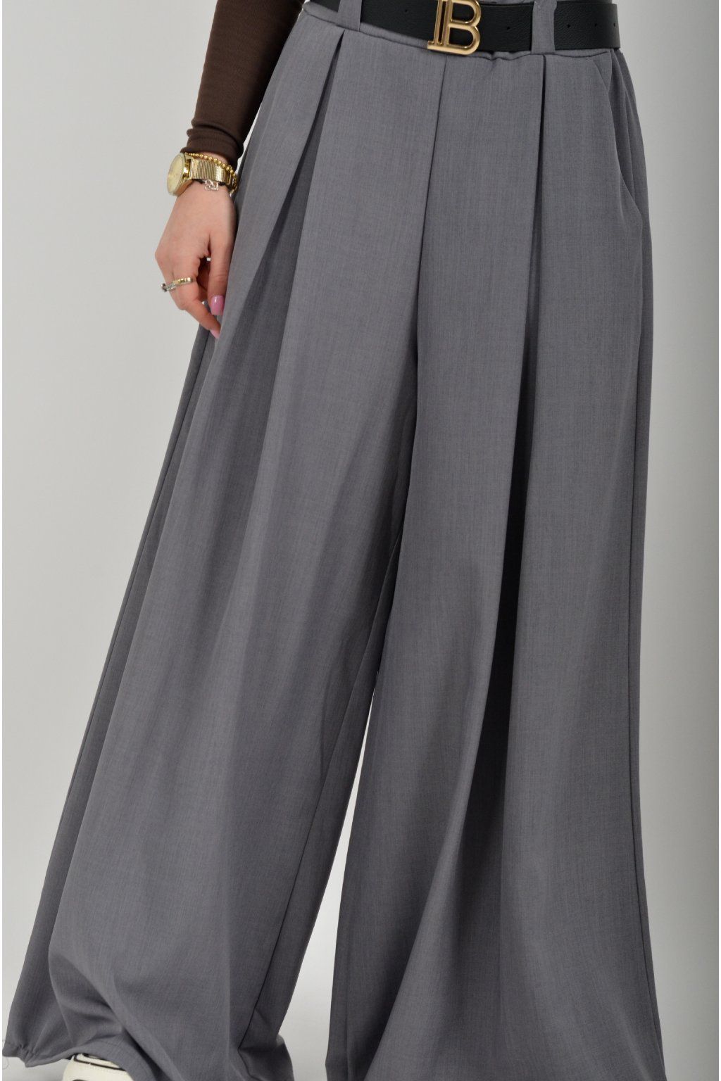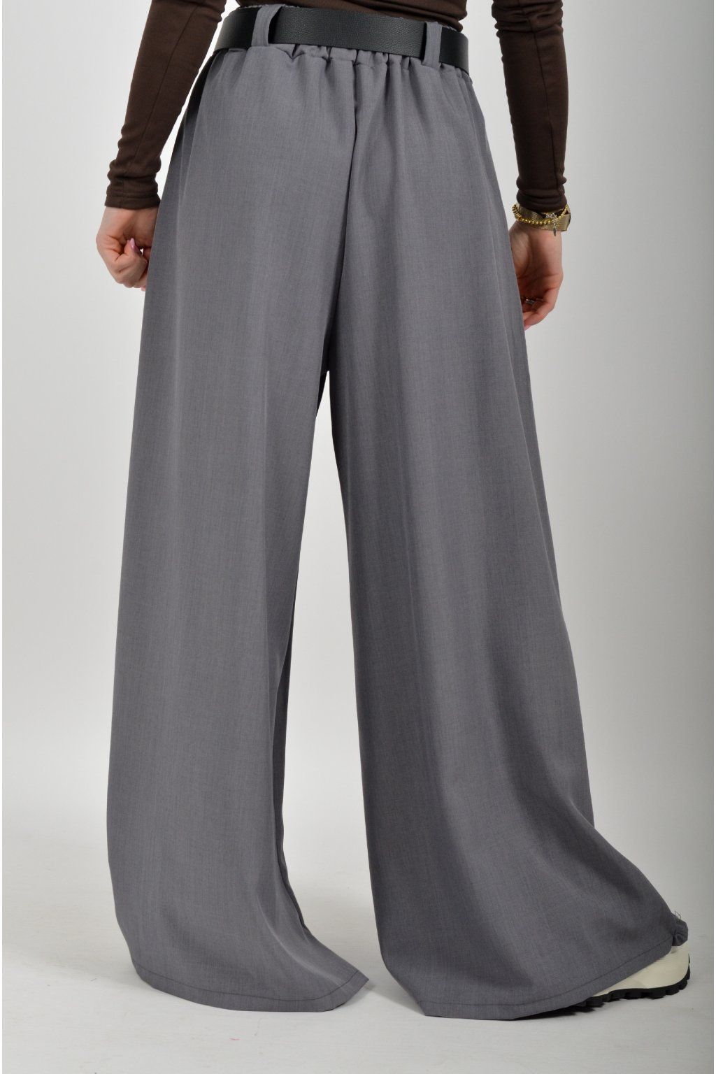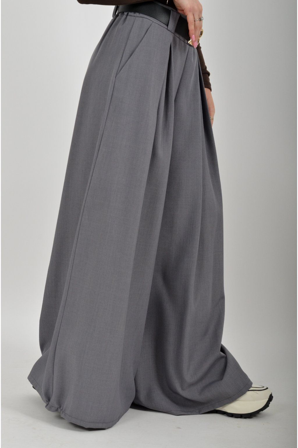 Kalhoty se širokými nohavicemi vyrobené z odlehčeného a velice příjemného materiálu. Materiál kalhot je lehce pružný. V pase mají zapracovanou gumu, na bocích jsou kapsy a jako dárek je pásek, který lze odejmout a použít pro nošení k jiným kouskům.