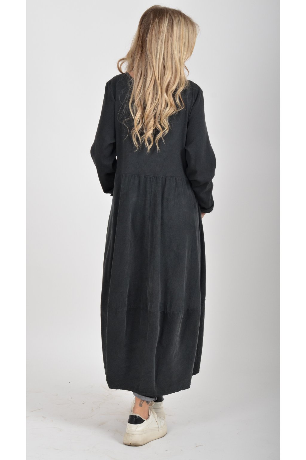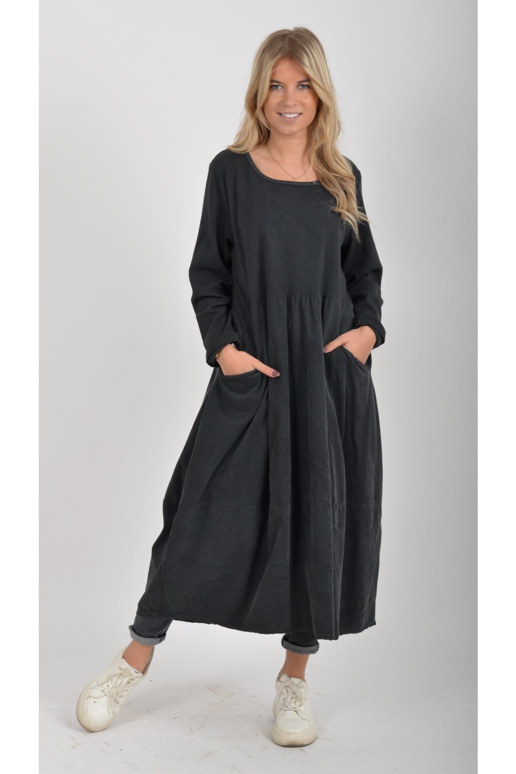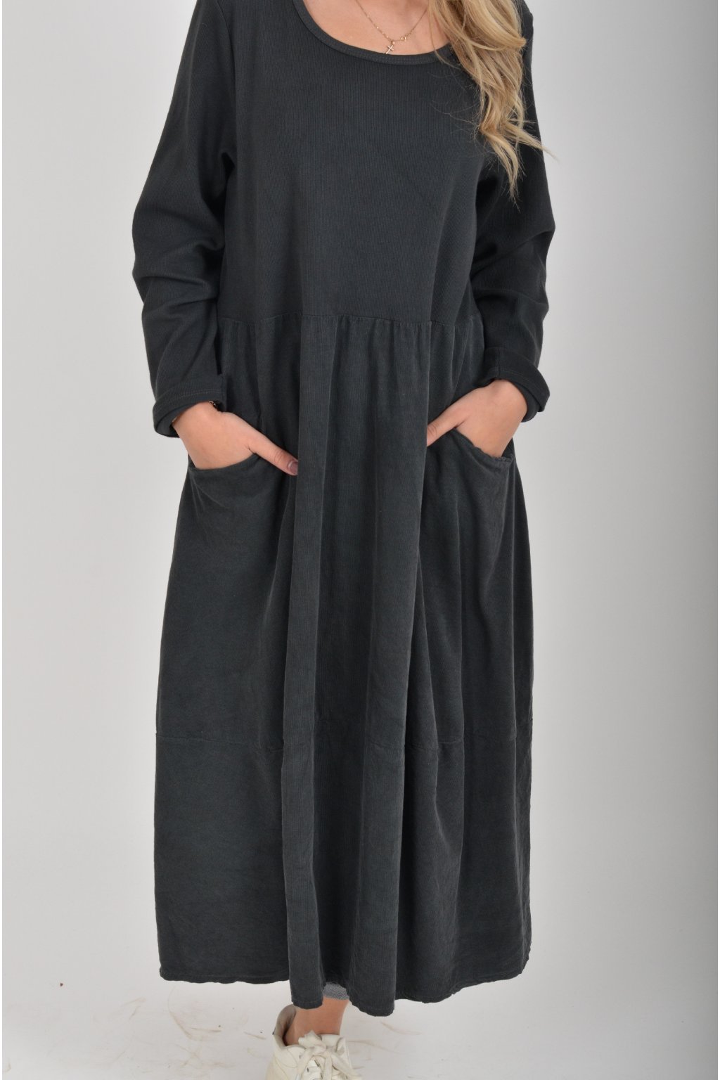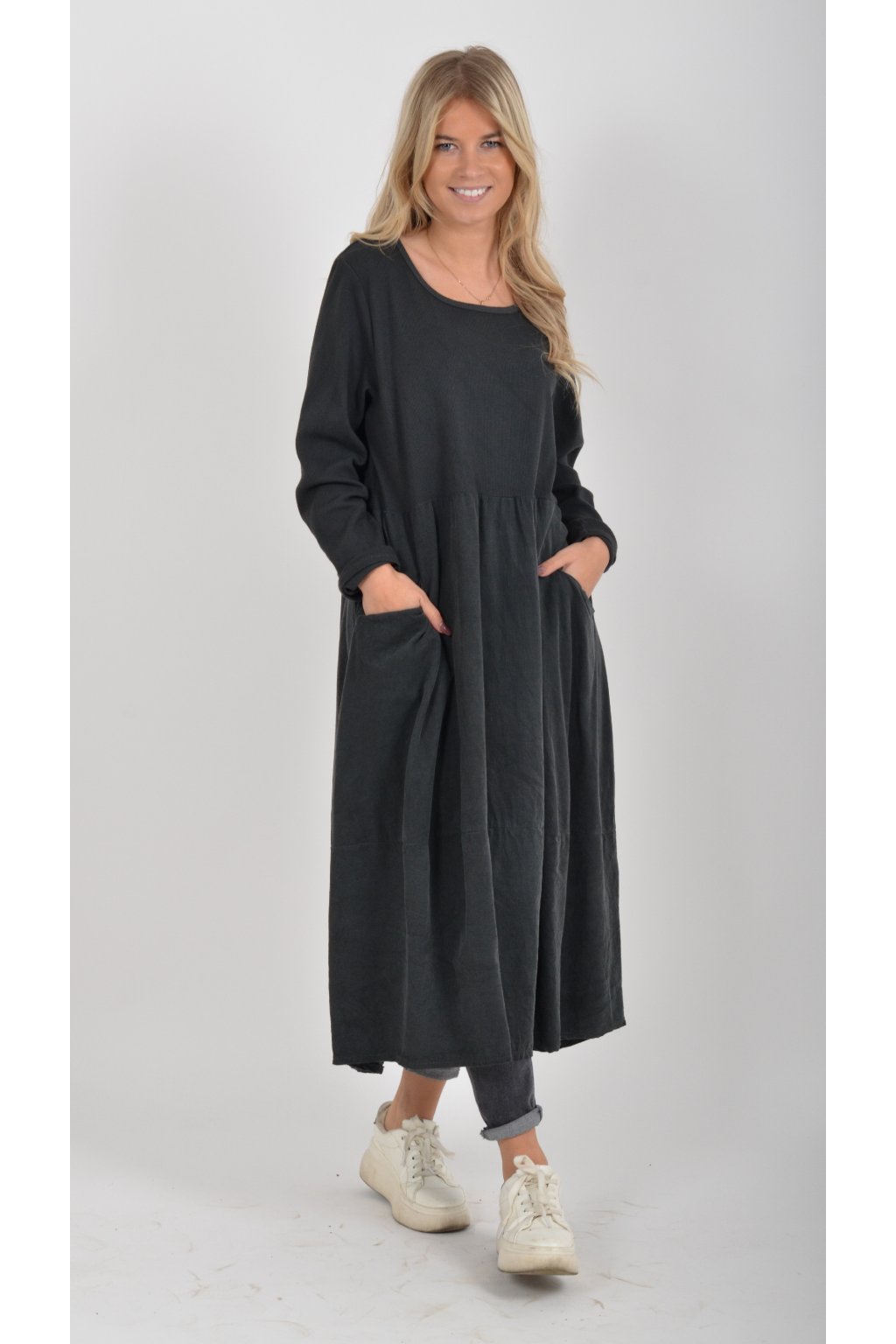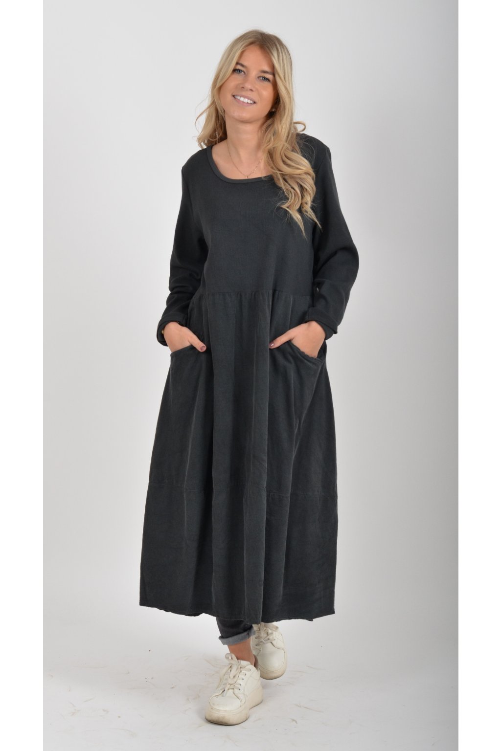 Dlouhé manšestrové šaty áčkového střihu s kapsami v přední části. Šaty jsou z velice příjemného materiál a jsou vhodné do podzimních dní.