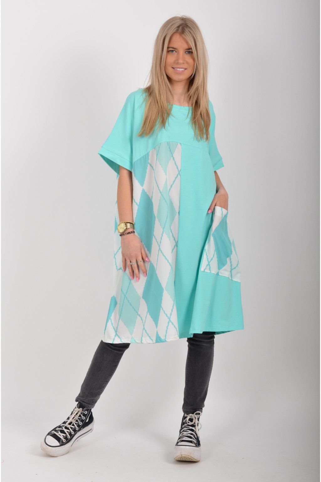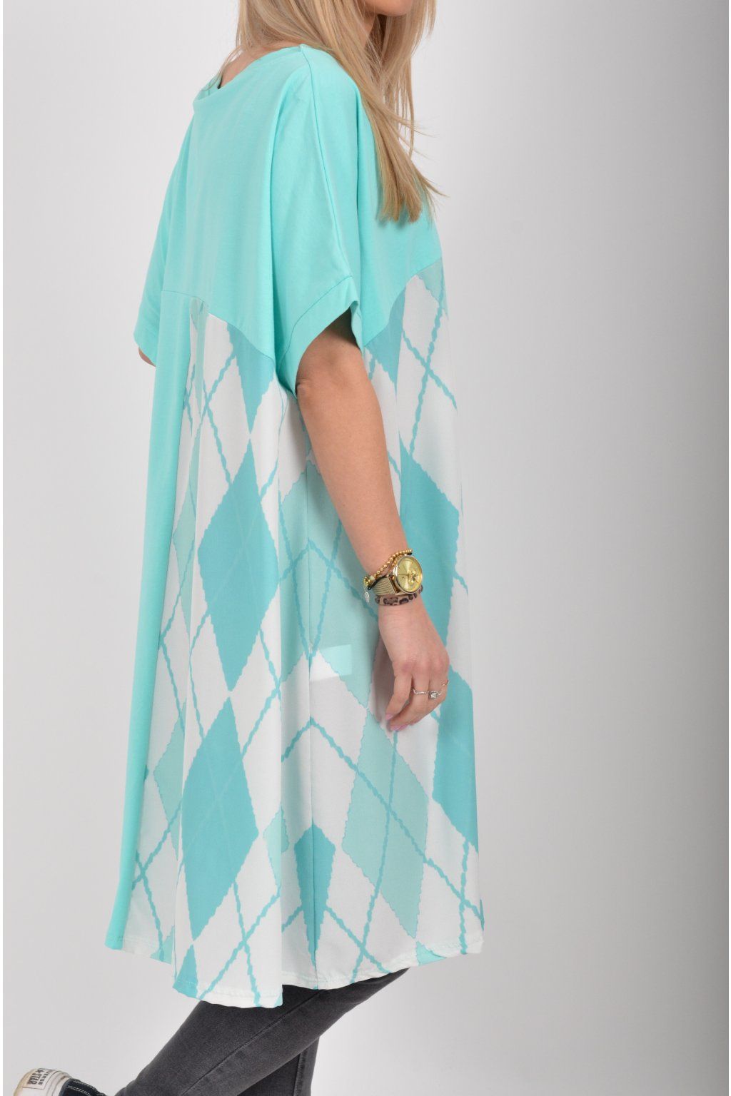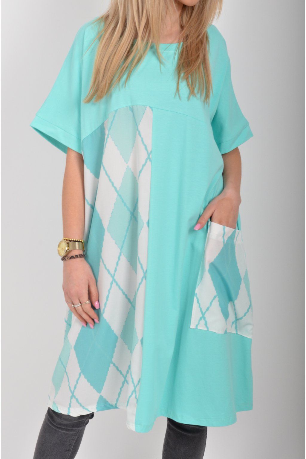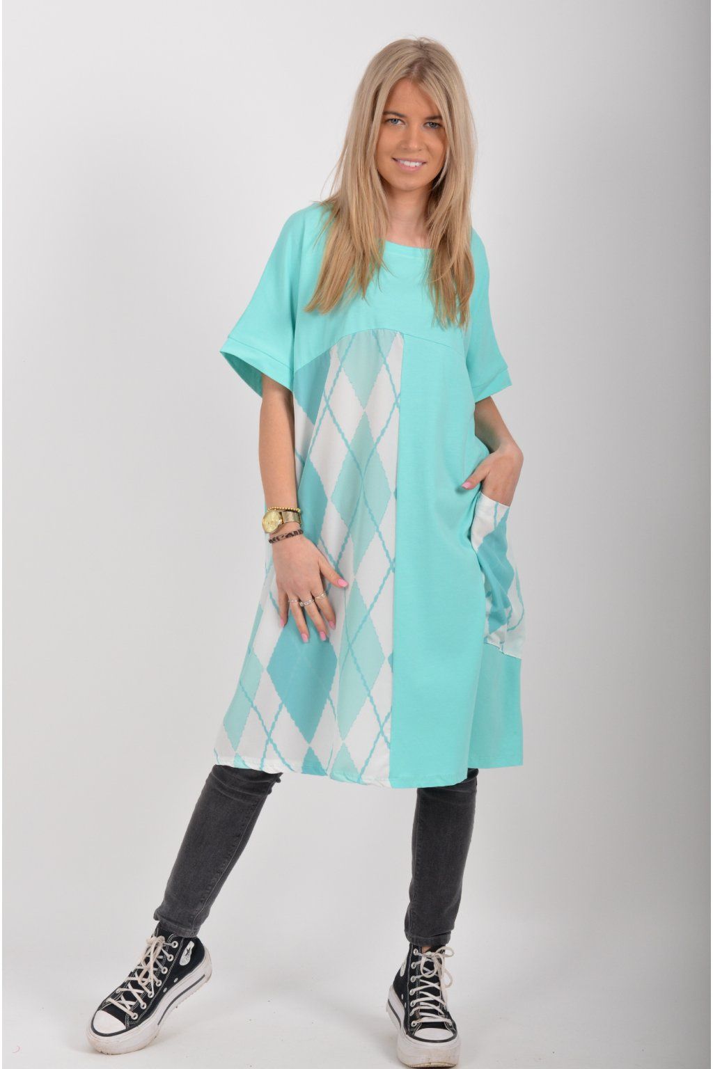 Zajímavé bavlněné šaty se vzorem. Mají áčkový střih a krátký rukáv. Jsou vyrobené z velice příjemného a elastického materiálu.