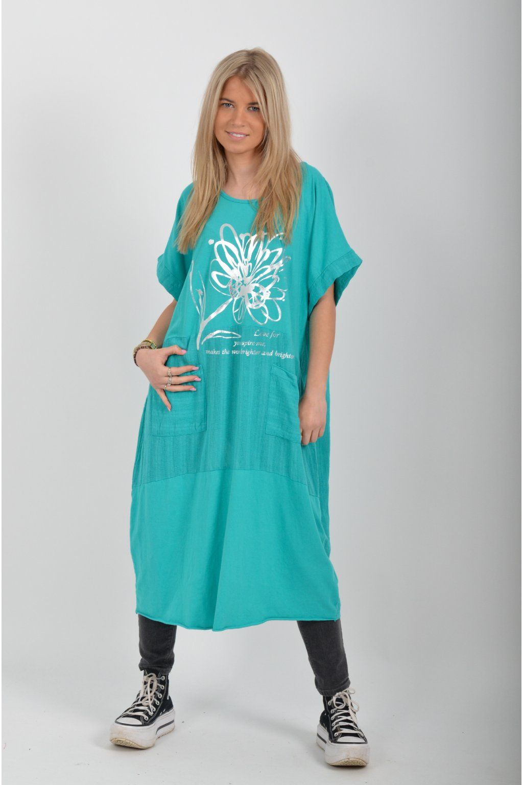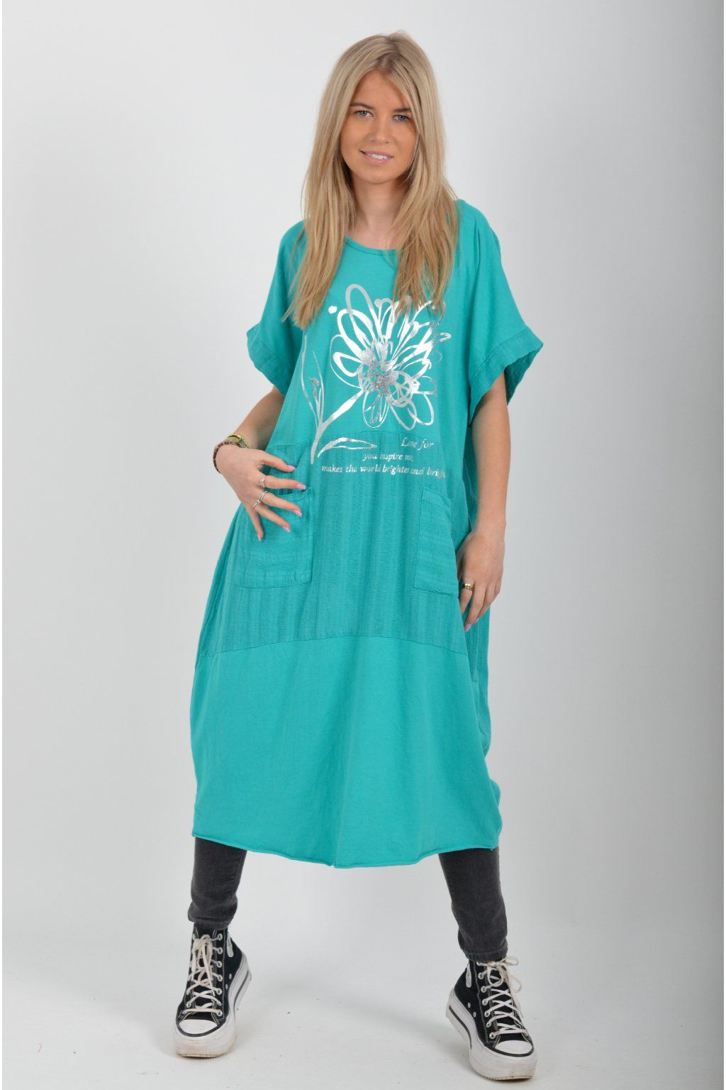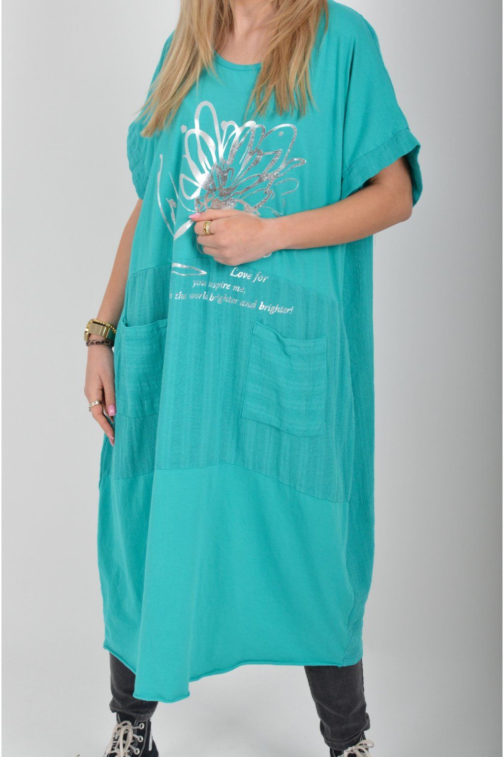Zajímavé bavlněné šaty se stříbrným potiskem a kapsami v přední části.. Mají balónový střih a krátké rukávy. Jsou vyrobené z velice příjemného a pružného materiálu.