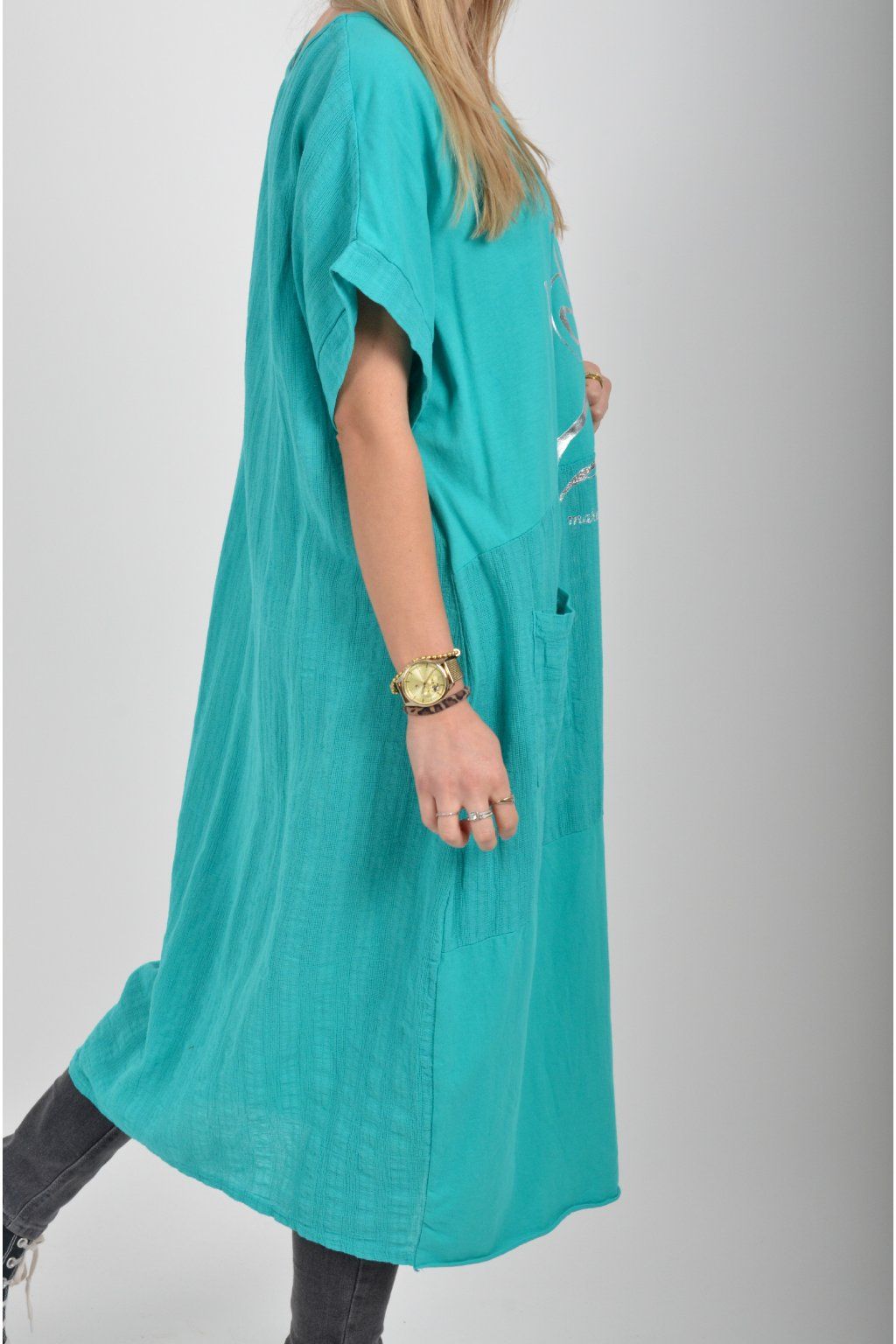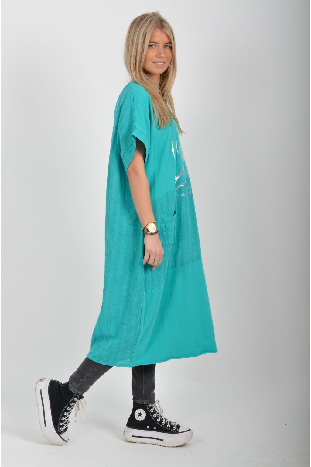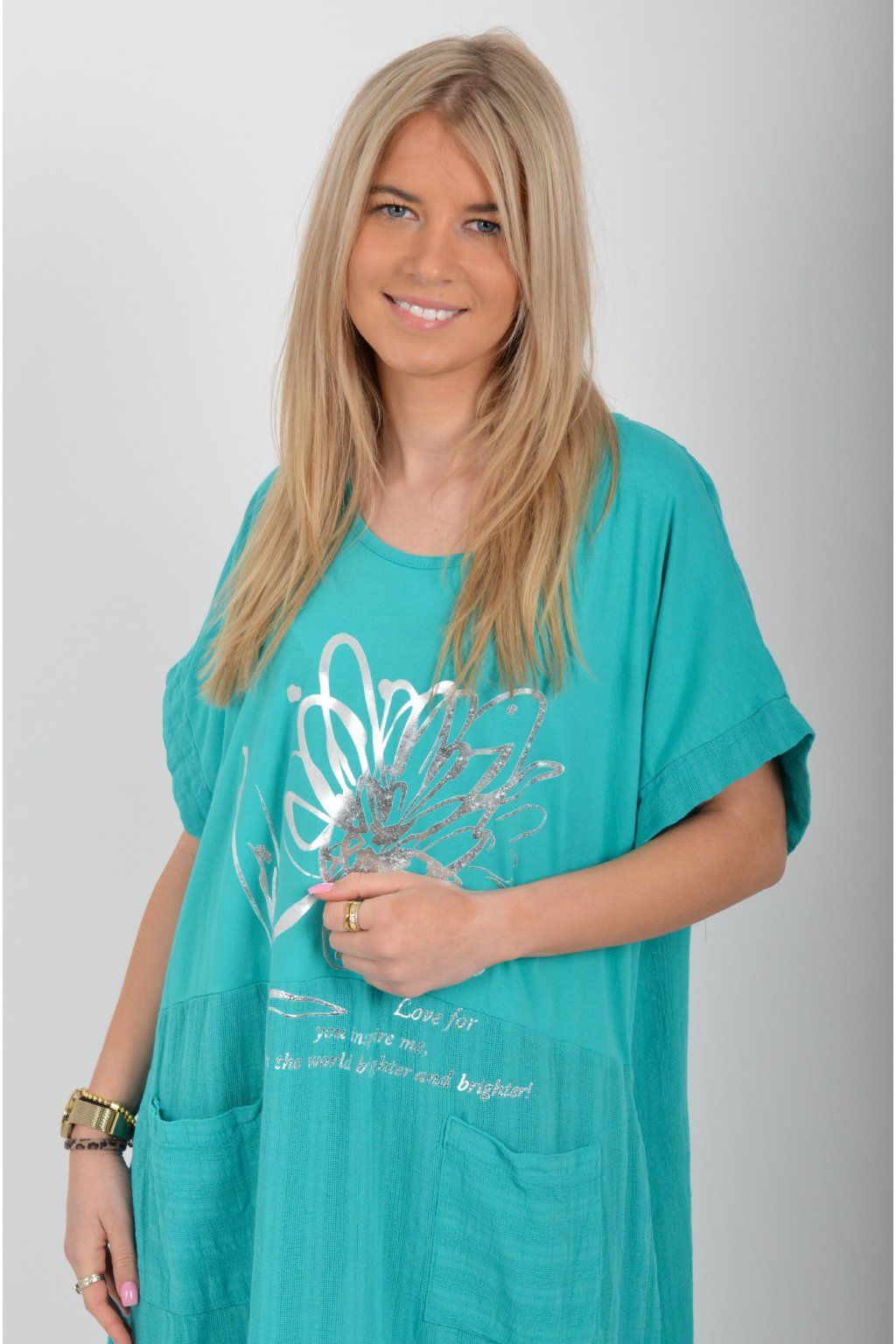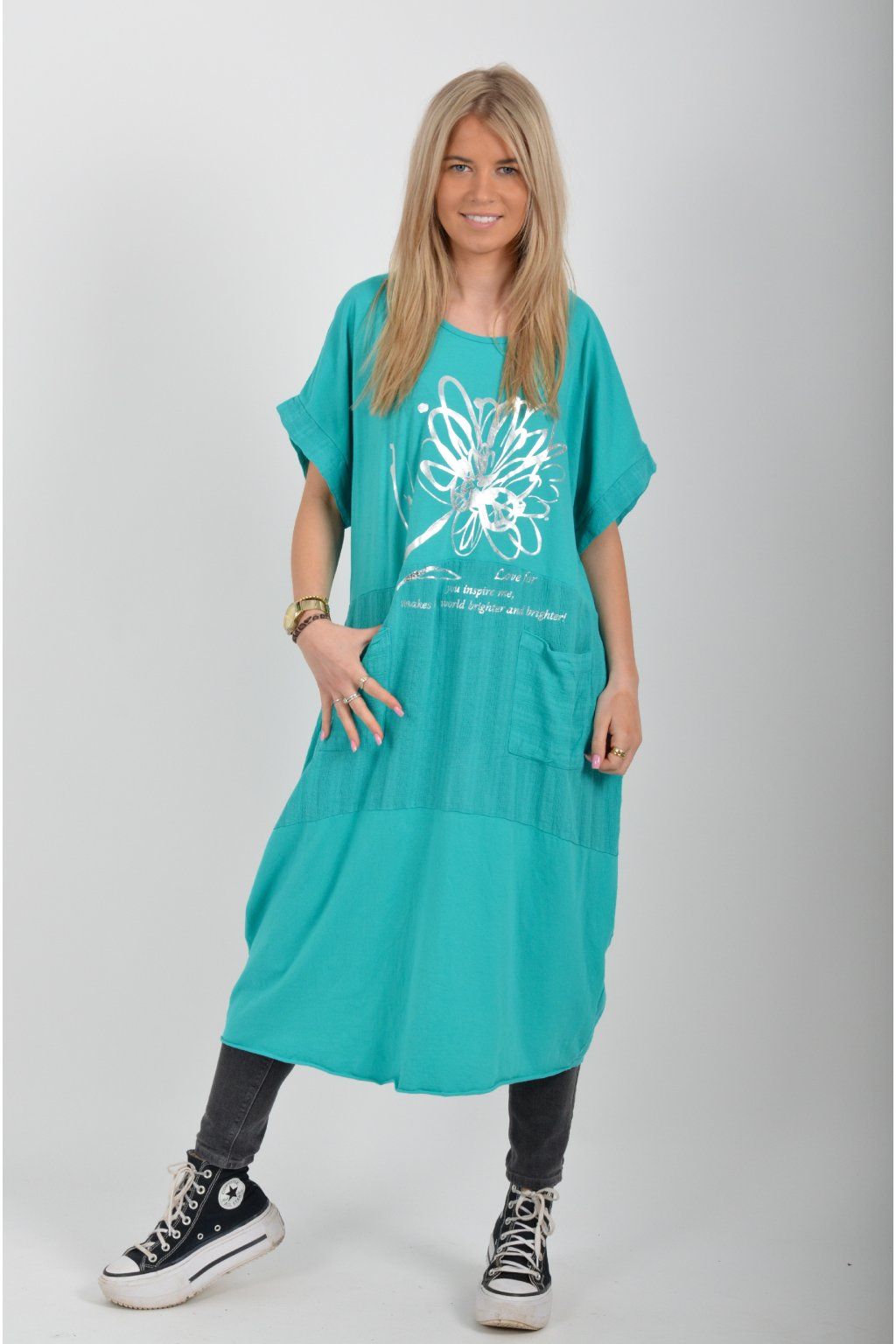 Zajímavé bavlněné šaty se stříbrným potiskem a kapsami v přední části.. Mají balónový střih a krátké rukávy. Jsou vyrobené z velice příjemného a pružného materiálu.