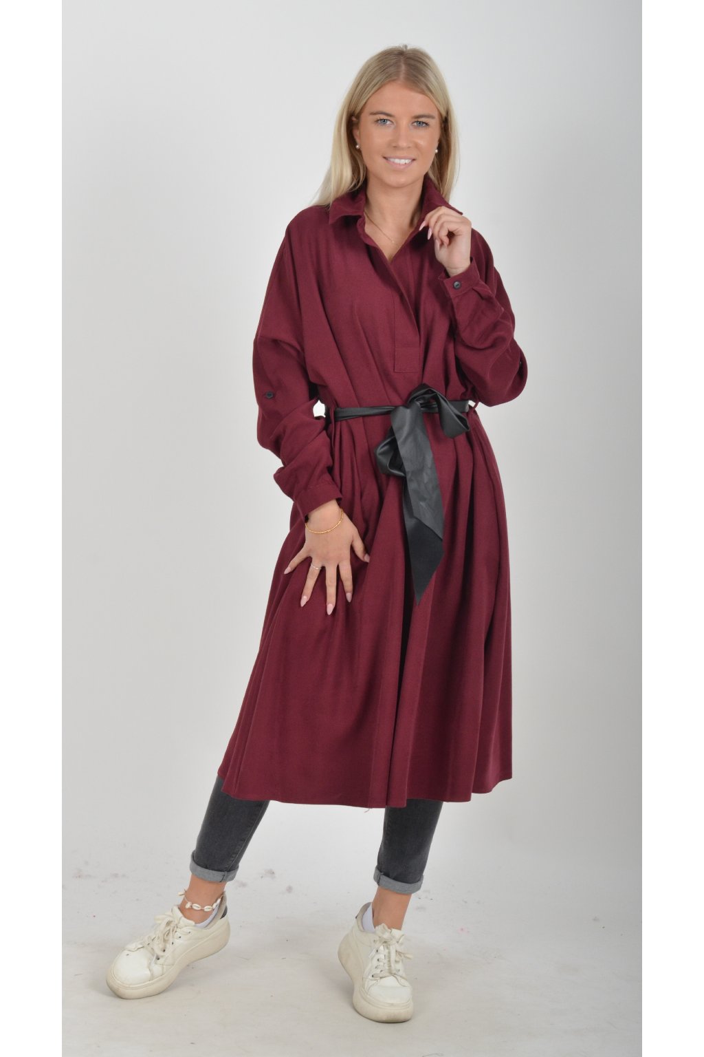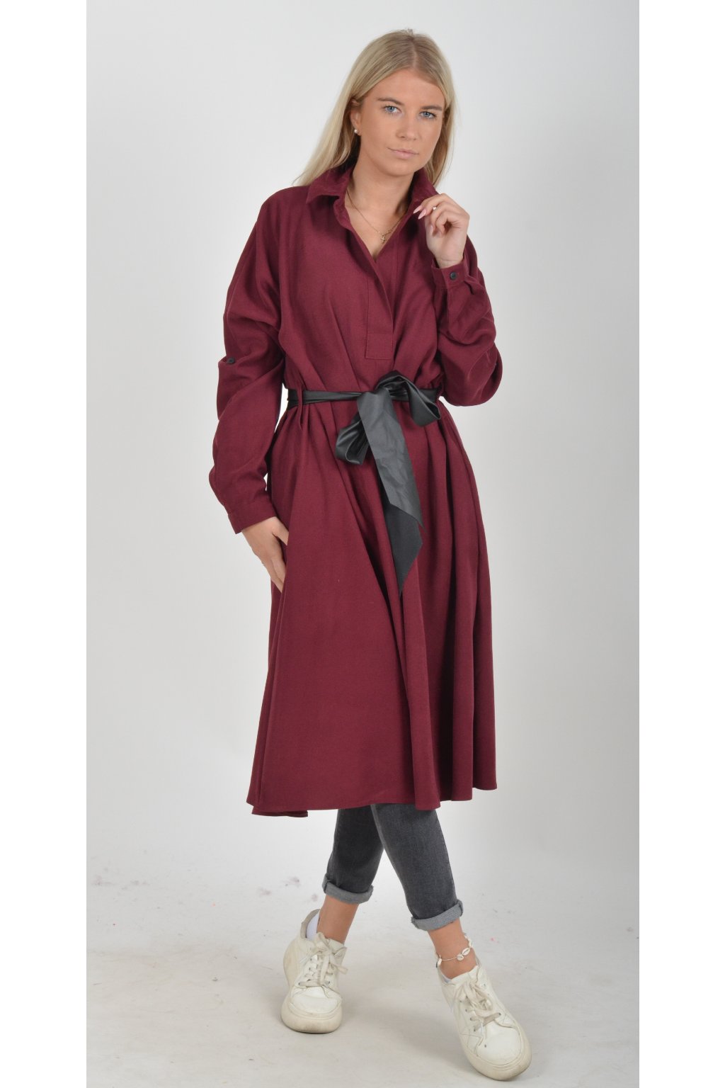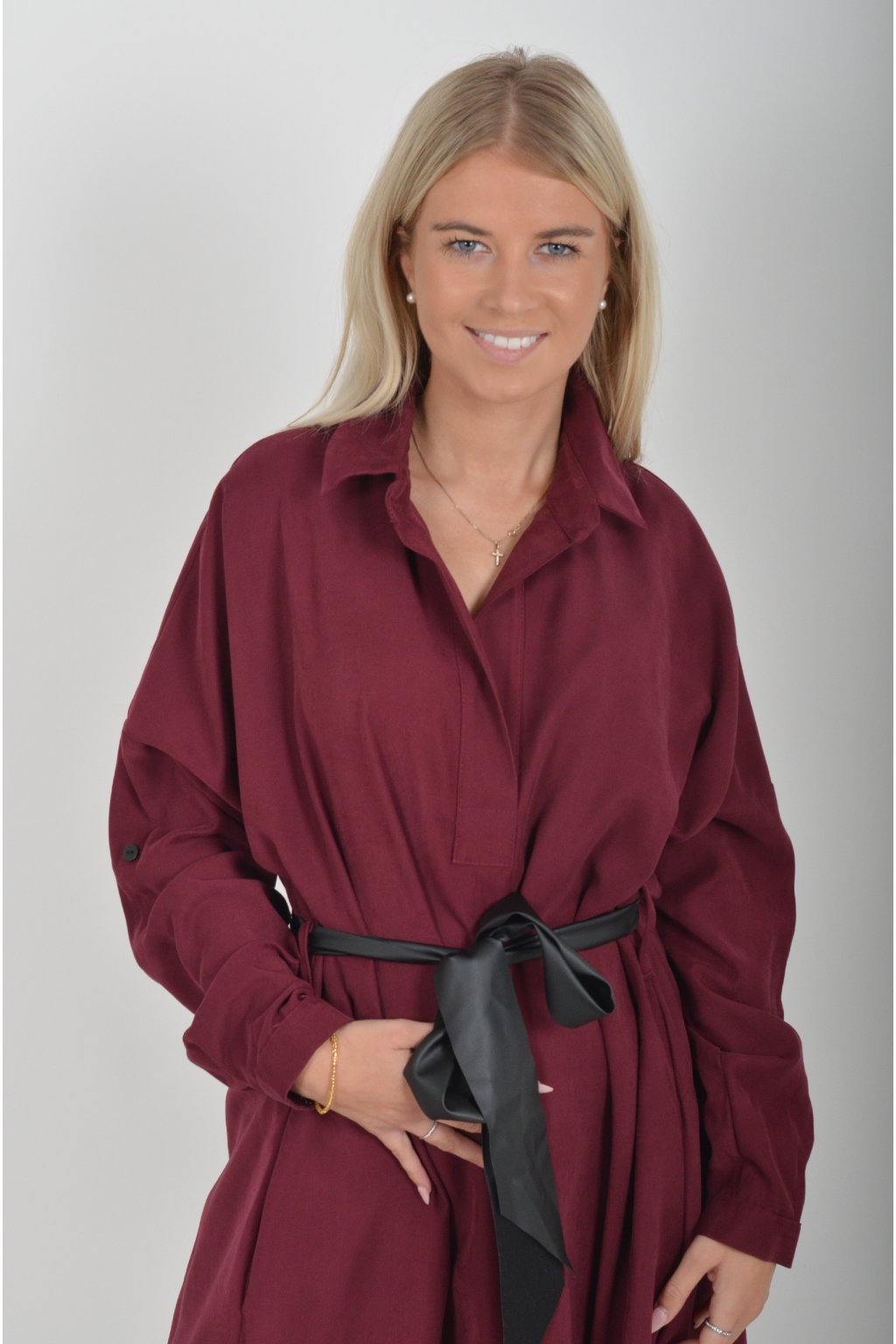 Jednou za dámu, jednou jen tak ven, tyto šaty splní oboje. Mají košilový áčkový střih s rozevlátou sukní, která je v zadní části mírně delší. Šaty mají na bocích kapsy. Rukávy jsou dlouhé, ale dají se zkrátit na knoflíček. Výrazným doplňkem šatů je pásek s imitací kůže, který můžete jakkoliv vázat a kombinovat. K šatům doporučujeme ozdobnou brož nebo šperky z naší kolekce.