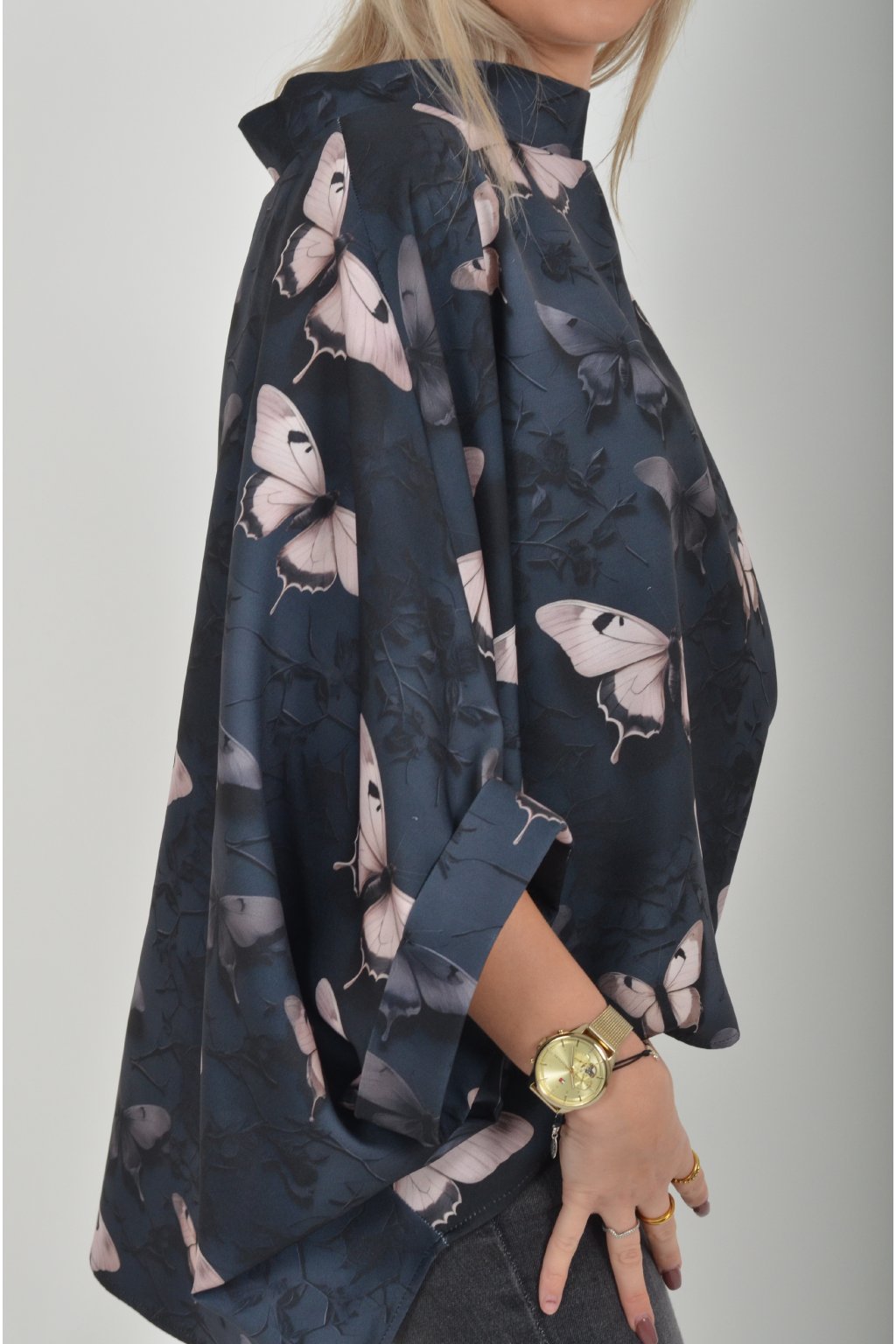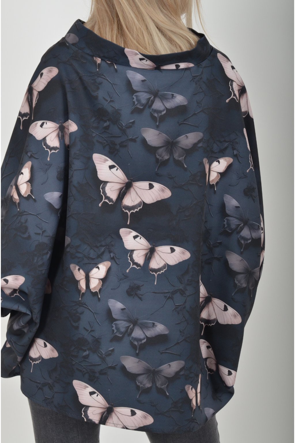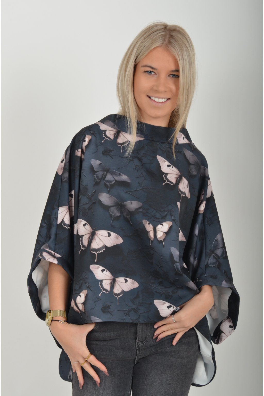 Halenka s netopýřím rukávem vhodná jak pro společenské události, tak i volnočasové nošení. Je vyrobena z velice příjemného a pevného materiálu. Přední část halenky je kratší než zadní. Je volnějšího střihu.