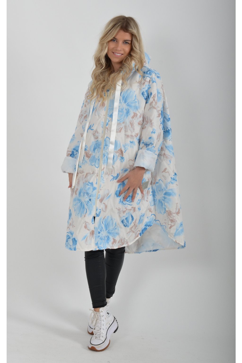 Přechodová bunda s kapuci a kapsami na bocích. Je volnějšího stylu, u krku má šňurky na stažení. Velice lehký a měkký materiál.