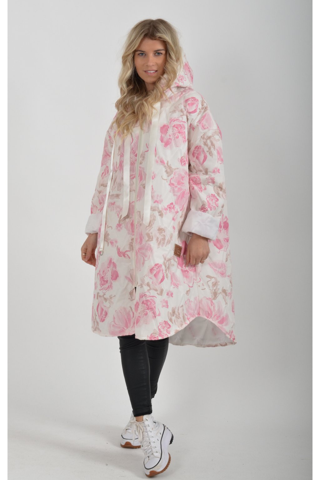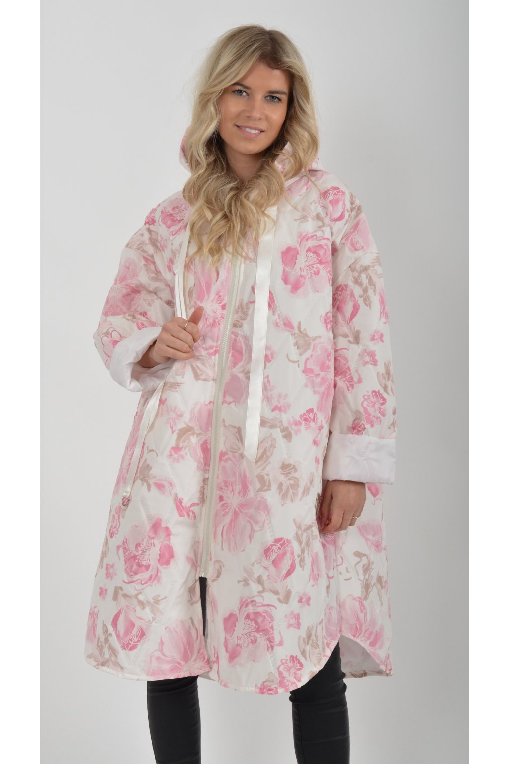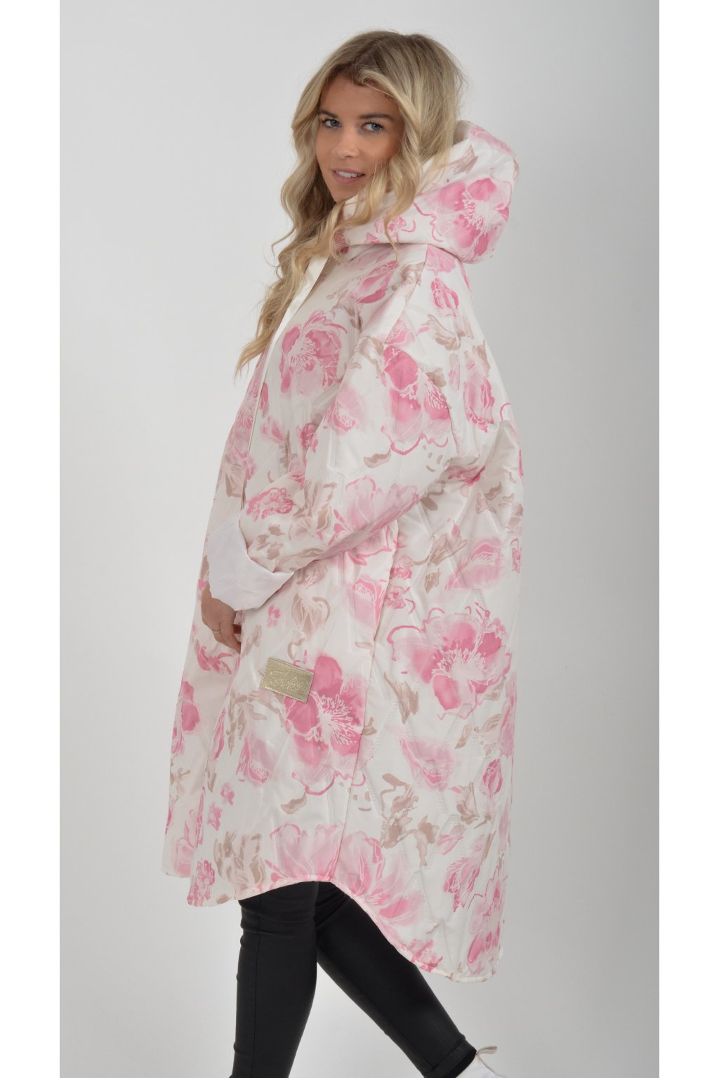 Přechodová bunda s kapuci a kapsami na bocích. Je volnějšího stylu, u krku má šňurky na stažení. Velice lehký a měkký materiál.