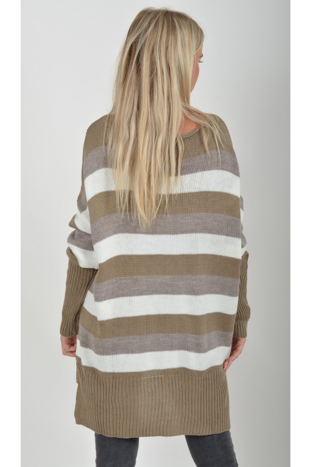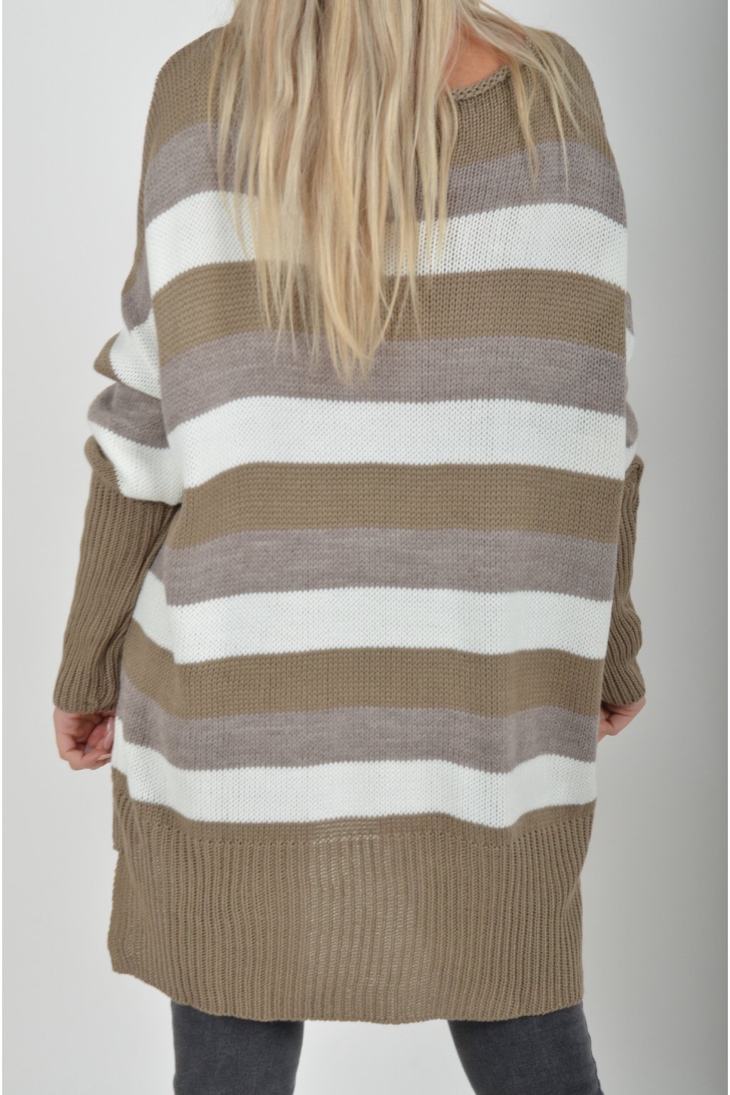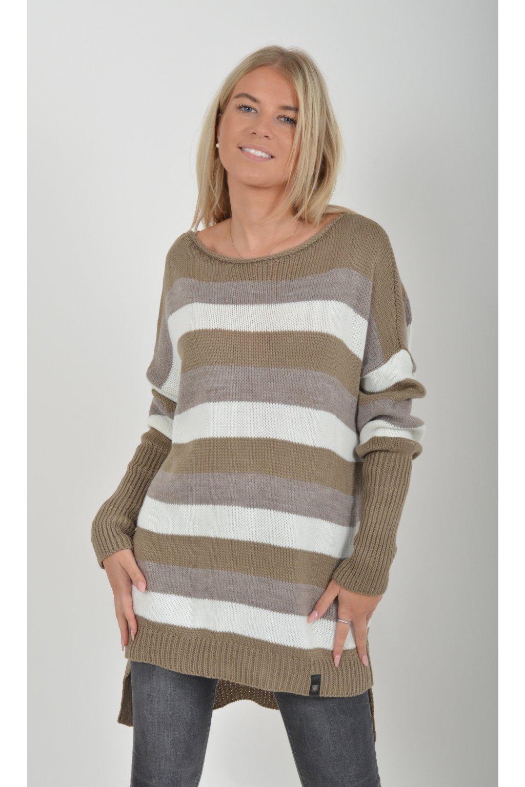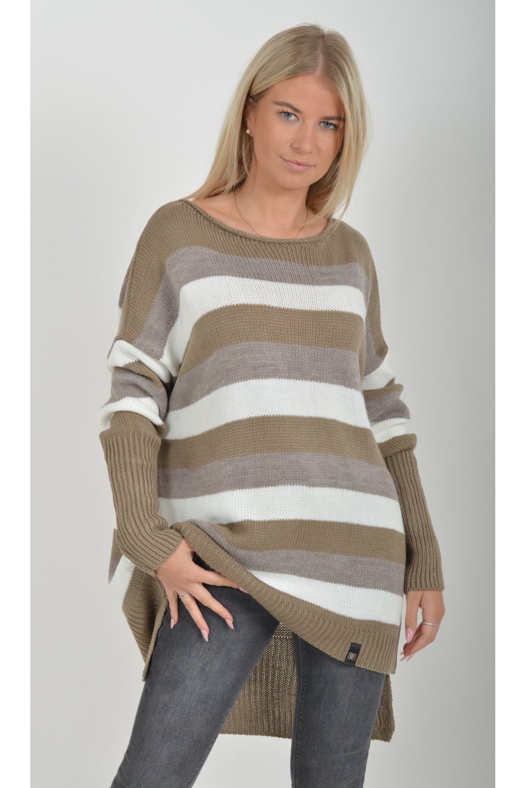 Prodloužený elastický svetr s dlouhým rukávem vyrobený z velice příjemného a nekousavého materiálu. Zadní část svetru je delší než přední, což opticky prodlouží postavu. Kombinace barev na svetru jsou hnědá, šedá a bílá.