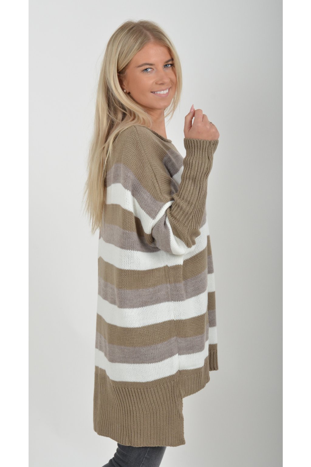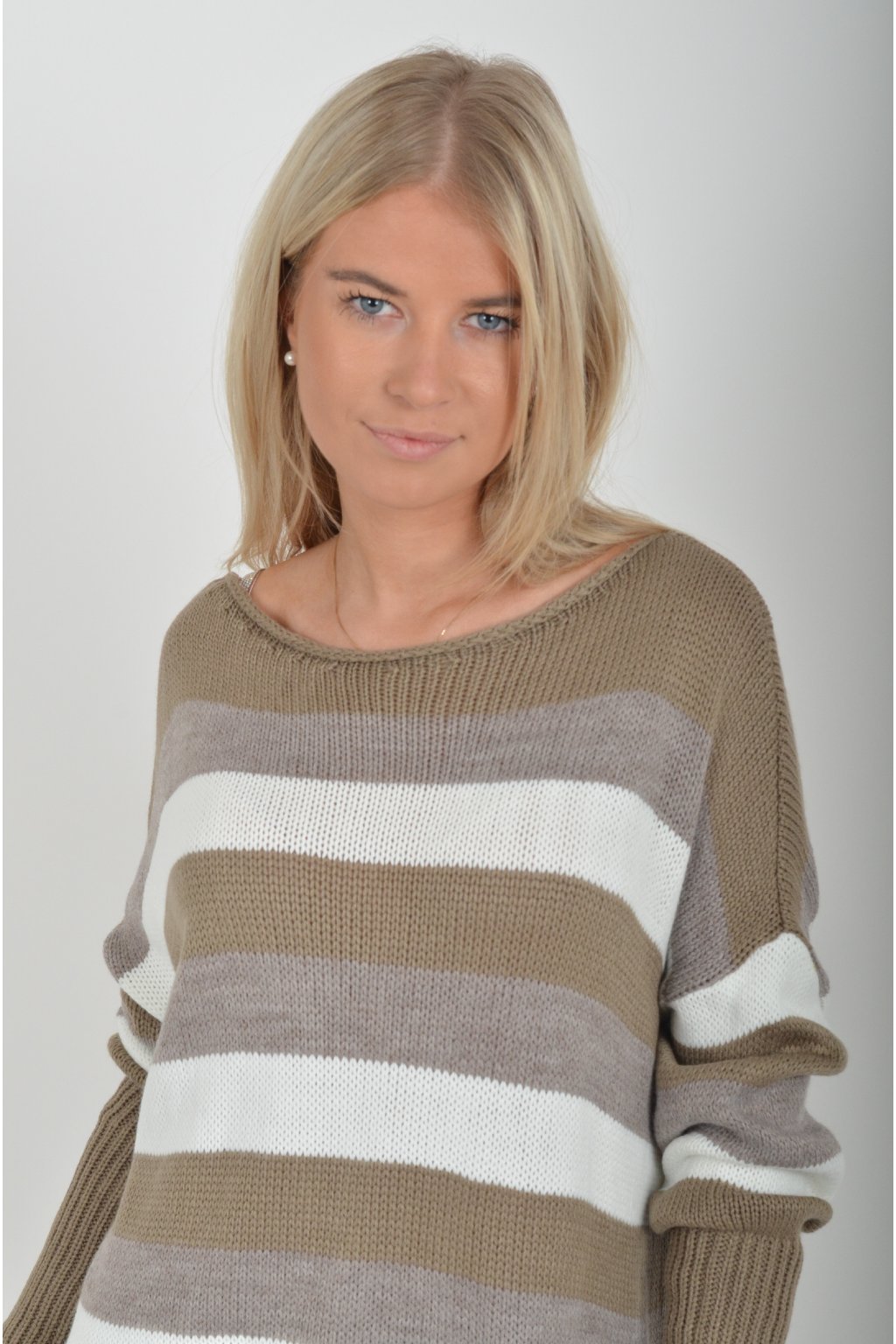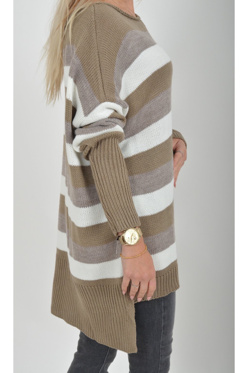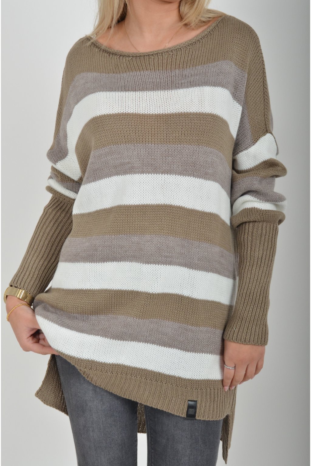 Prodloužený elastický svetr s dlouhým rukávem vyrobený z velice příjemného a nekousavého materiálu. Zadní část svetru je delší než přední, což opticky prodlouží postavu. Kombinace barev na svetru jsou hnědá, šedá a bílá.