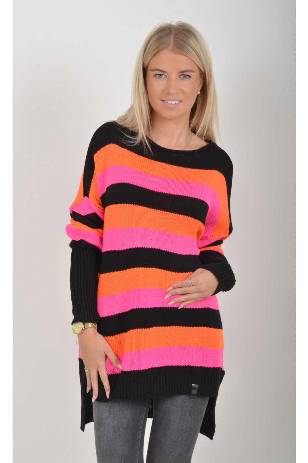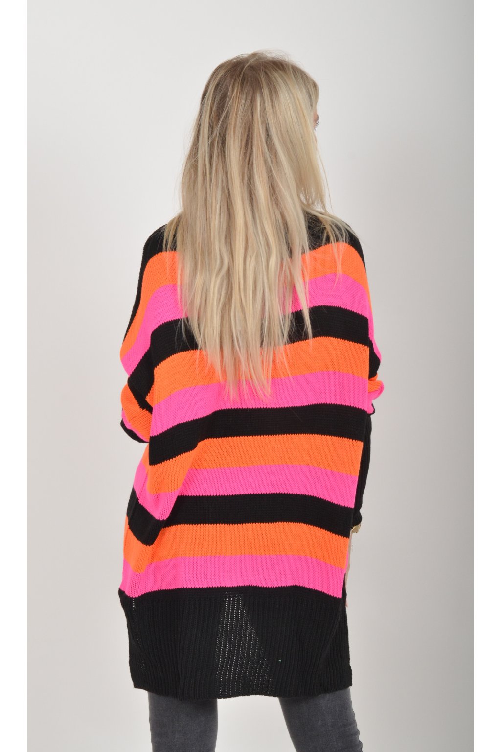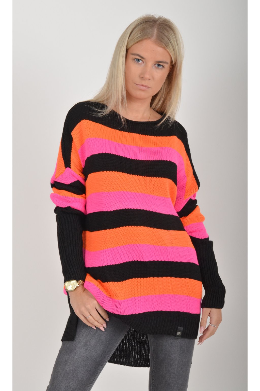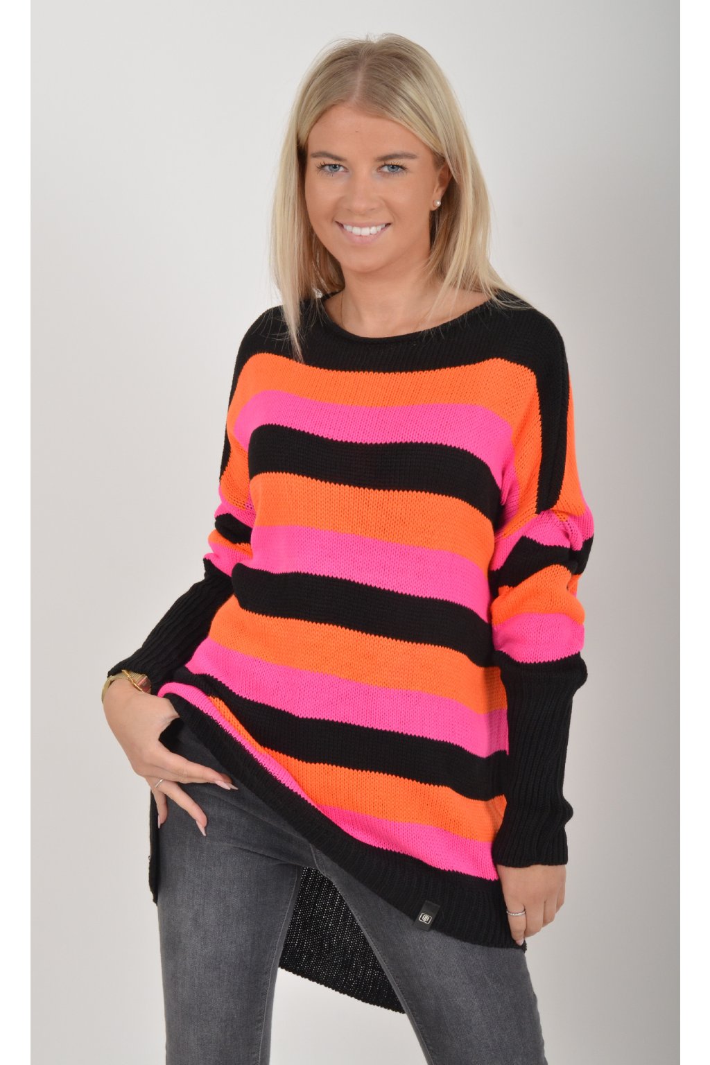 Prodloužený elastický svetr s dlouhým rukávem vyrobený z velice příjemného a nekousavého materiálu. Zadní část svetru je delší než přední, což opticky prodlouží postavu. Kombinace barev na svetru jsou černá, oranžová a růžová.