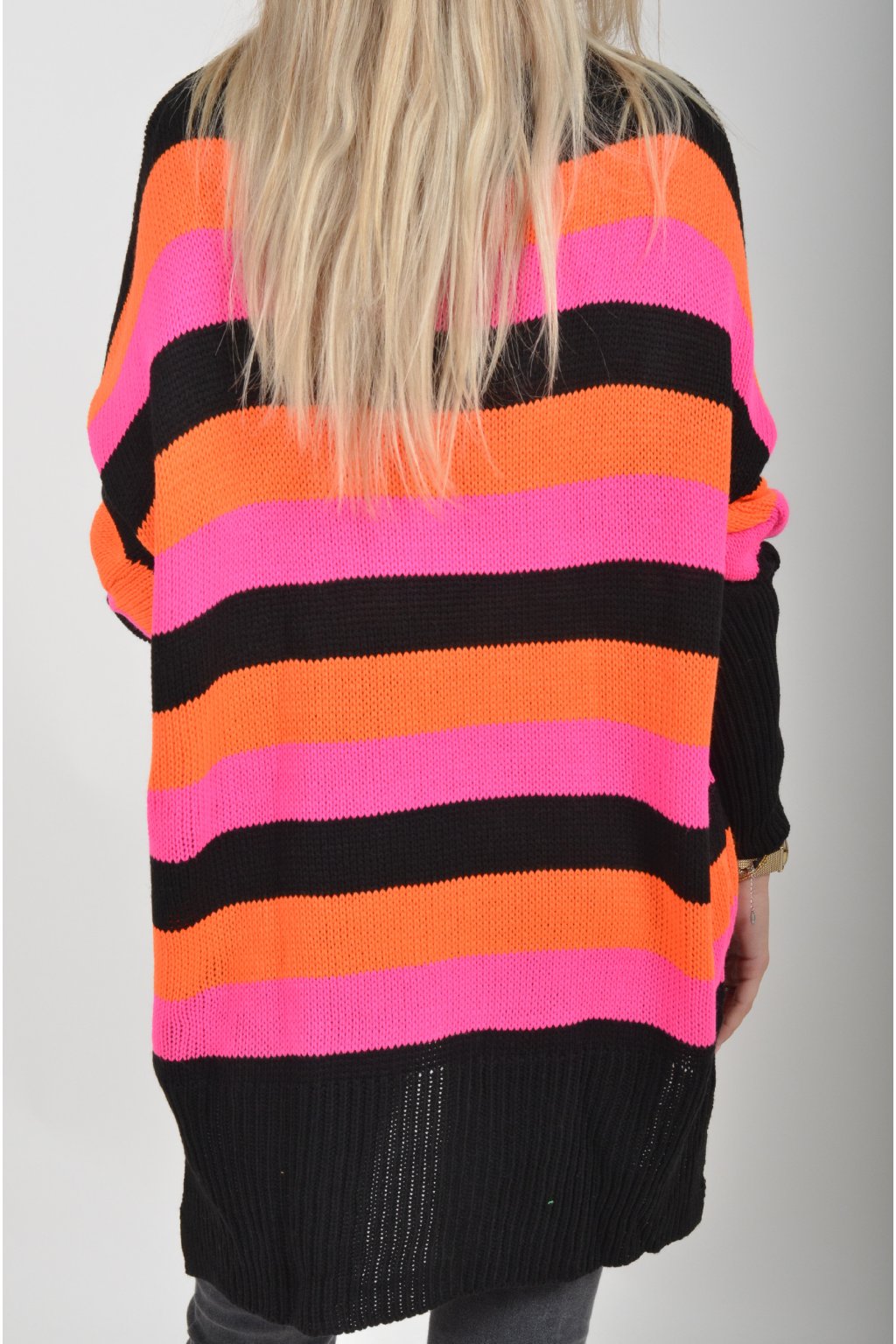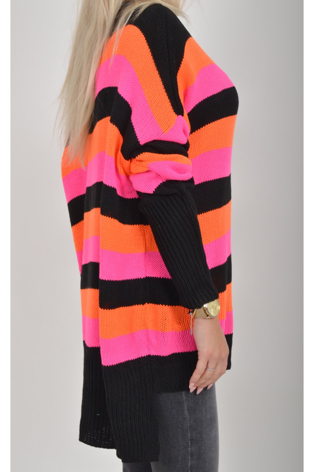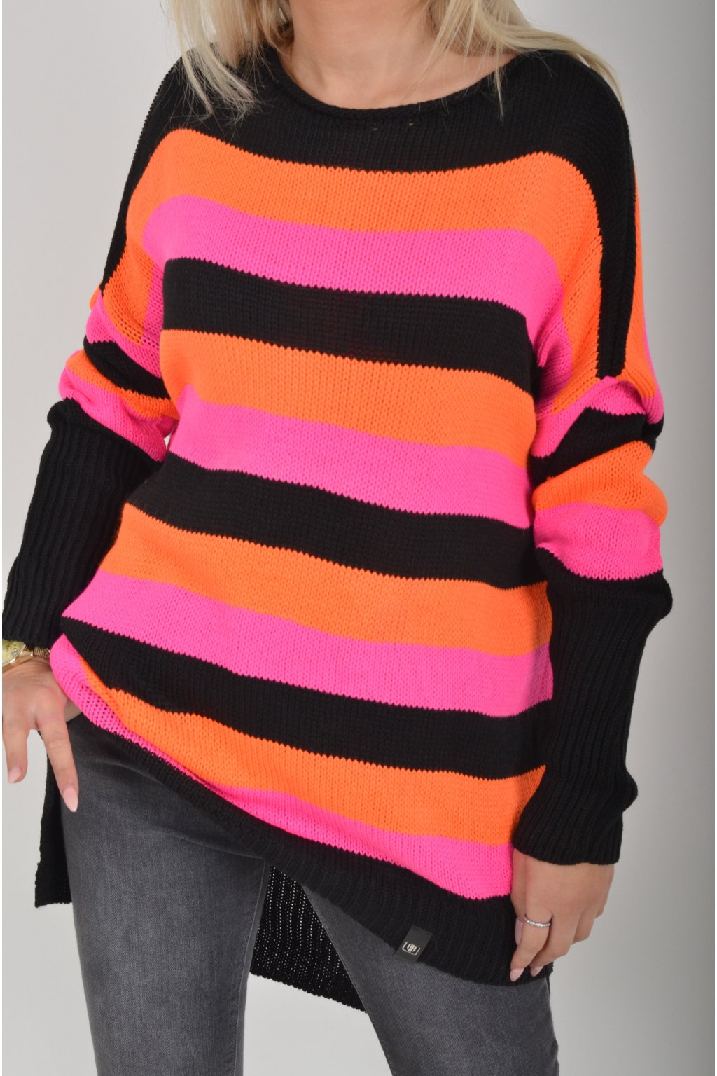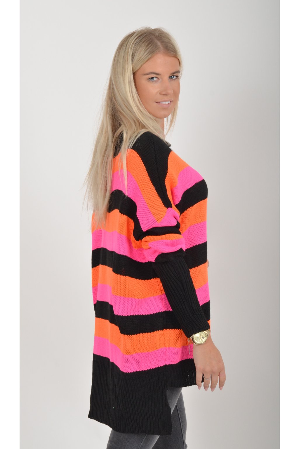 Prodloužený elastický svetr s dlouhým rukávem vyrobený z velice příjemného a nekousavého materiálu. Zadní část svetru je delší než přední, což opticky prodlouží postavu. Kombinace barev na svetru jsou černá, oranžová a růžová.