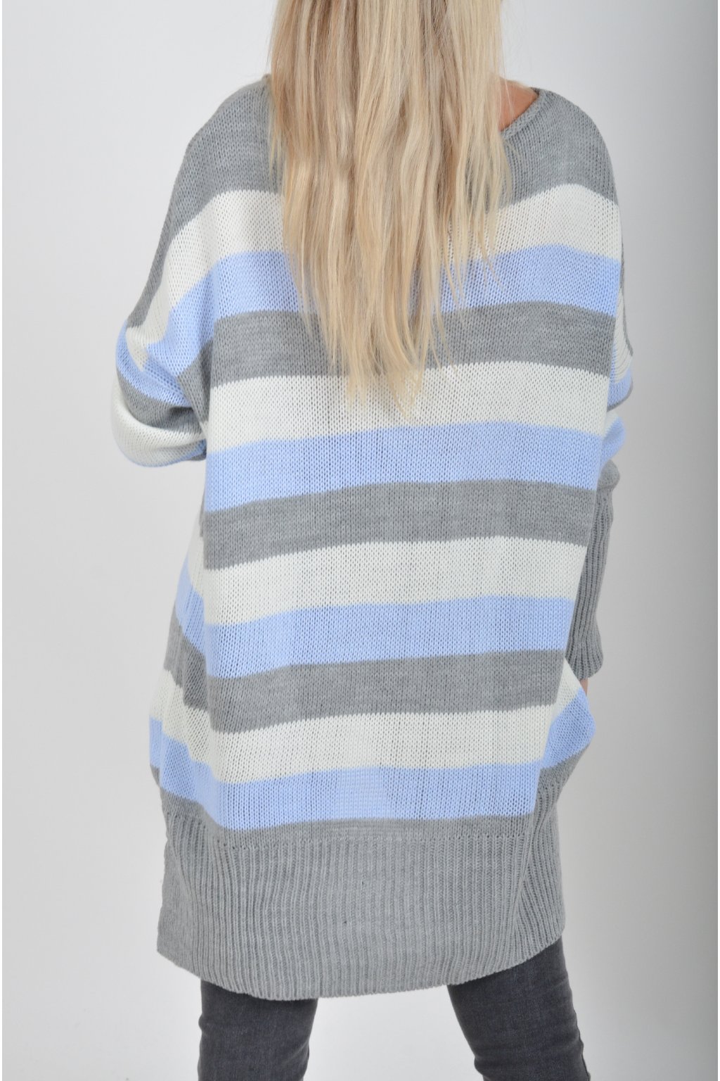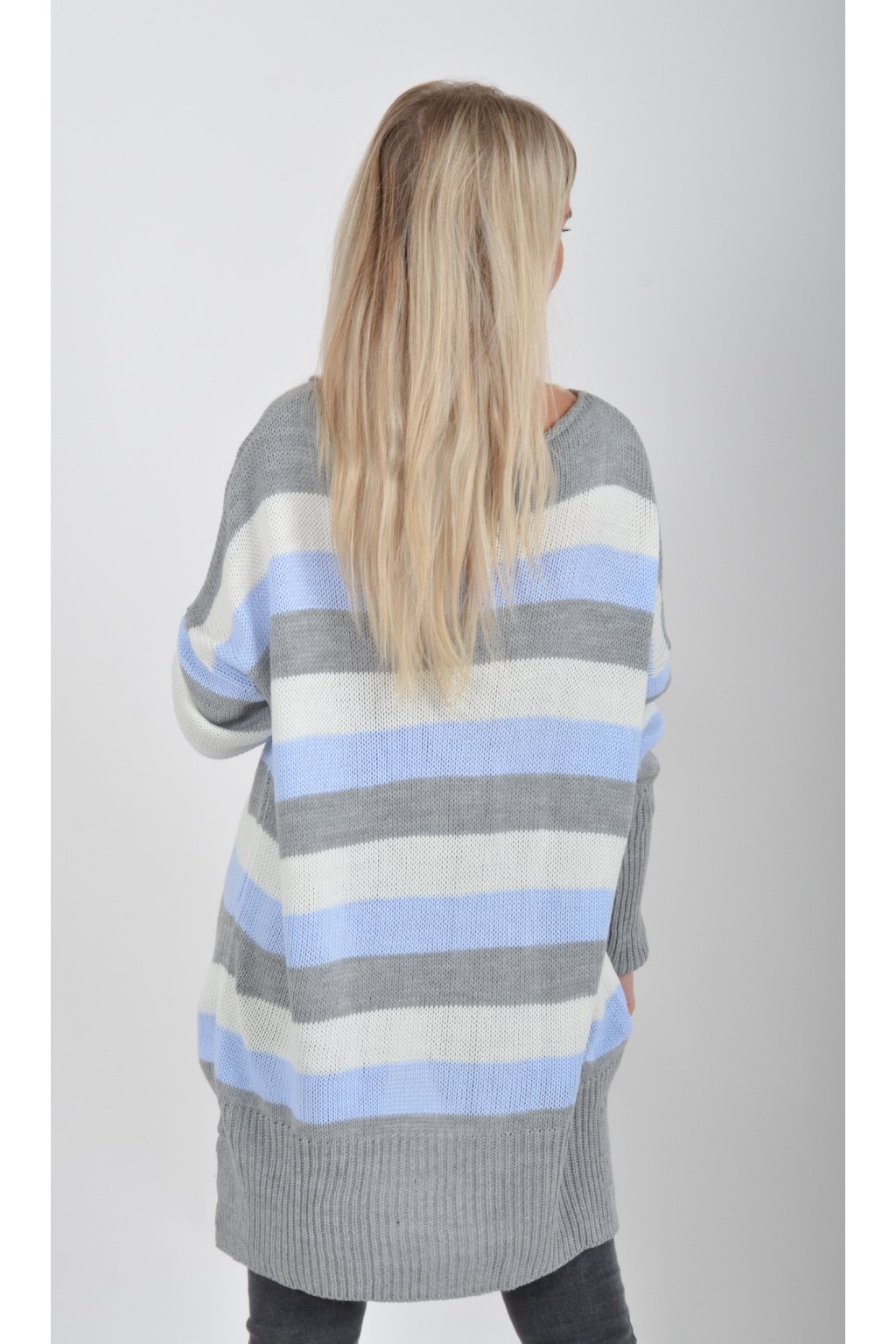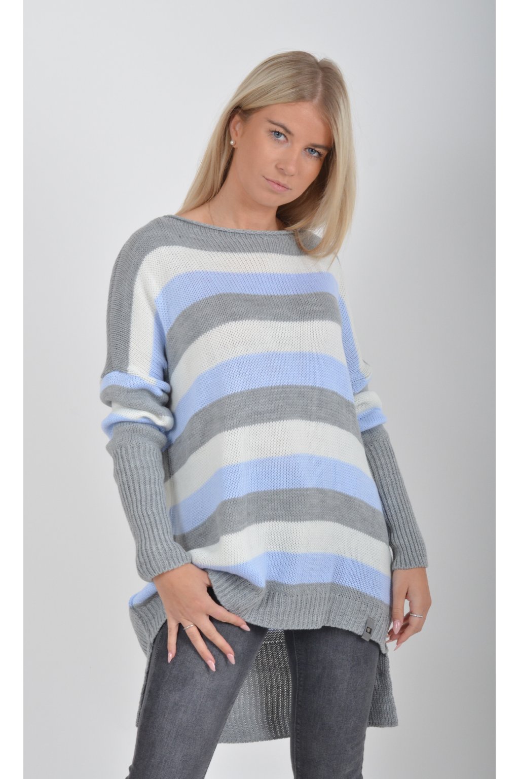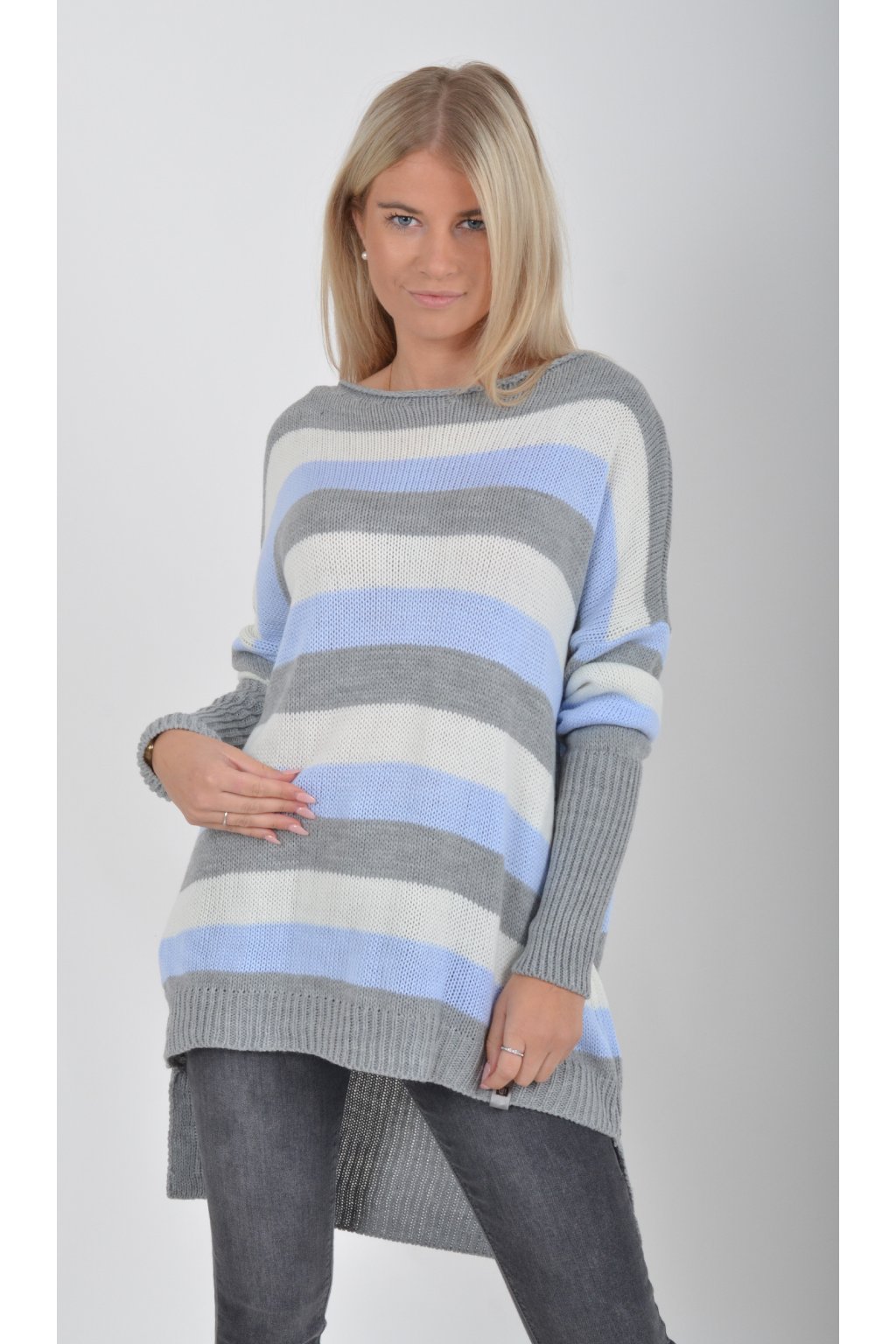 Prodloužený elastický svetr s dlouhým rukávem vyrobený z velice příjemného a nekousavého materiálu. Zadní část svetru je delší než přední, což opticky prodlouží postavu. Kombinace barev na svetru jsou šedá, bílá a modrá.
