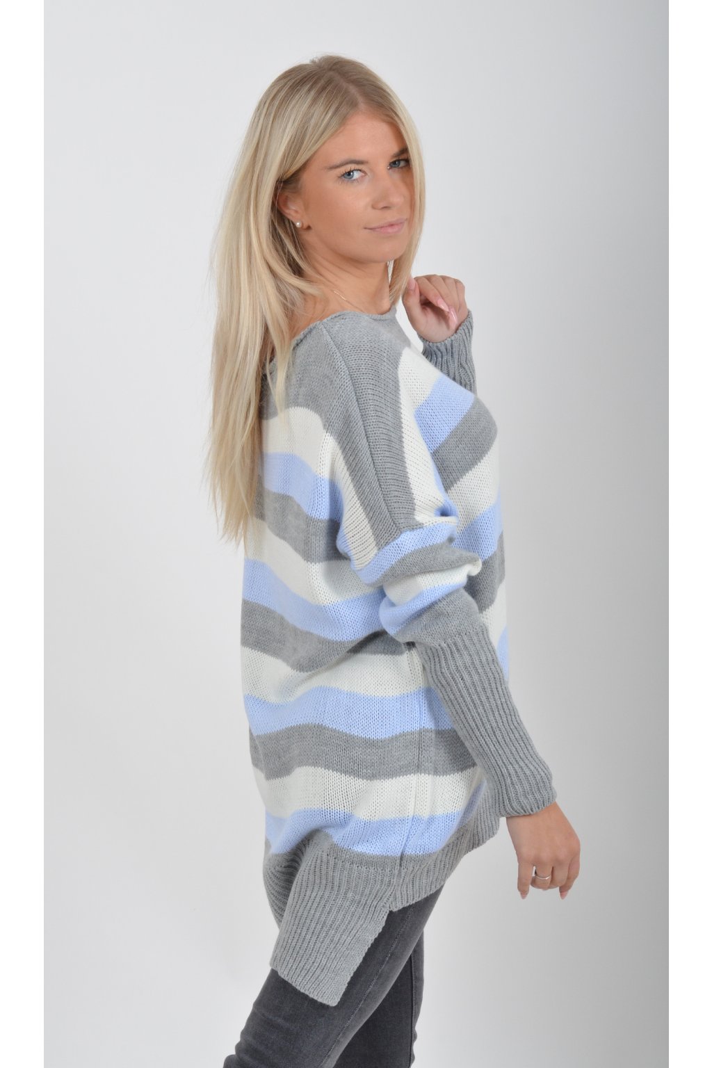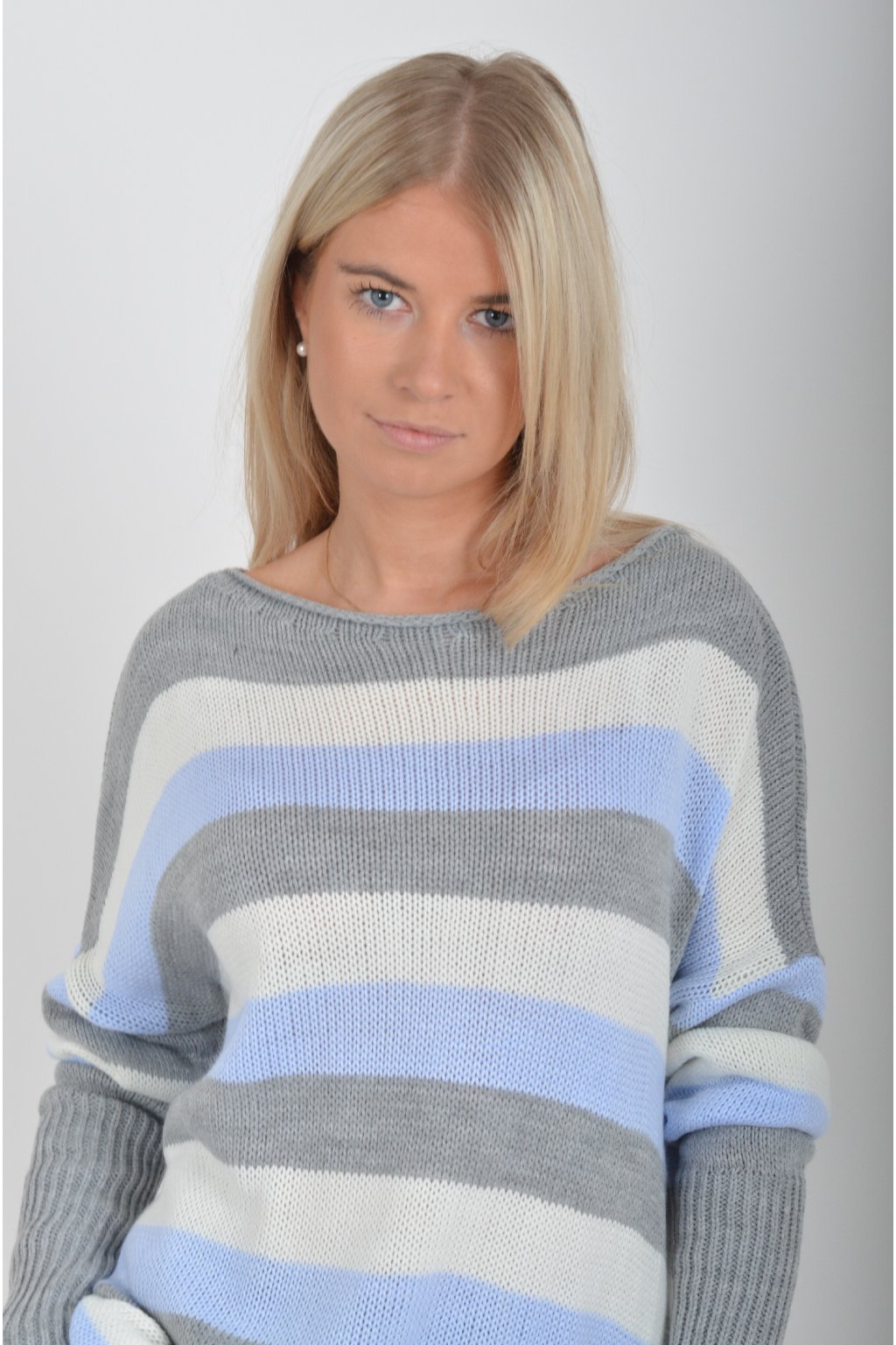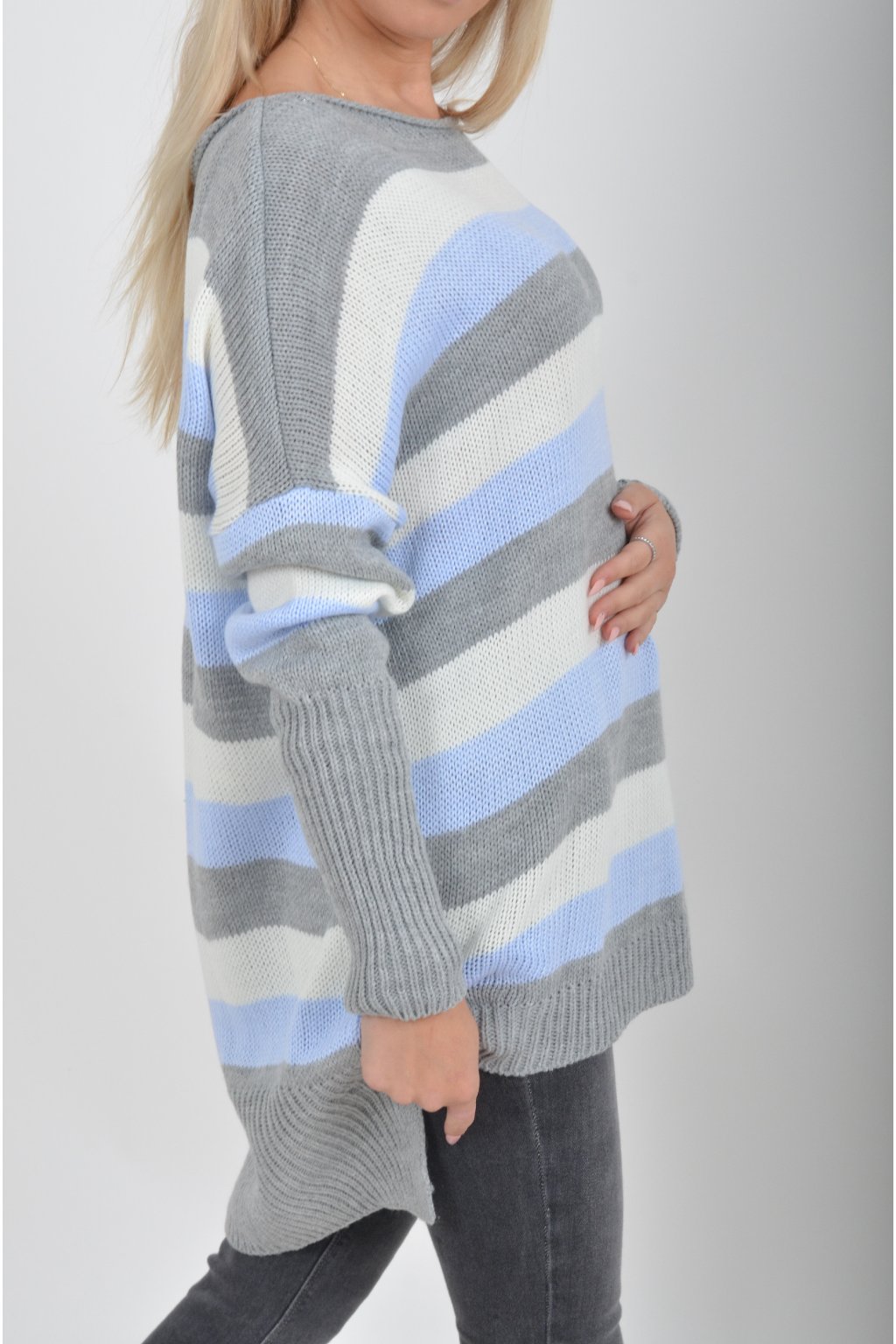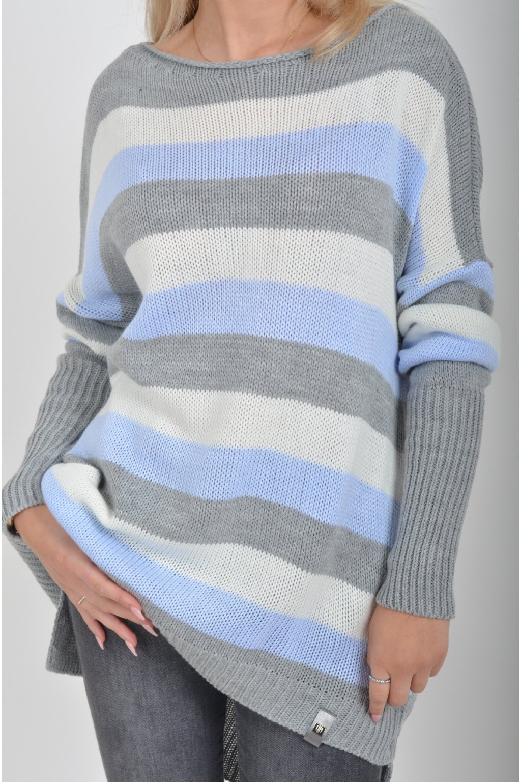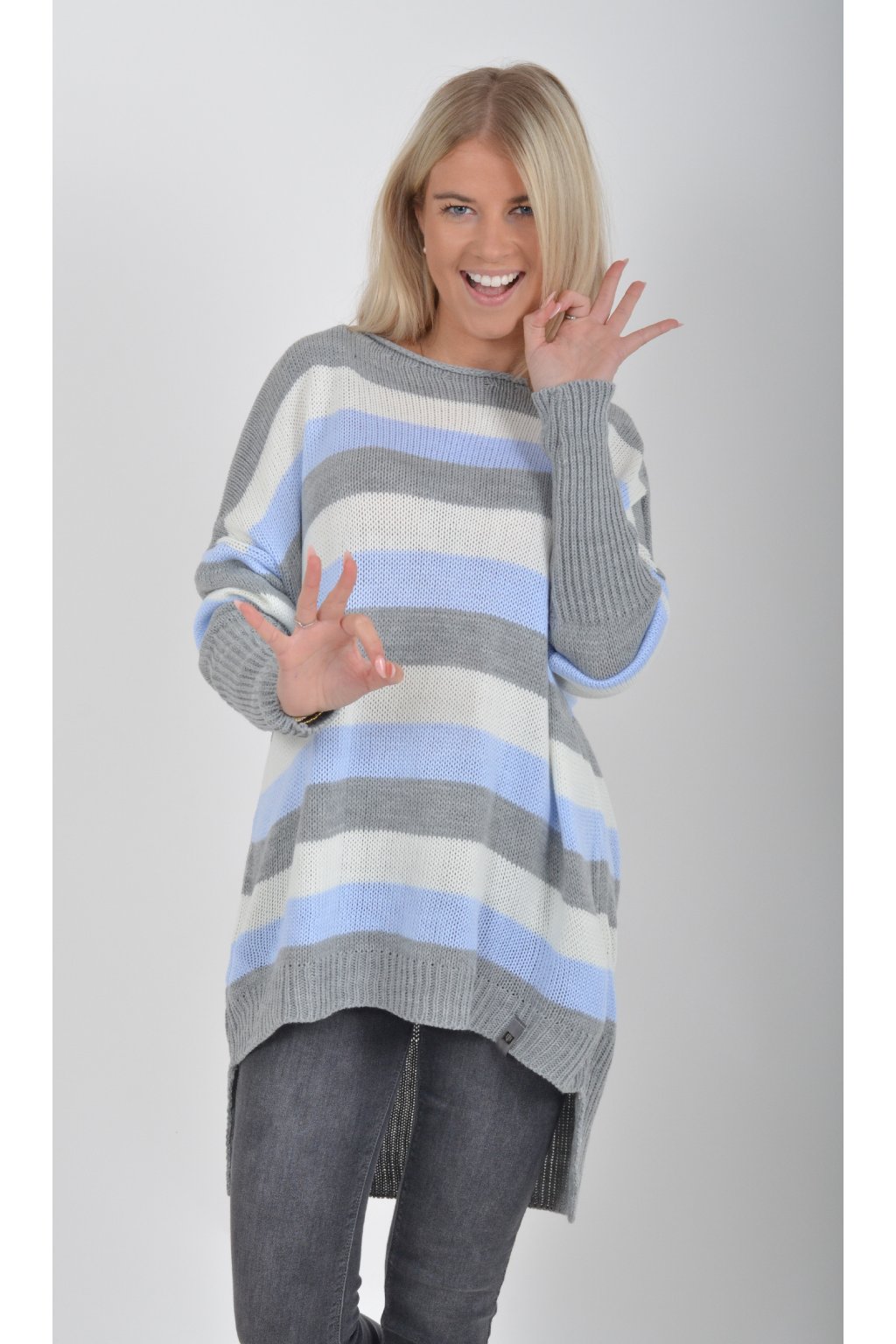 Prodloužený elastický svetr s dlouhým rukávem vyrobený z velice příjemného a nekousavého materiálu. Zadní část svetru je delší než přední, což opticky prodlouží postavu. Kombinace barev na svetru jsou šedá, bílá a modrá.