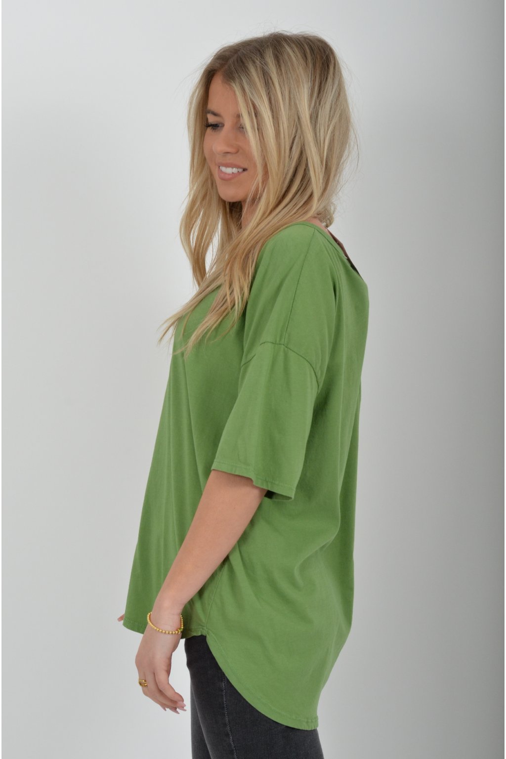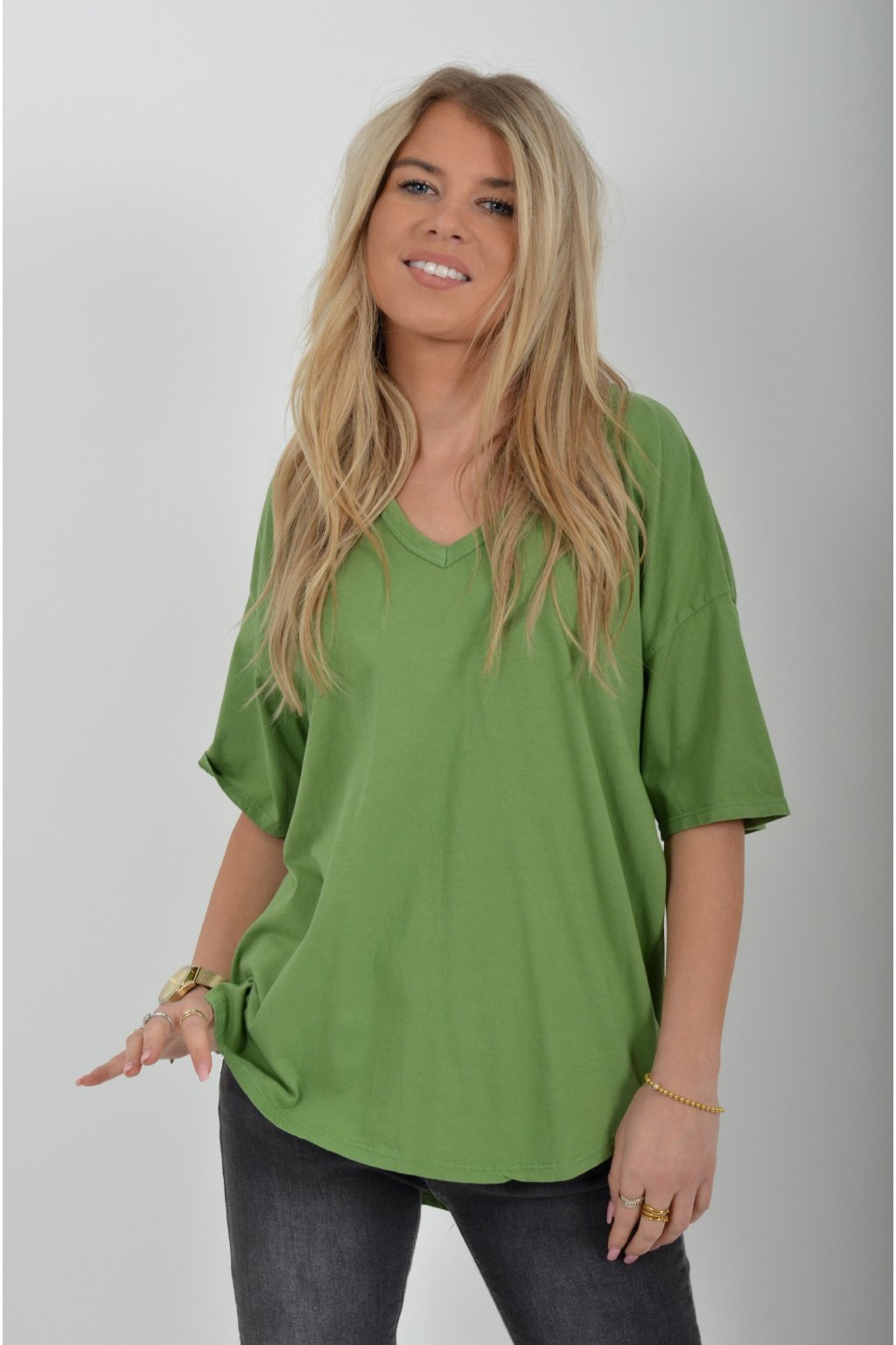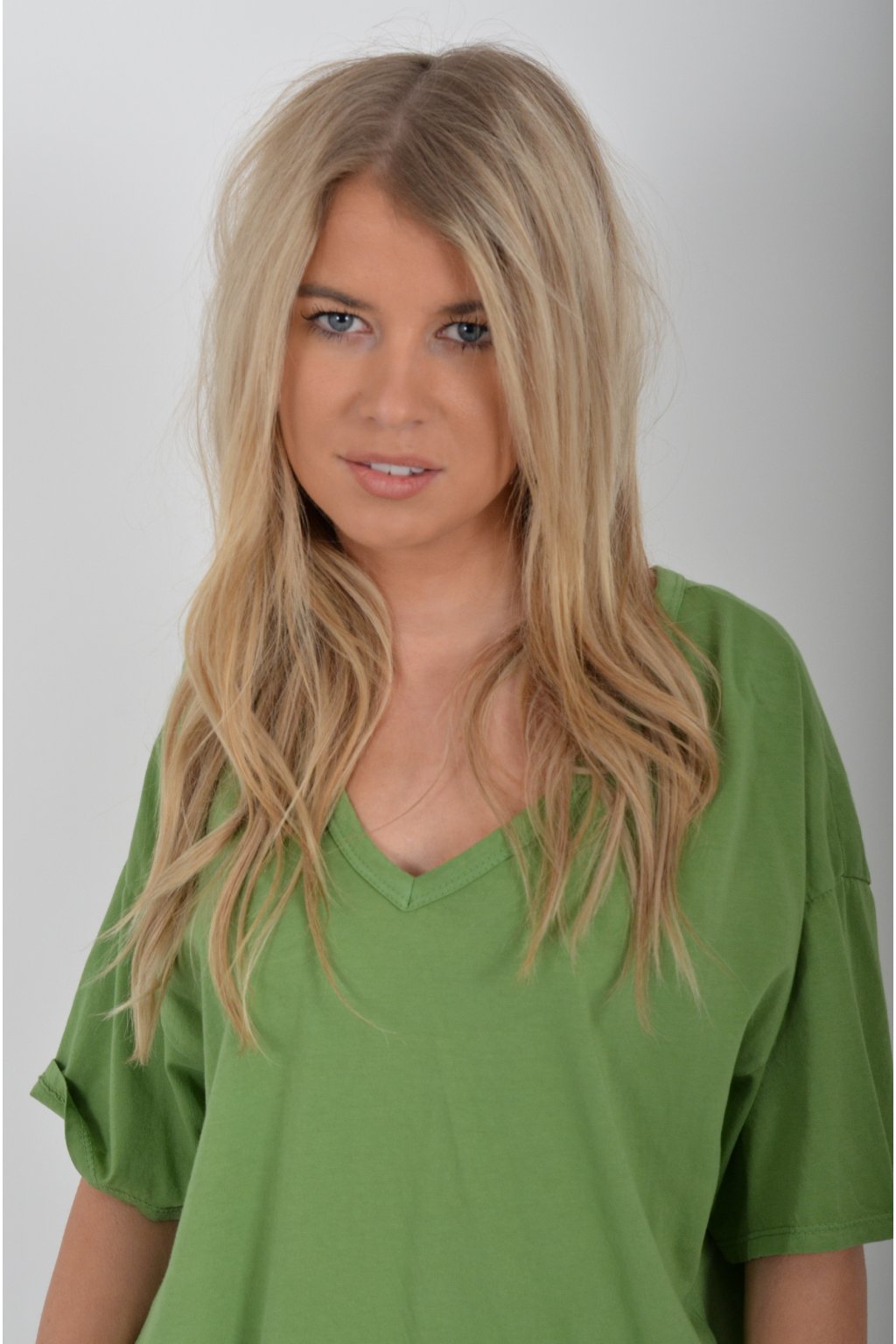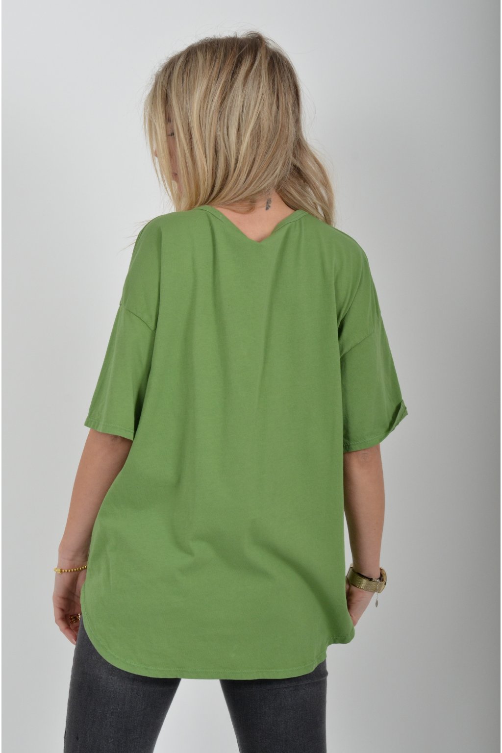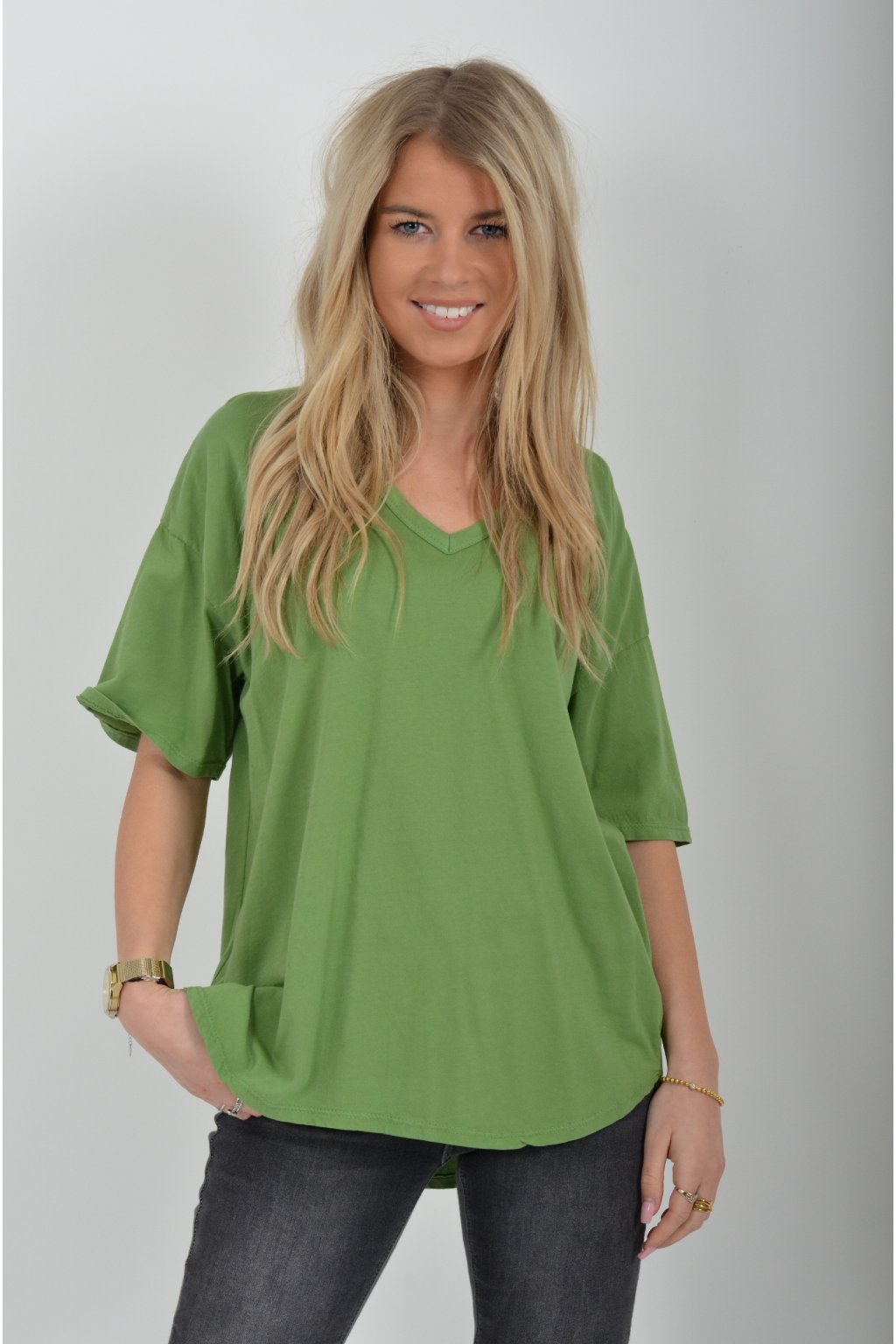 Jednobarevné tričko s krátkým rukávem a výstřihem do V. Zadní část trička je delší než přední. Je vyrobené z velice lehké, měkké a příjemné bavlny.