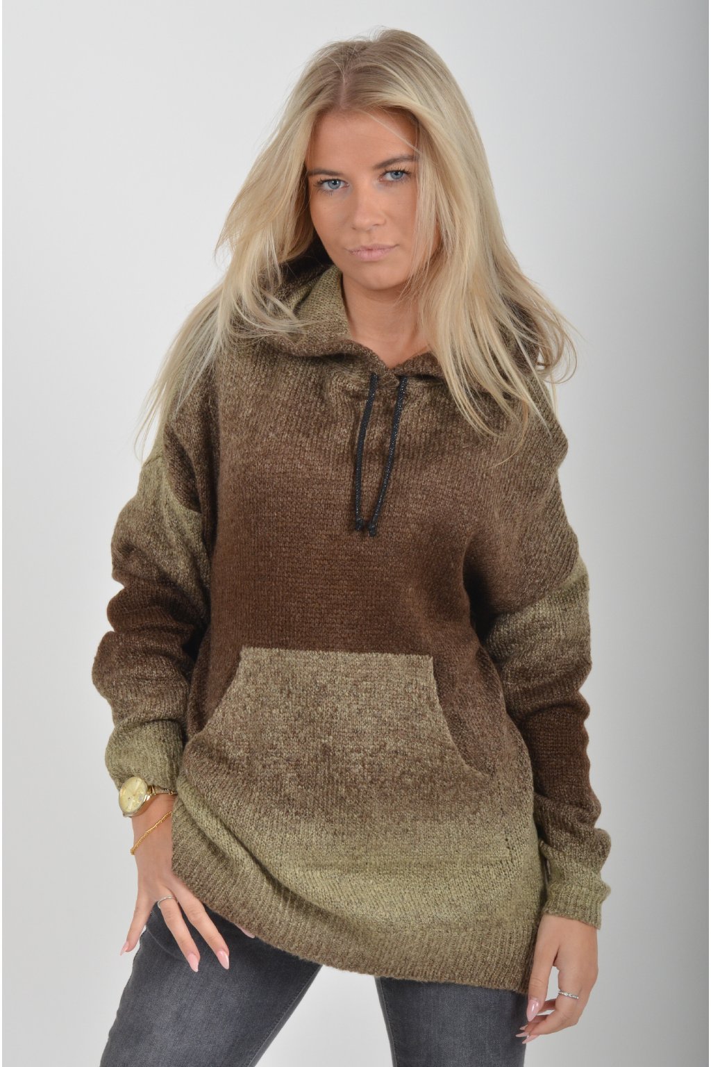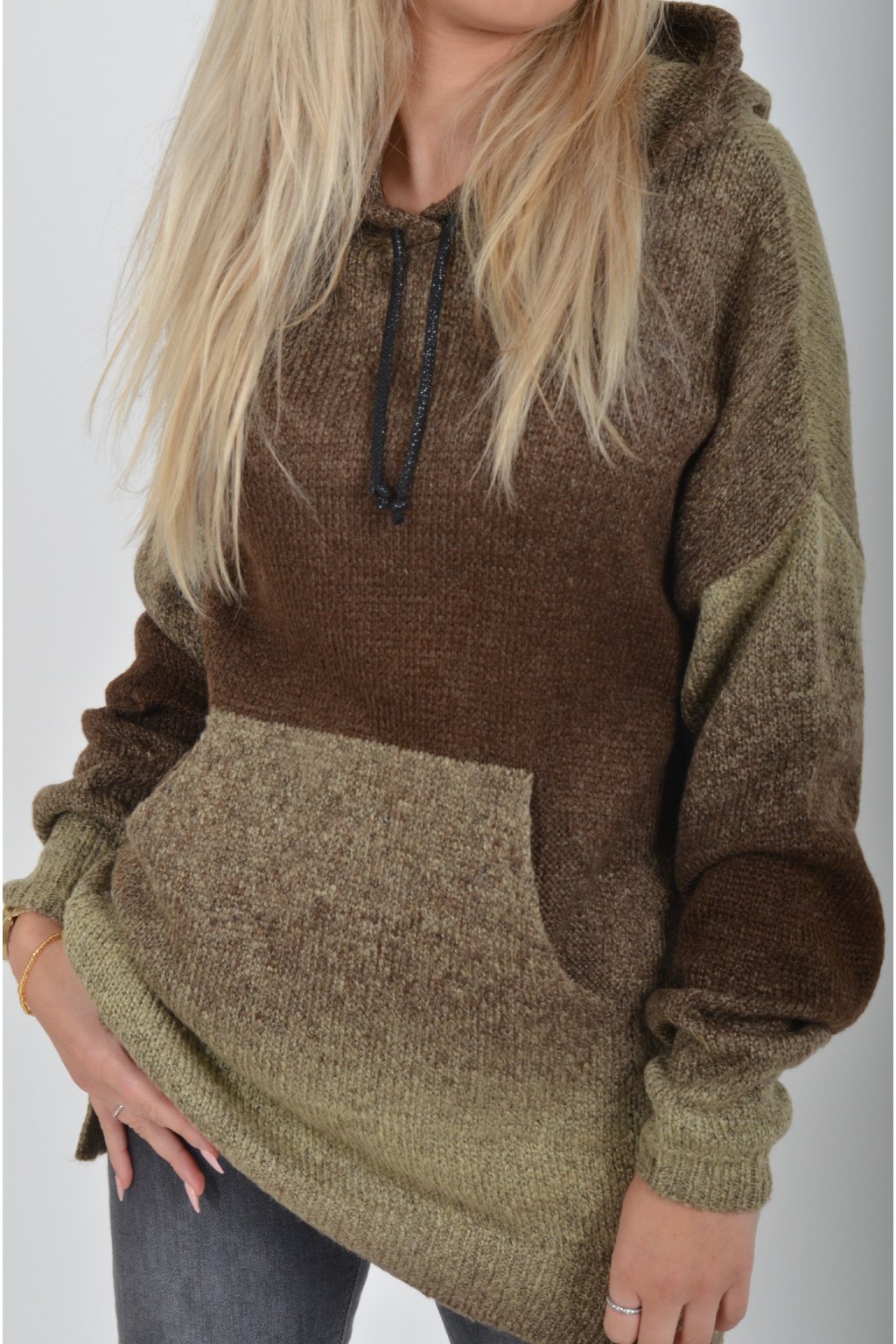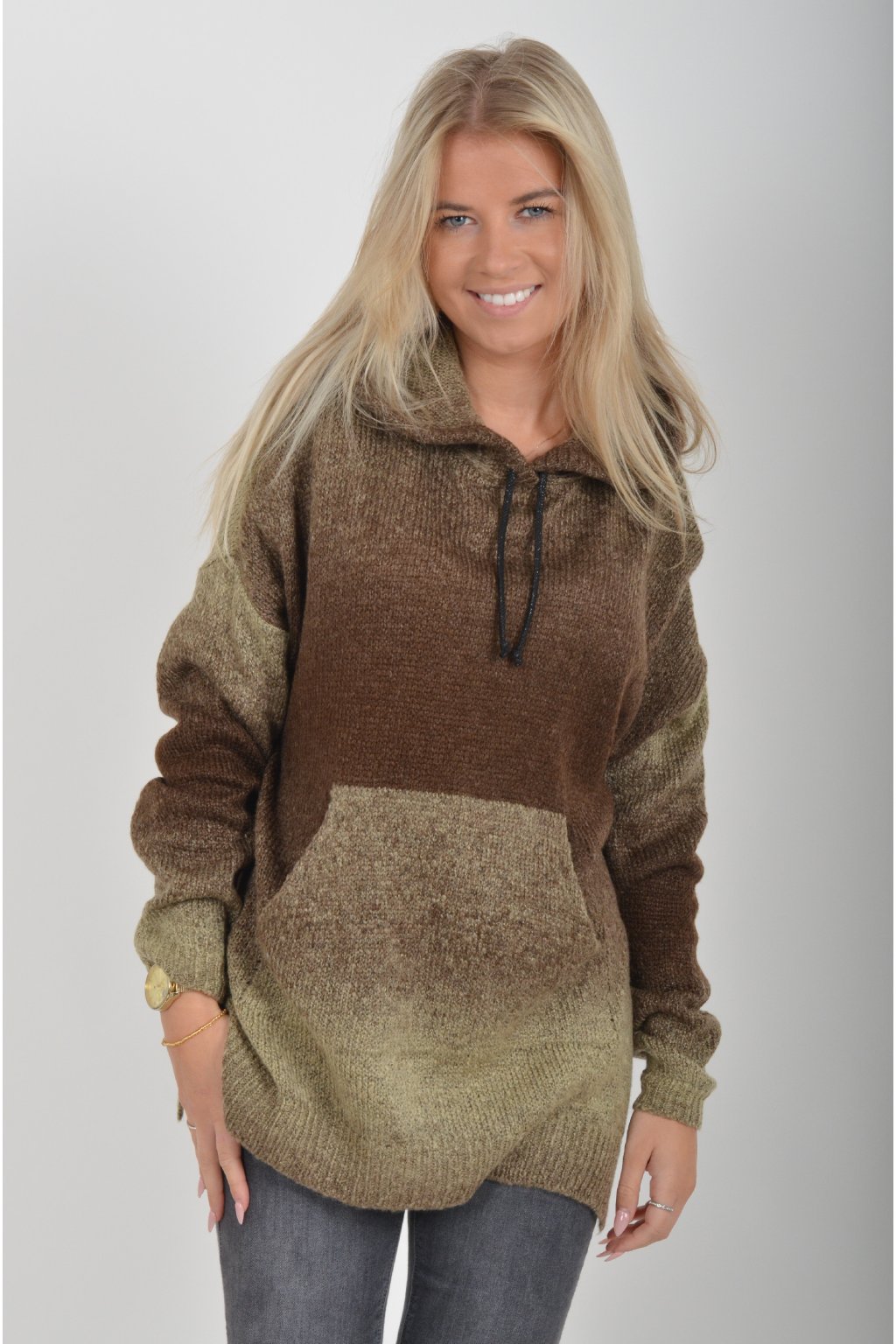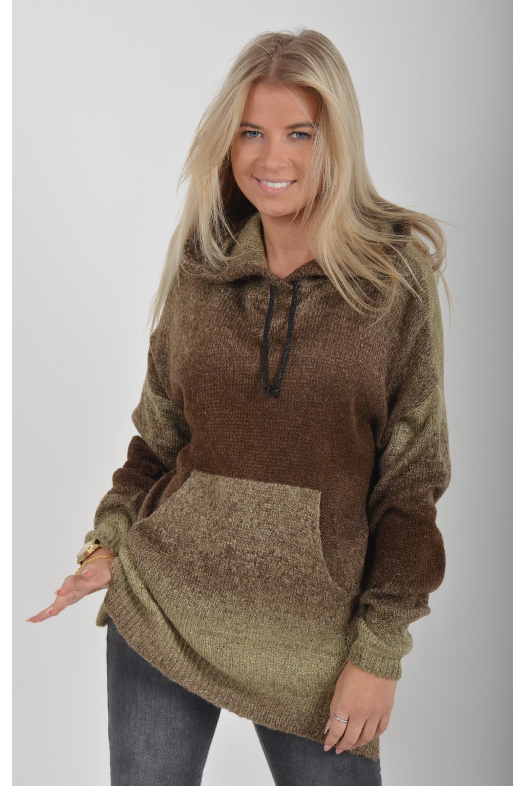 Žíhaný elastický svetr s dlouhým rukávem s barevnou kombinací, hnědá a khaki. Svetr má kapuci a klokaní kapsu a je z velice příjemného a nekousavého materiálu.