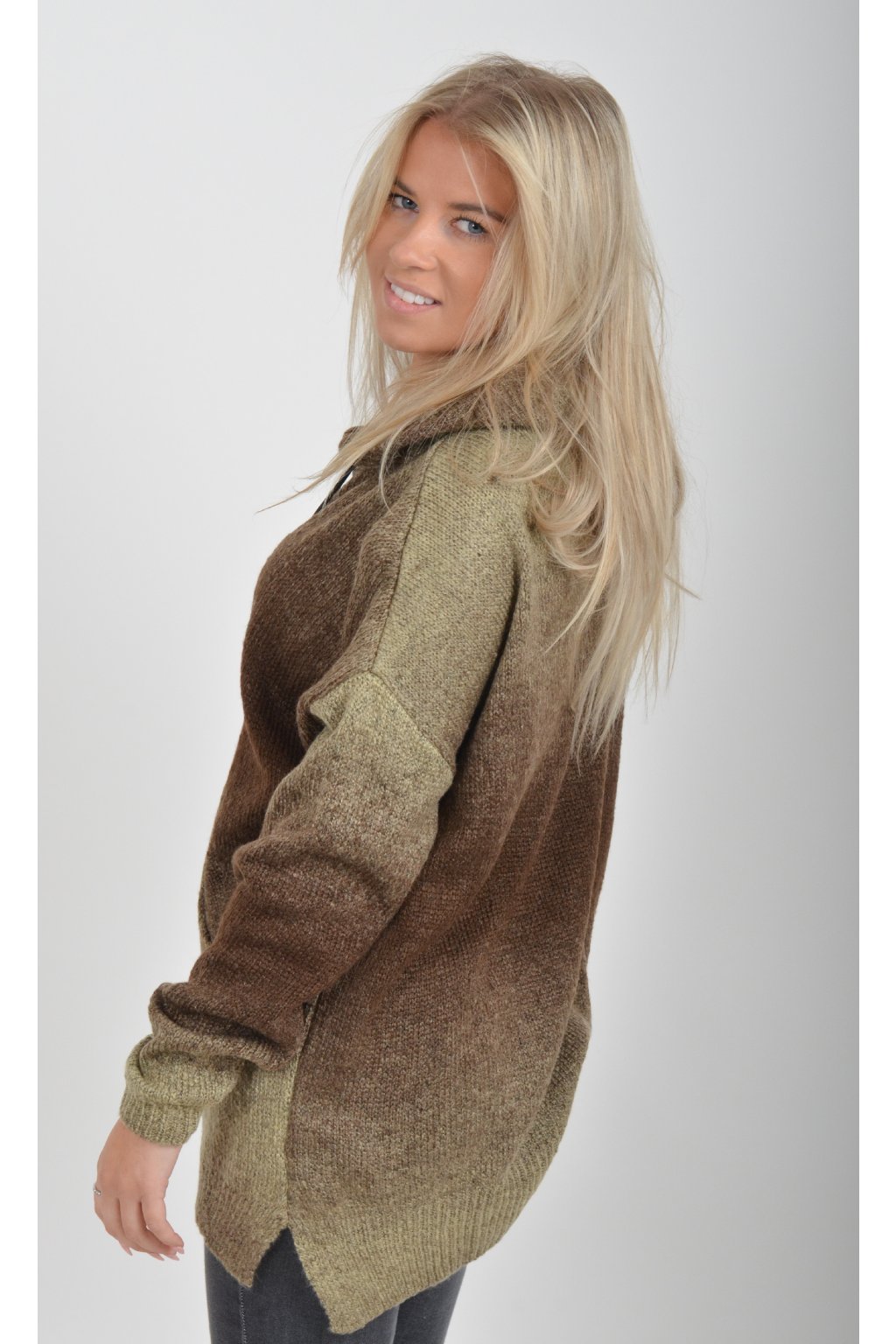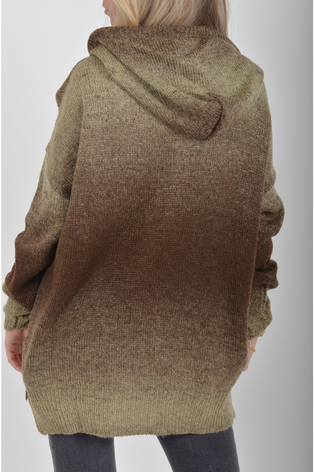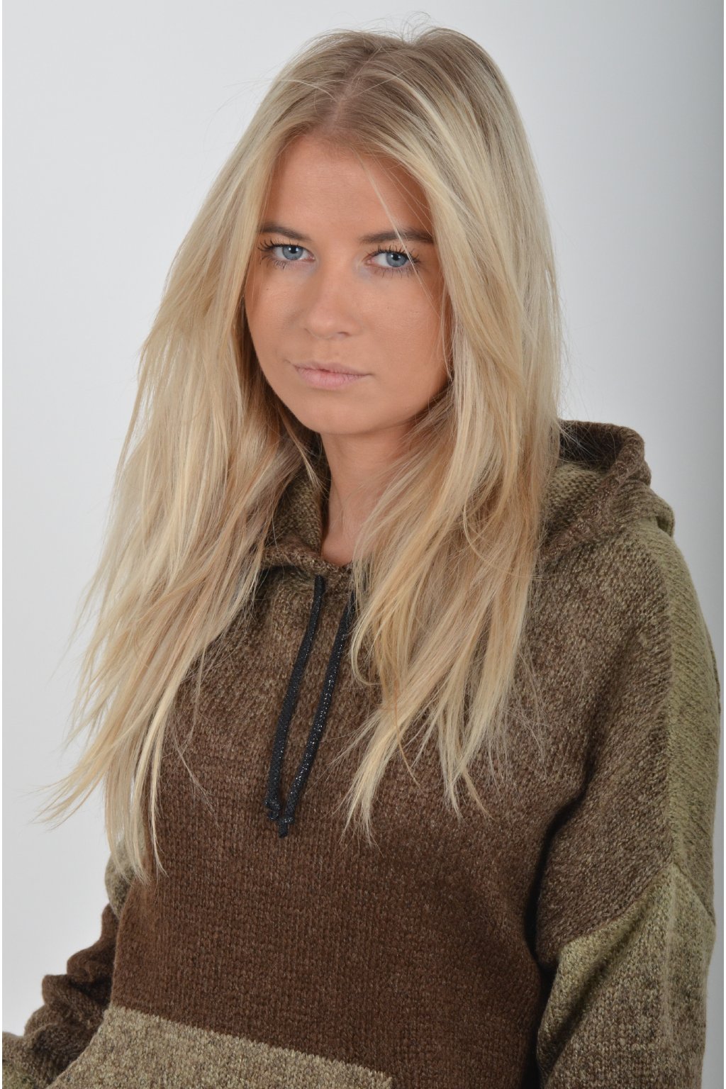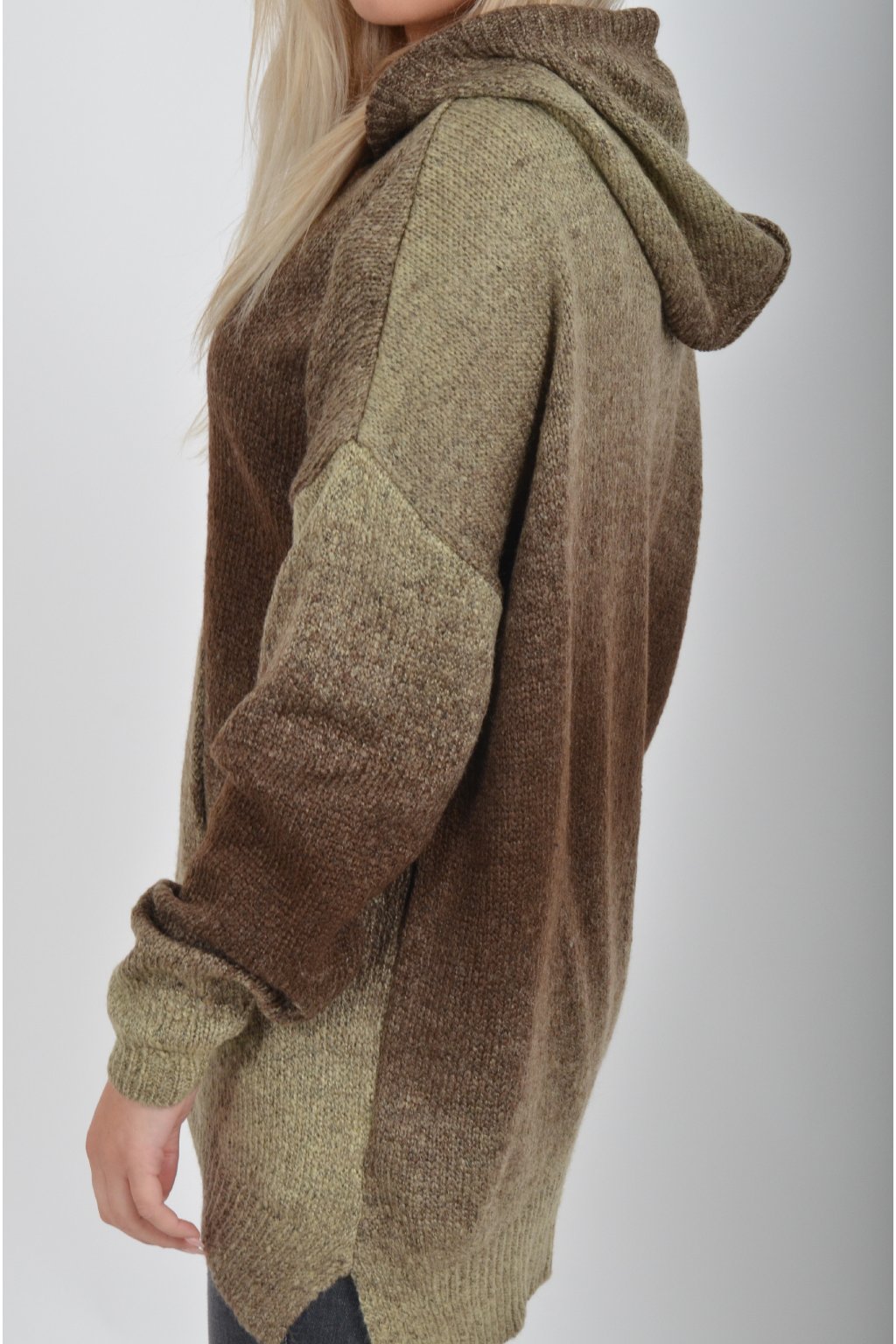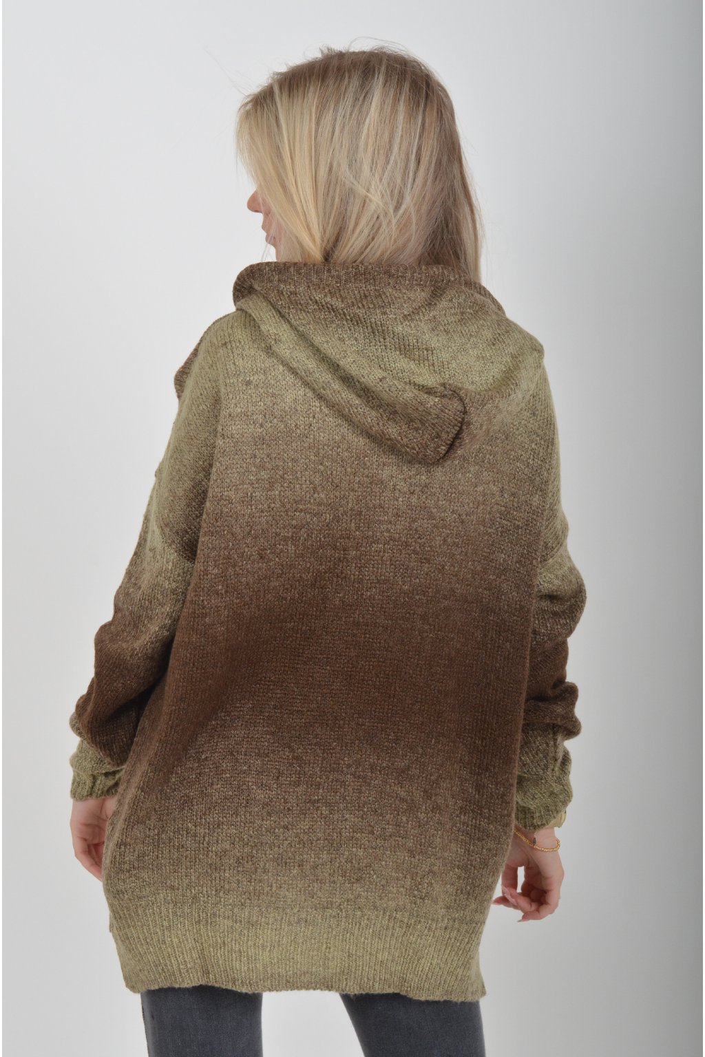 Žíhaný elastický svetr s dlouhým rukávem s barevnou kombinací, hnědá a khaki. Svetr má kapuci a klokaní kapsu a je z velice příjemného a nekousavého materiálu.