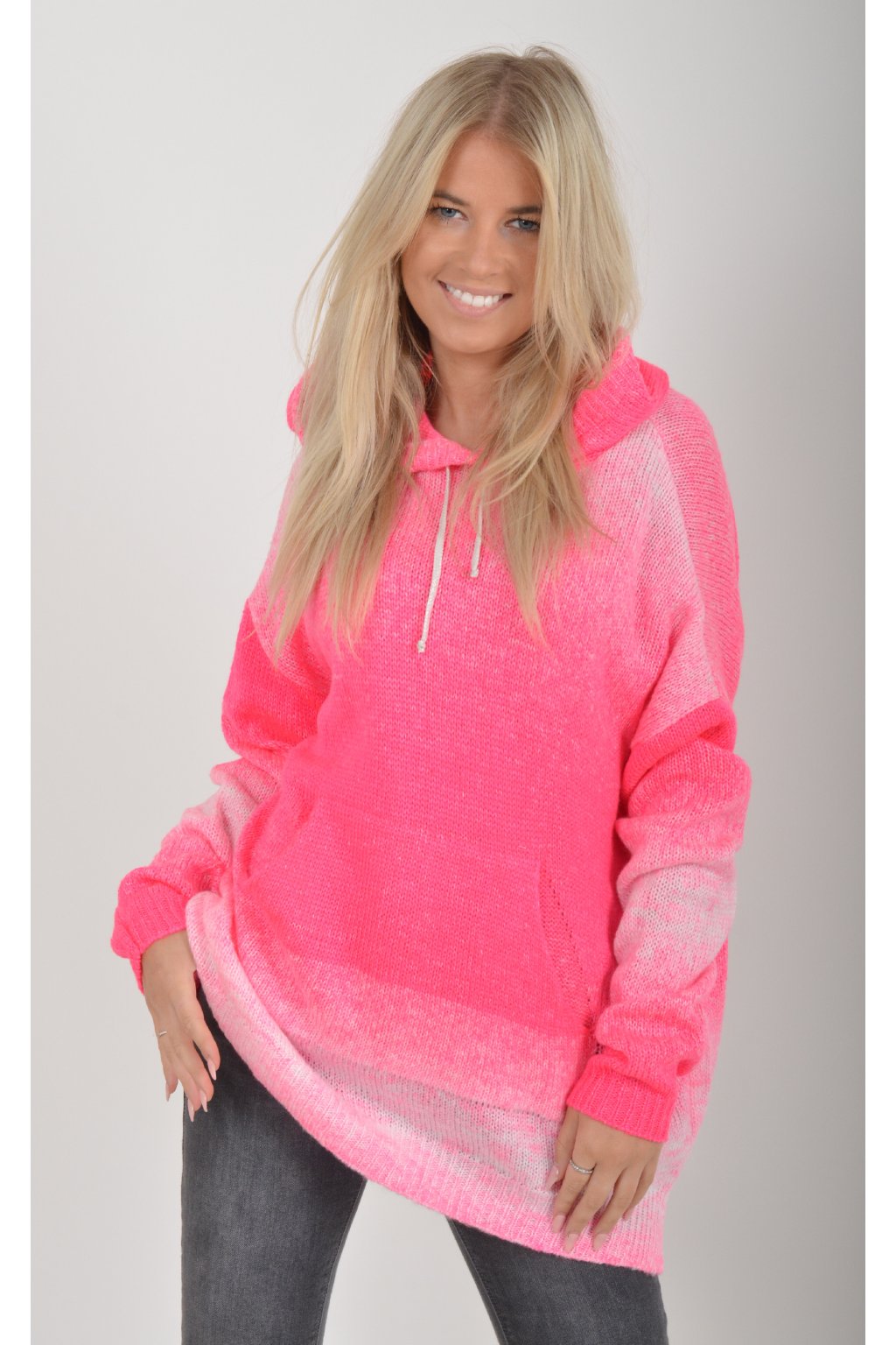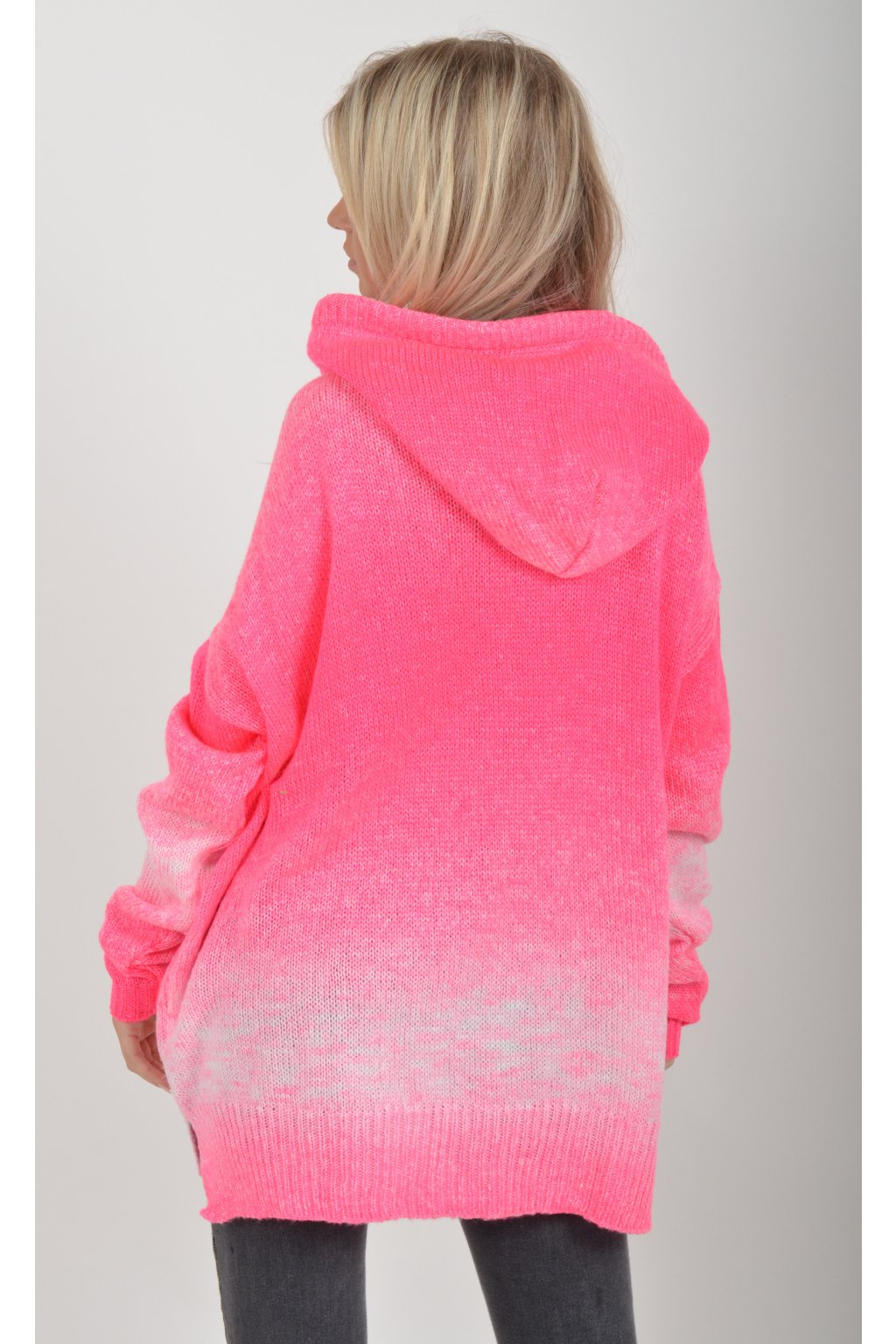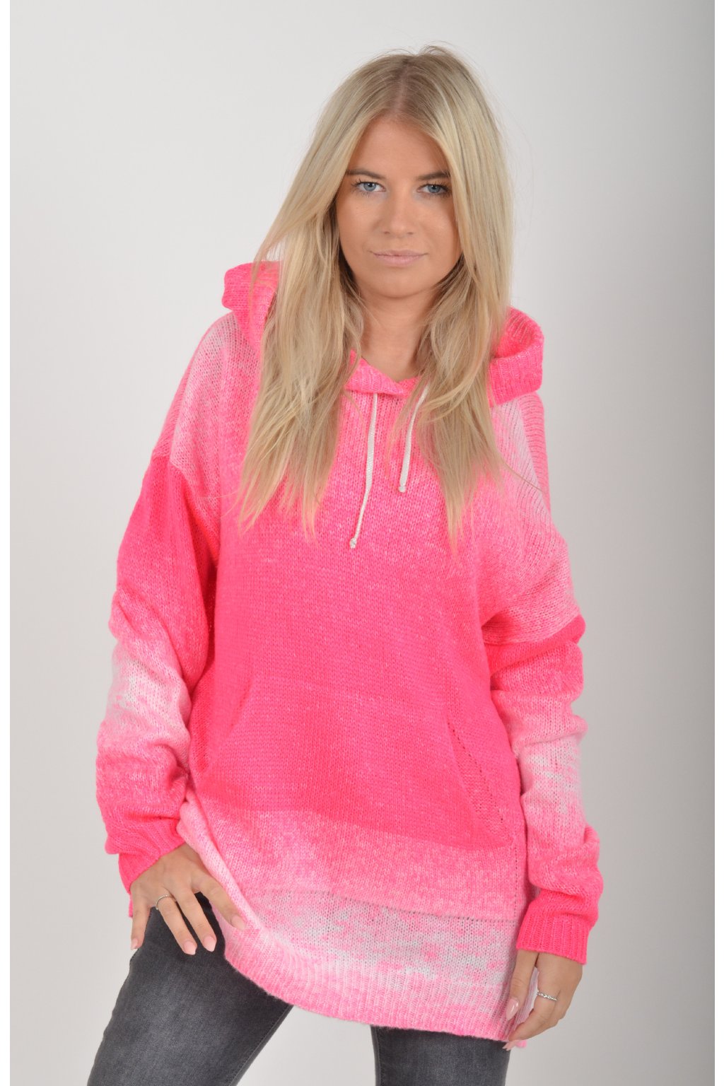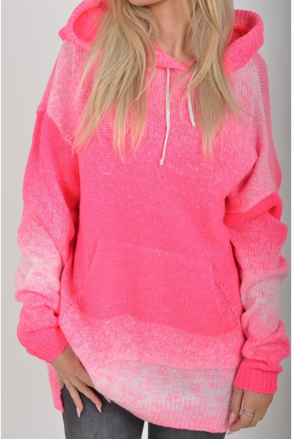 Žíhaný elastický svetr s dlouhým rukávem s barevnou kombinací, růžová a bílá. Svetr má kapuci a klokaní kapsu a je z velice příjemného a nekousavého materiálu.
