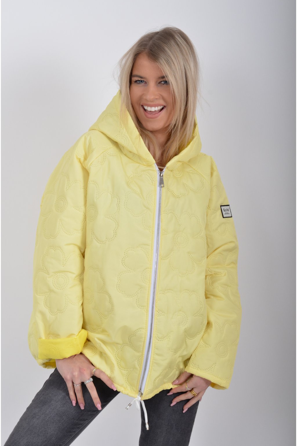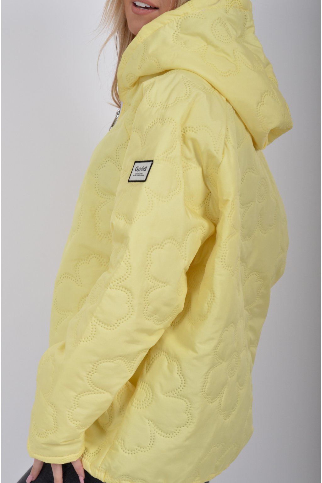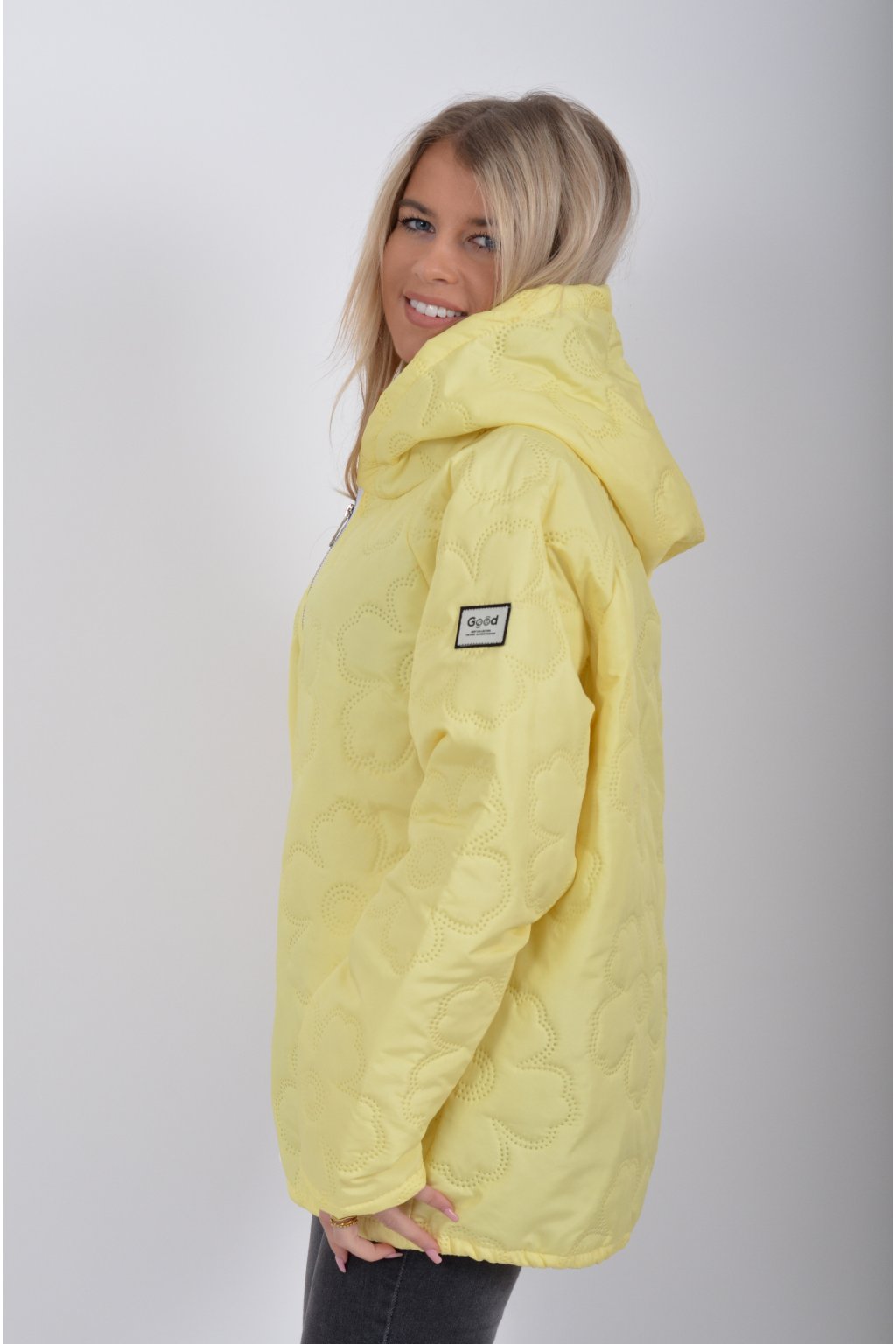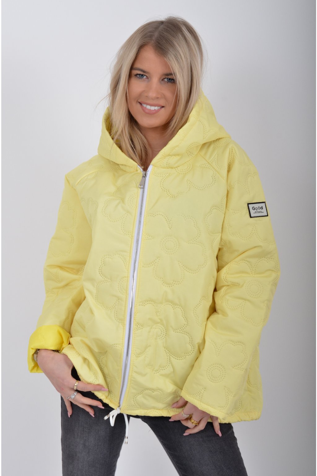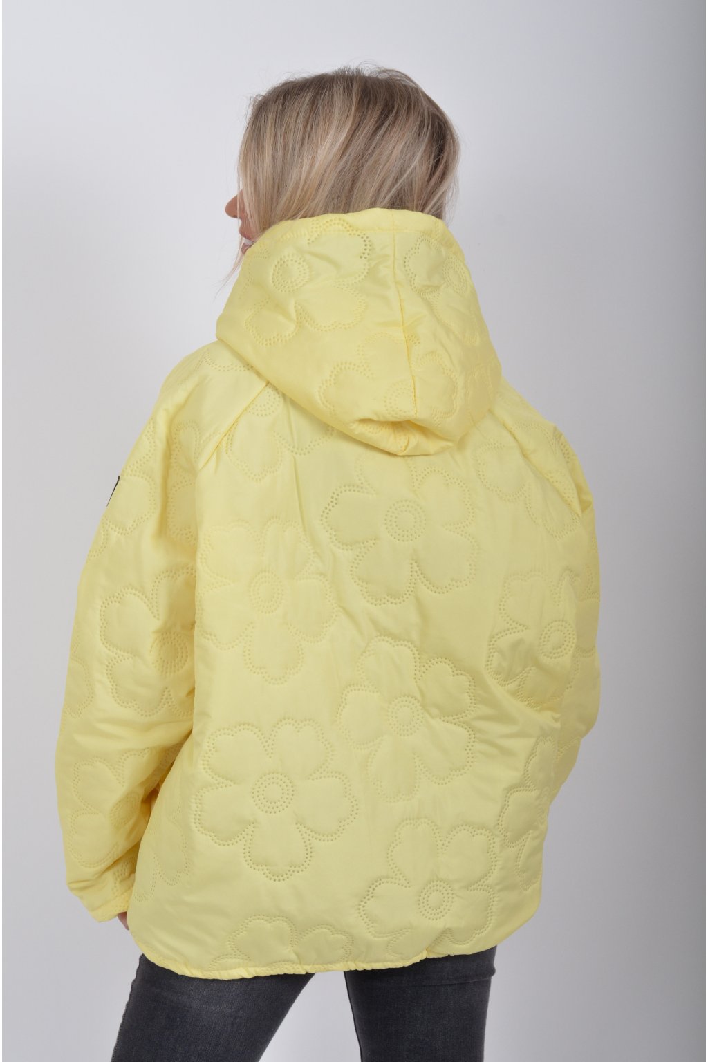 Přechodová bunda s kapuci a kapsami na bocích volnějšího střihu. Bunda je vyrobena z odlehčeného materiálu, tedy je ideální pro jarní nošení. Ve spodní části je zapracovaná tkanice pro libovolné stažení.