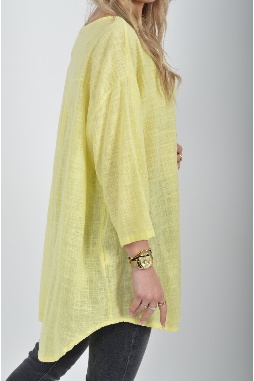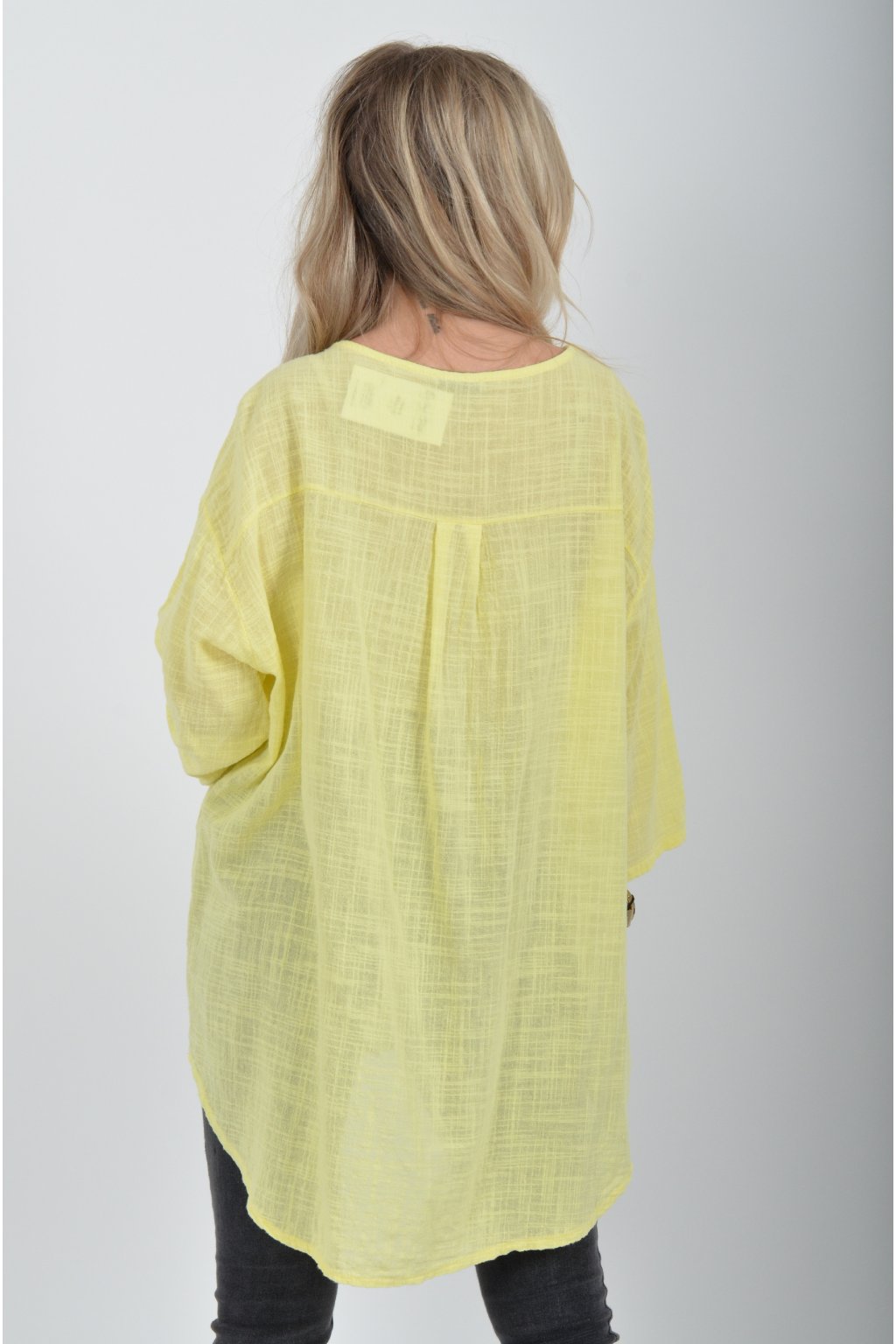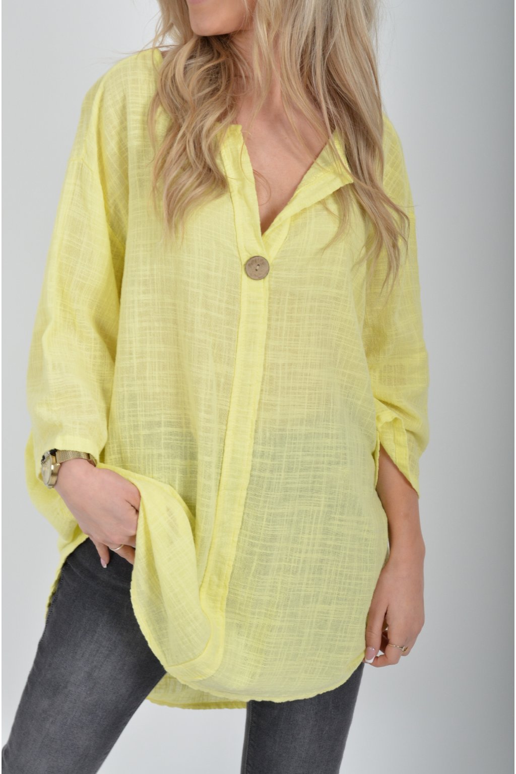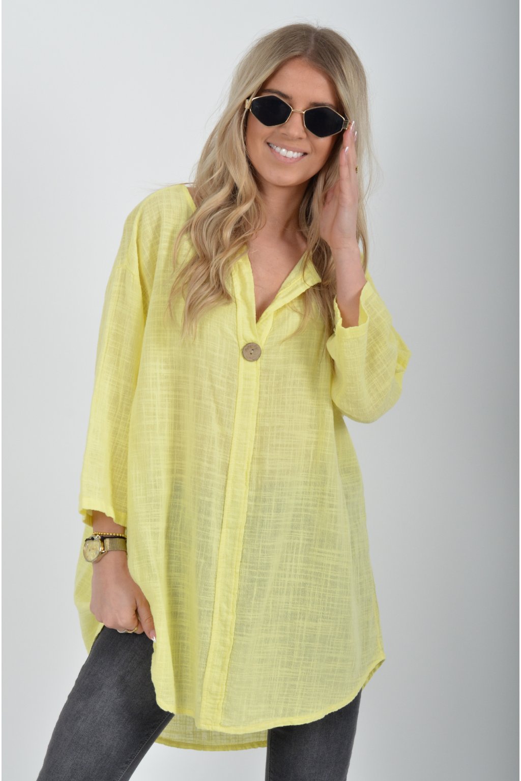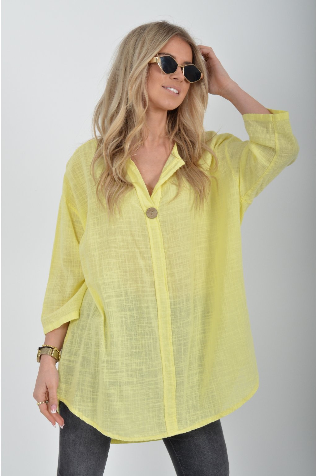 Bavlněné halenka s tříčtvrtečním rukávem. Halenka má výstřih do V a ozdobný knoflík. Je vyrobena z příjemného a lehounkého materiálu. Zadní část halenky je delší než přední.