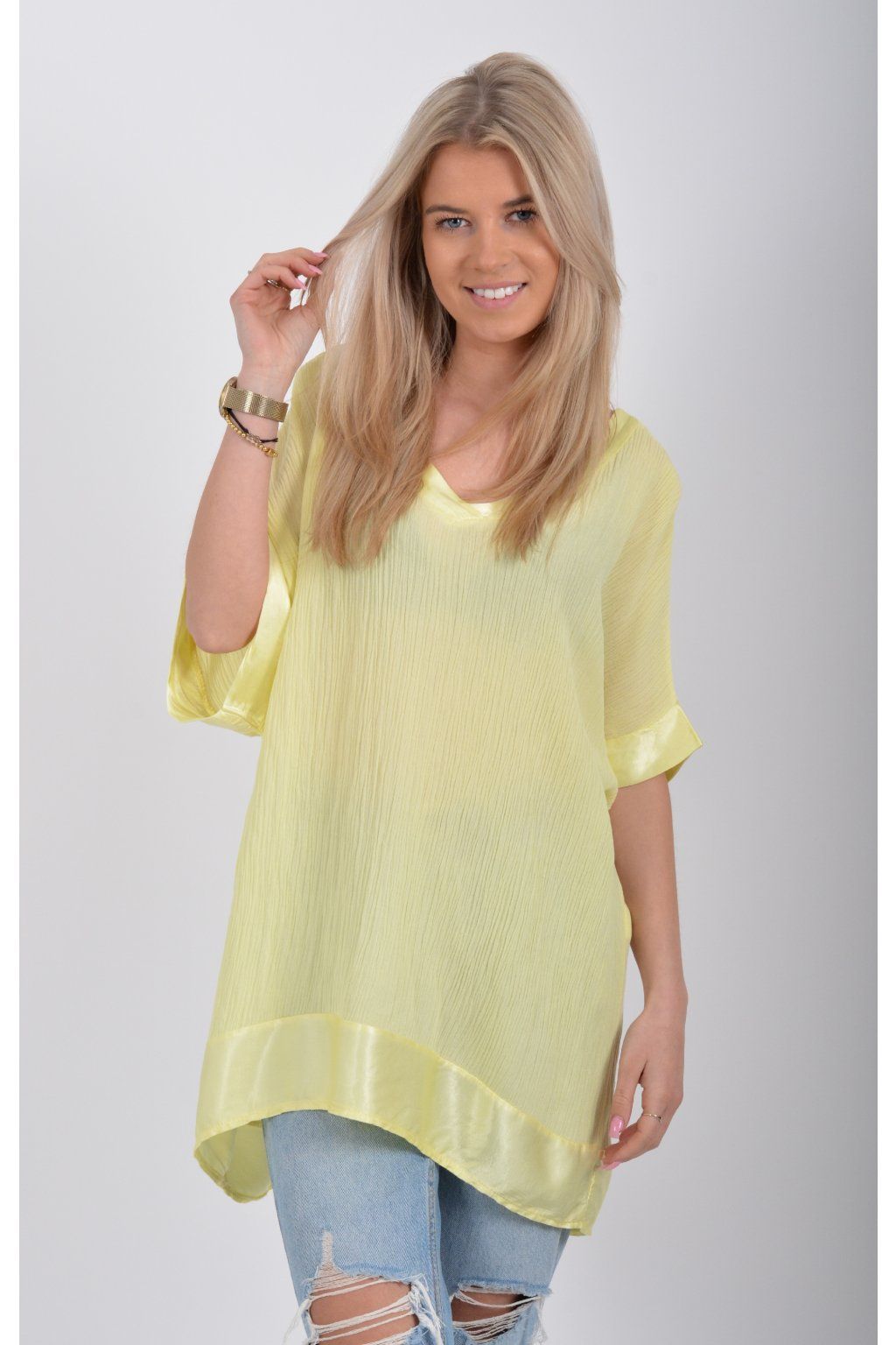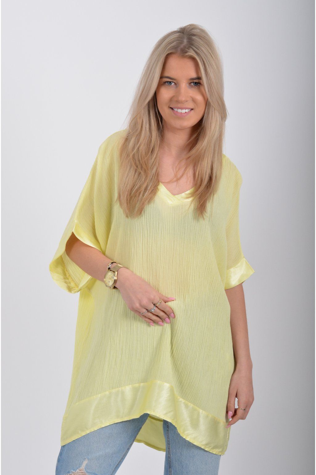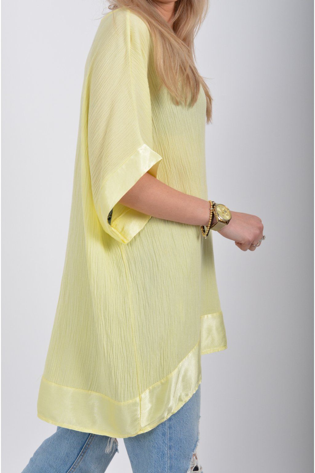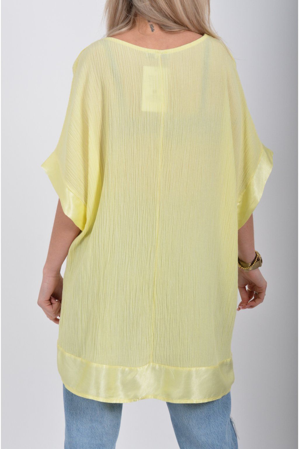 Oversize halenka s krátkým rukávem a lesklými ozdobnými lemy. Materiál halenky je lehce pružný a velice příjemný. Zadní část halenky je delší než přední.