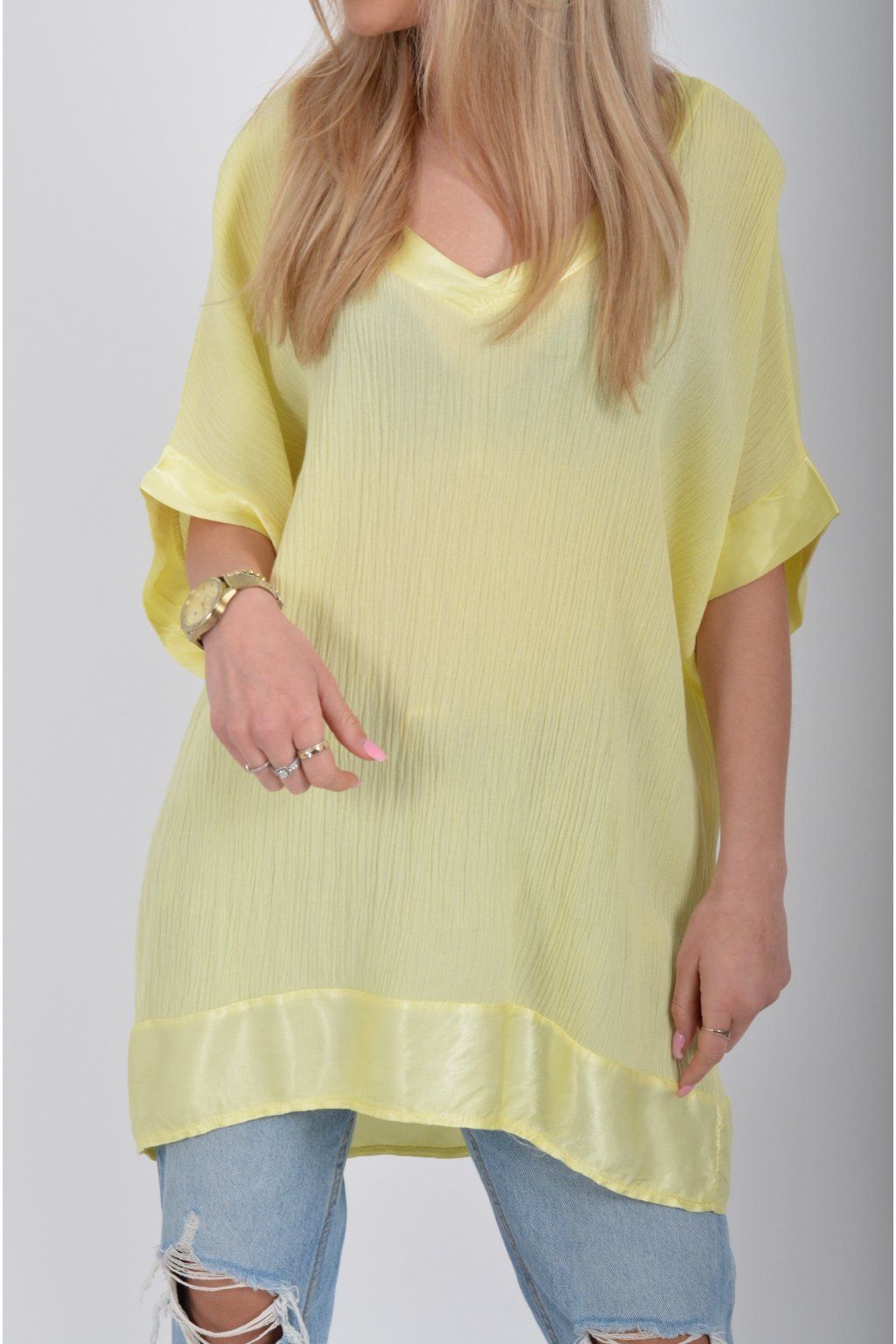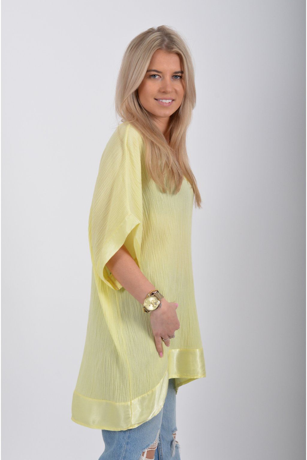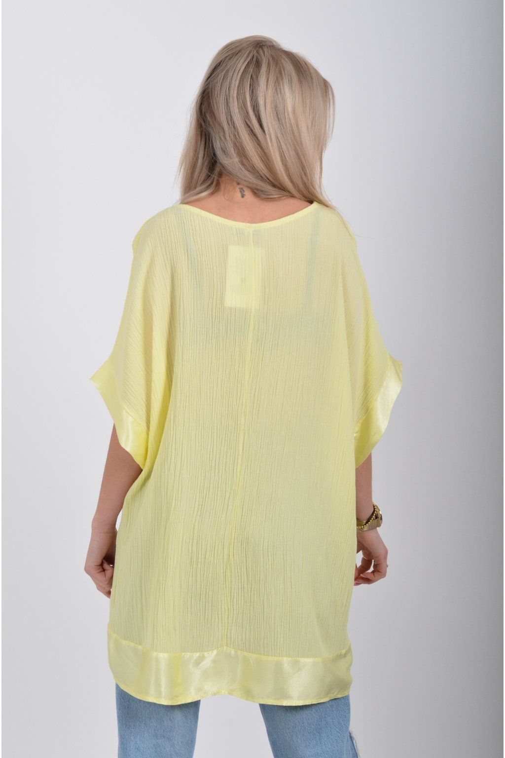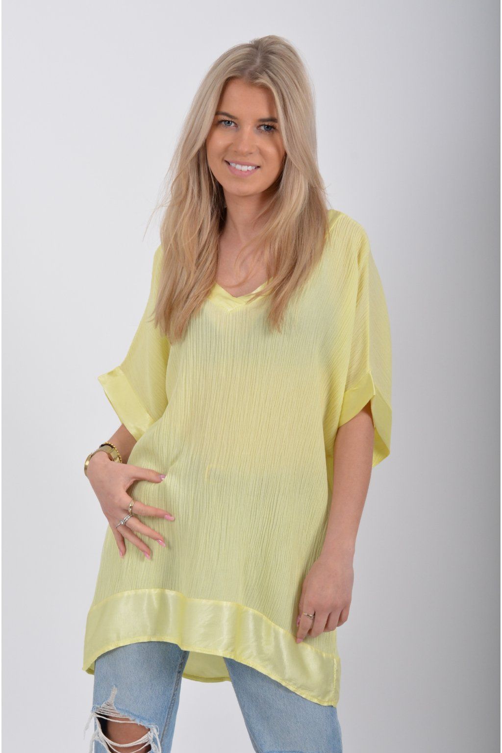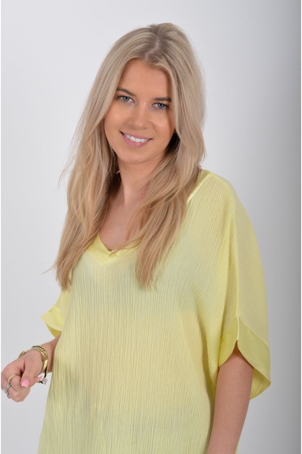 Oversize halenka s krátkým rukávem a lesklými ozdobnými lemy. Materiál halenky je lehce pružný a velice příjemný. Zadní část halenky je delší než přední.