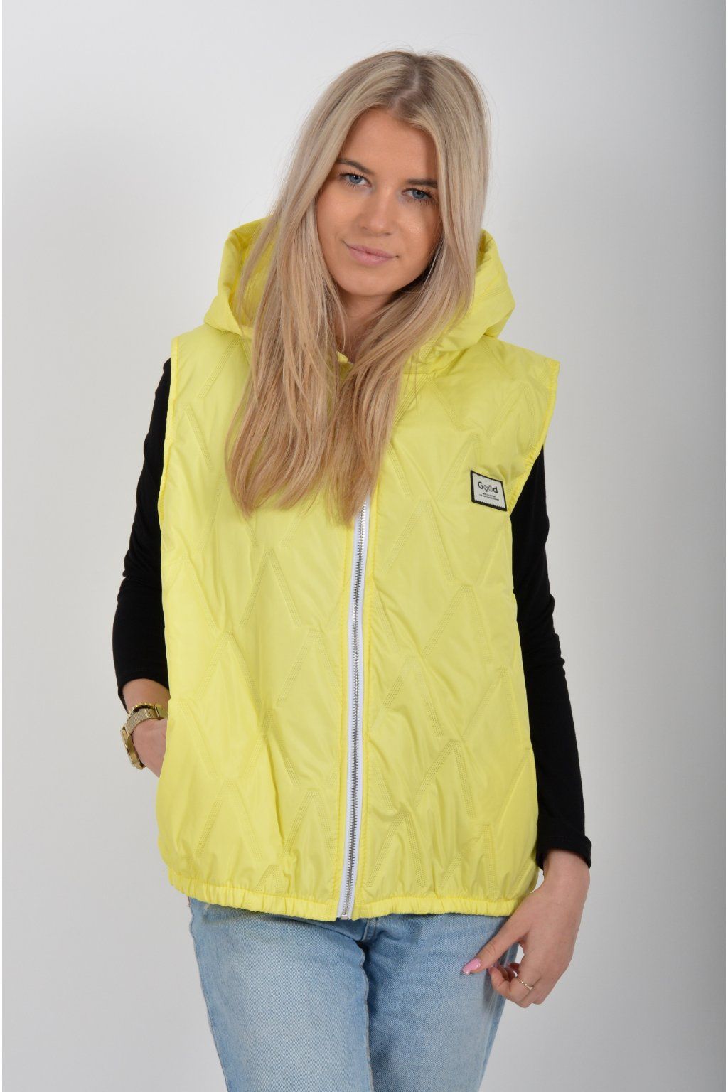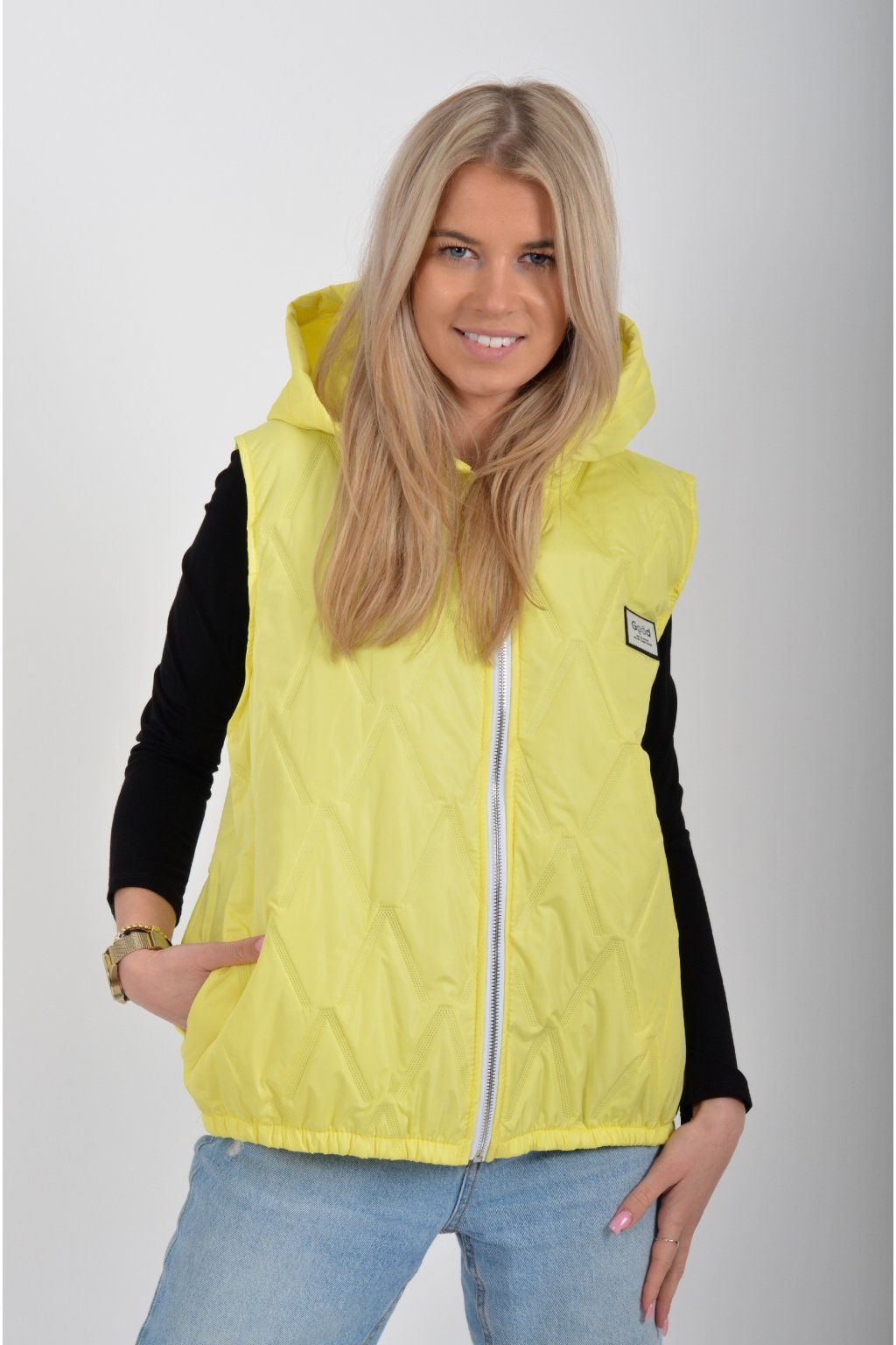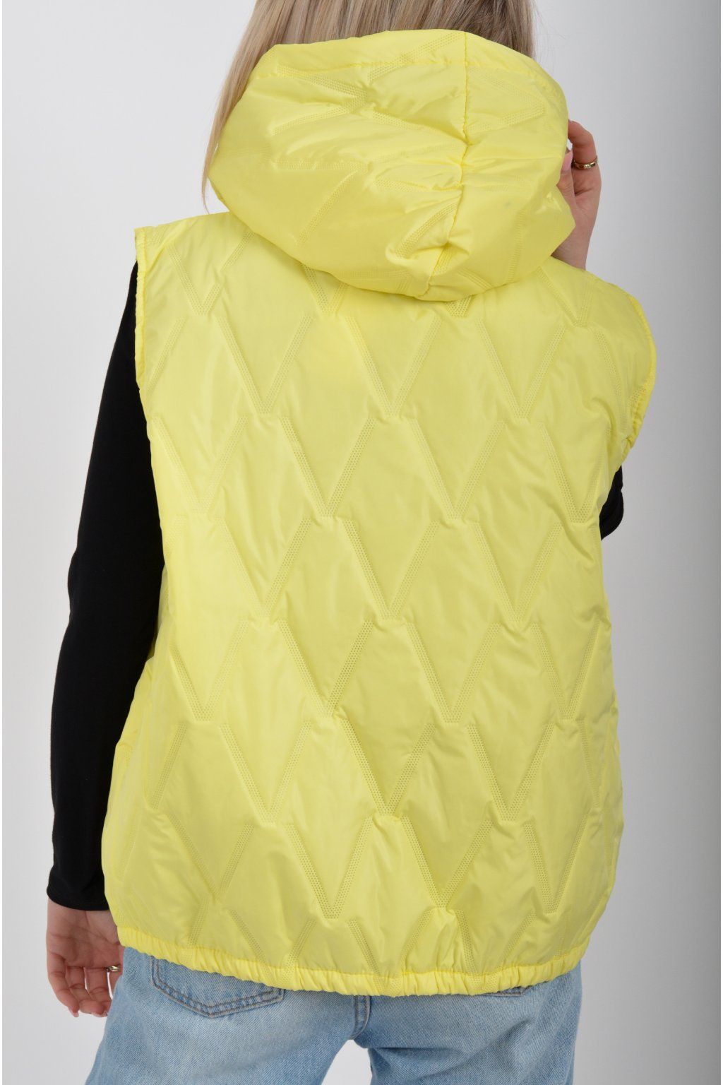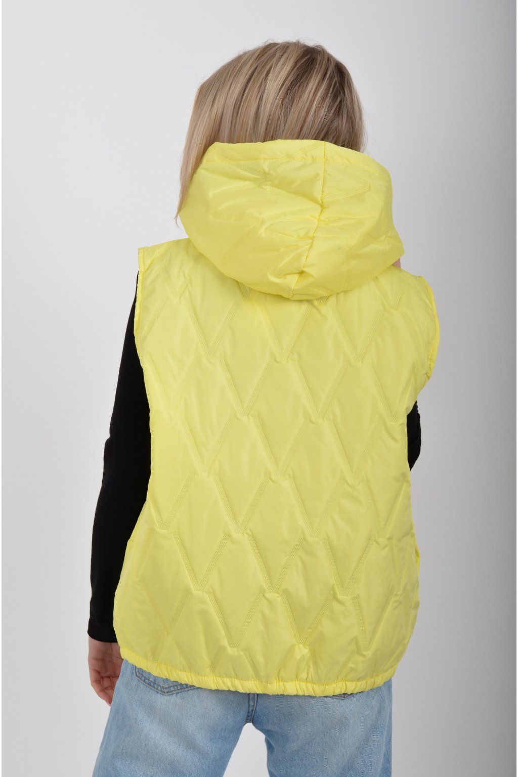 Prošívaná přechodová vesta rovného střihu s kapucí. Materiál vesty je z odlehčeného materiálu. Vesta nemá kapsy. Ve spodní části vesty je zapracovaná guma.