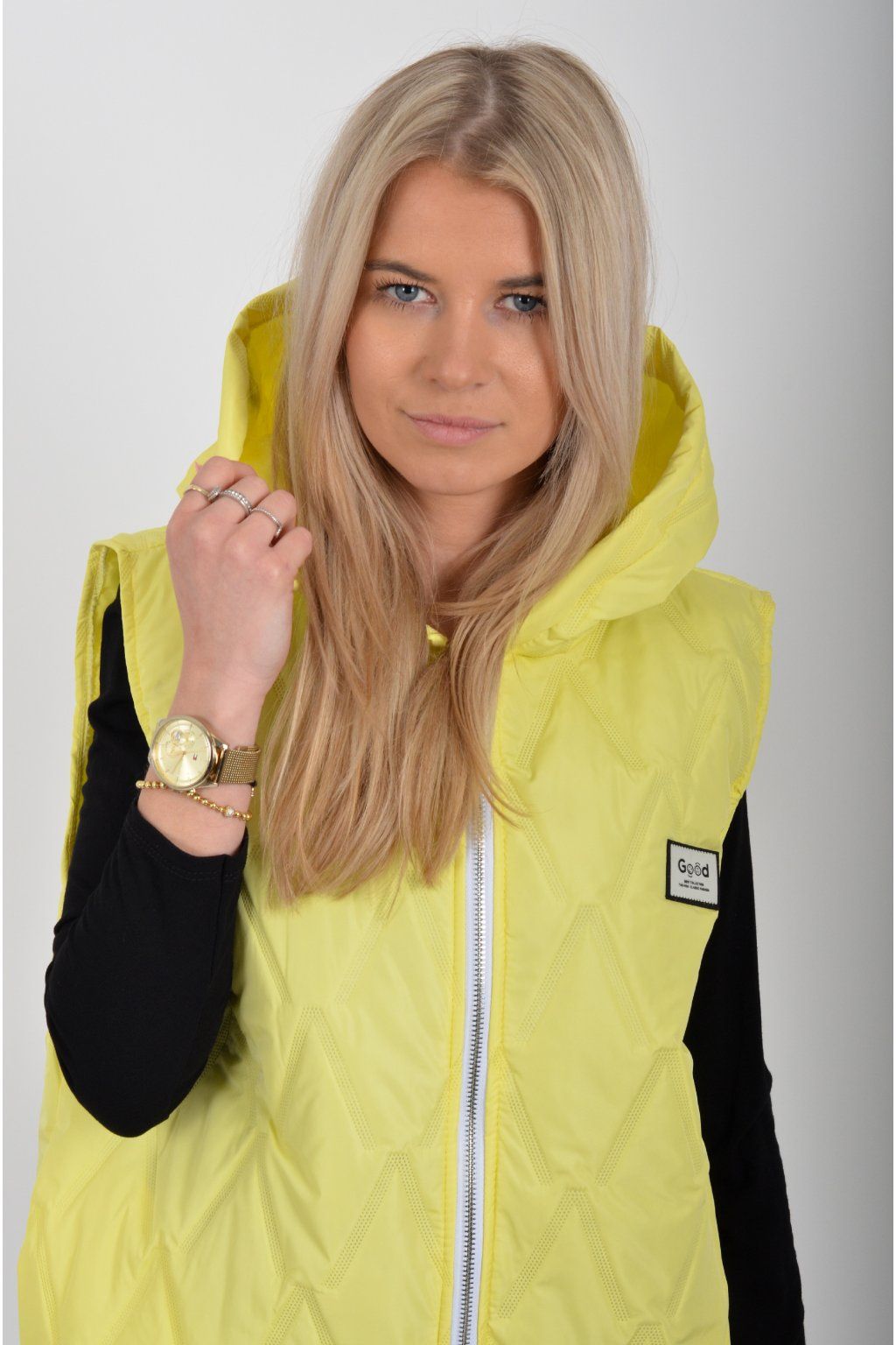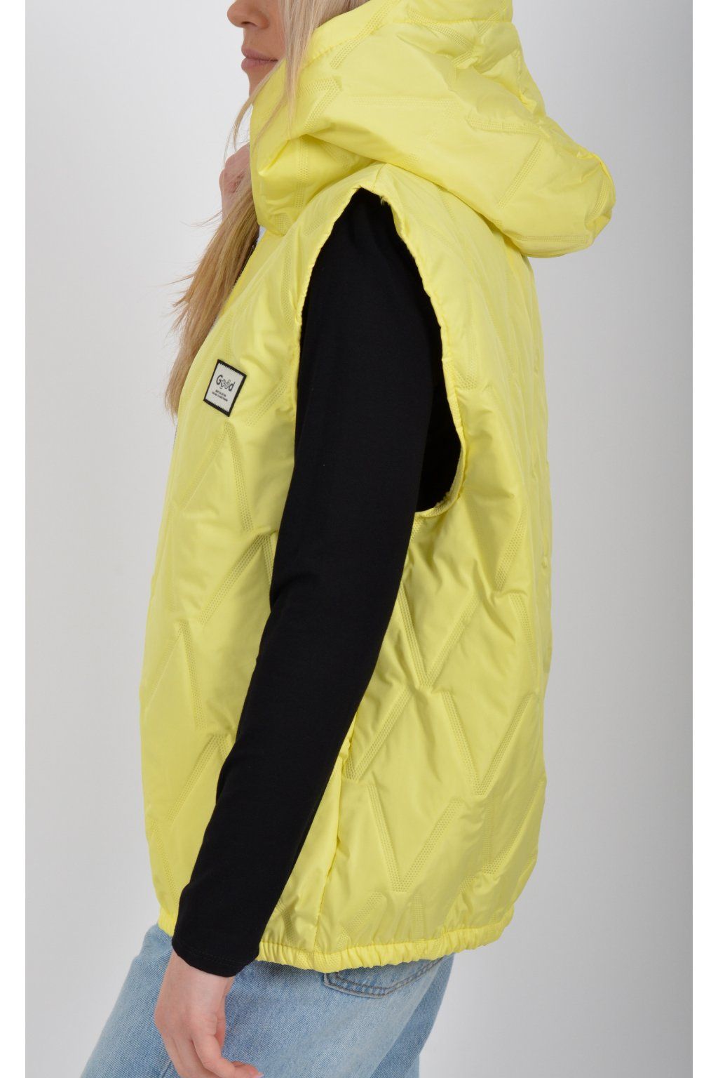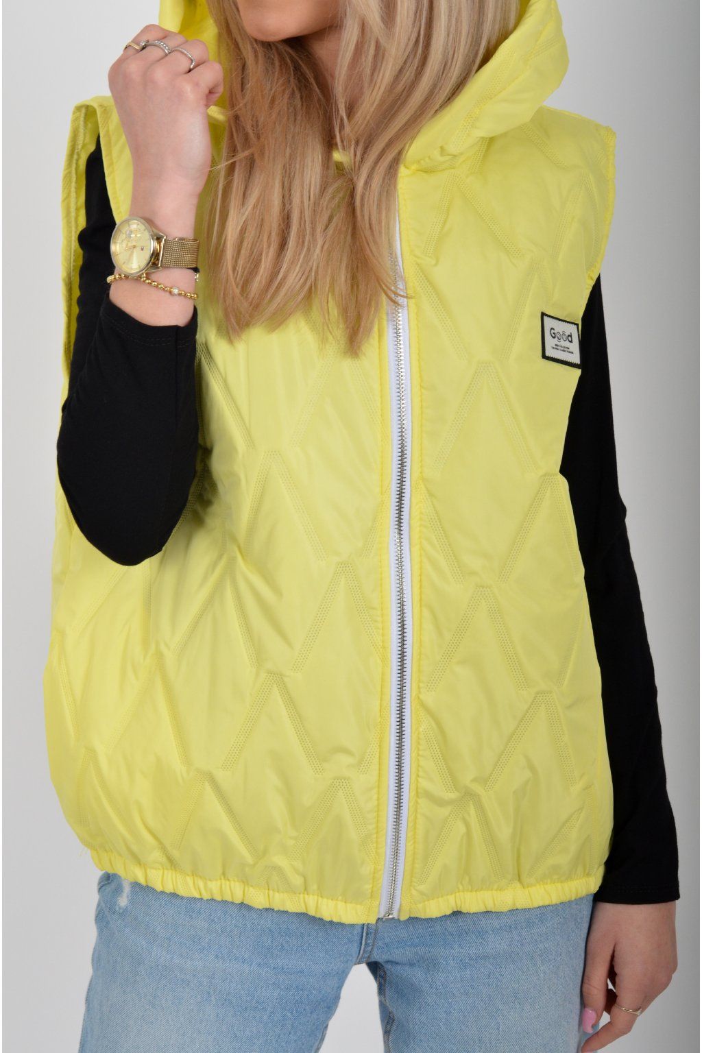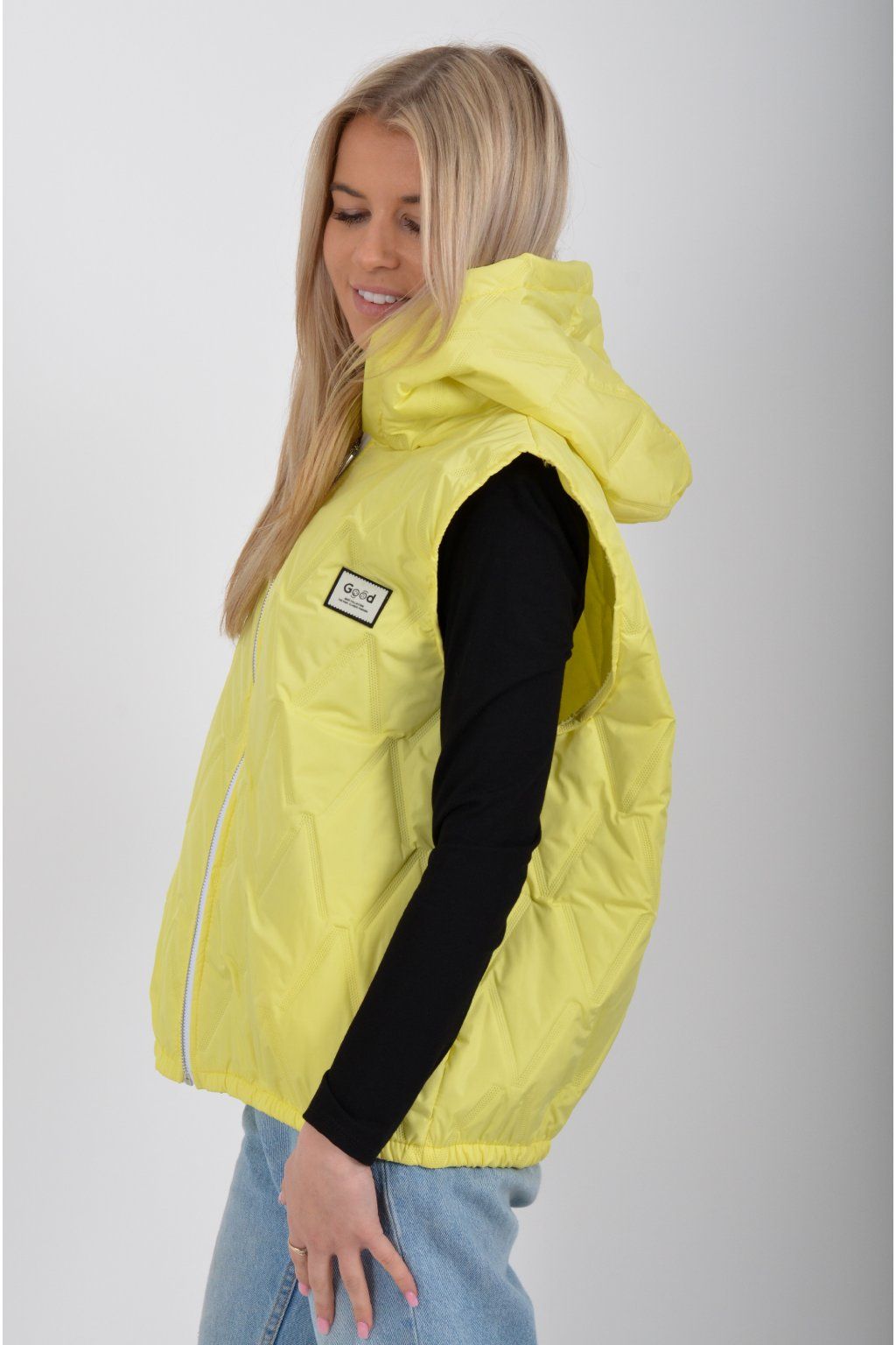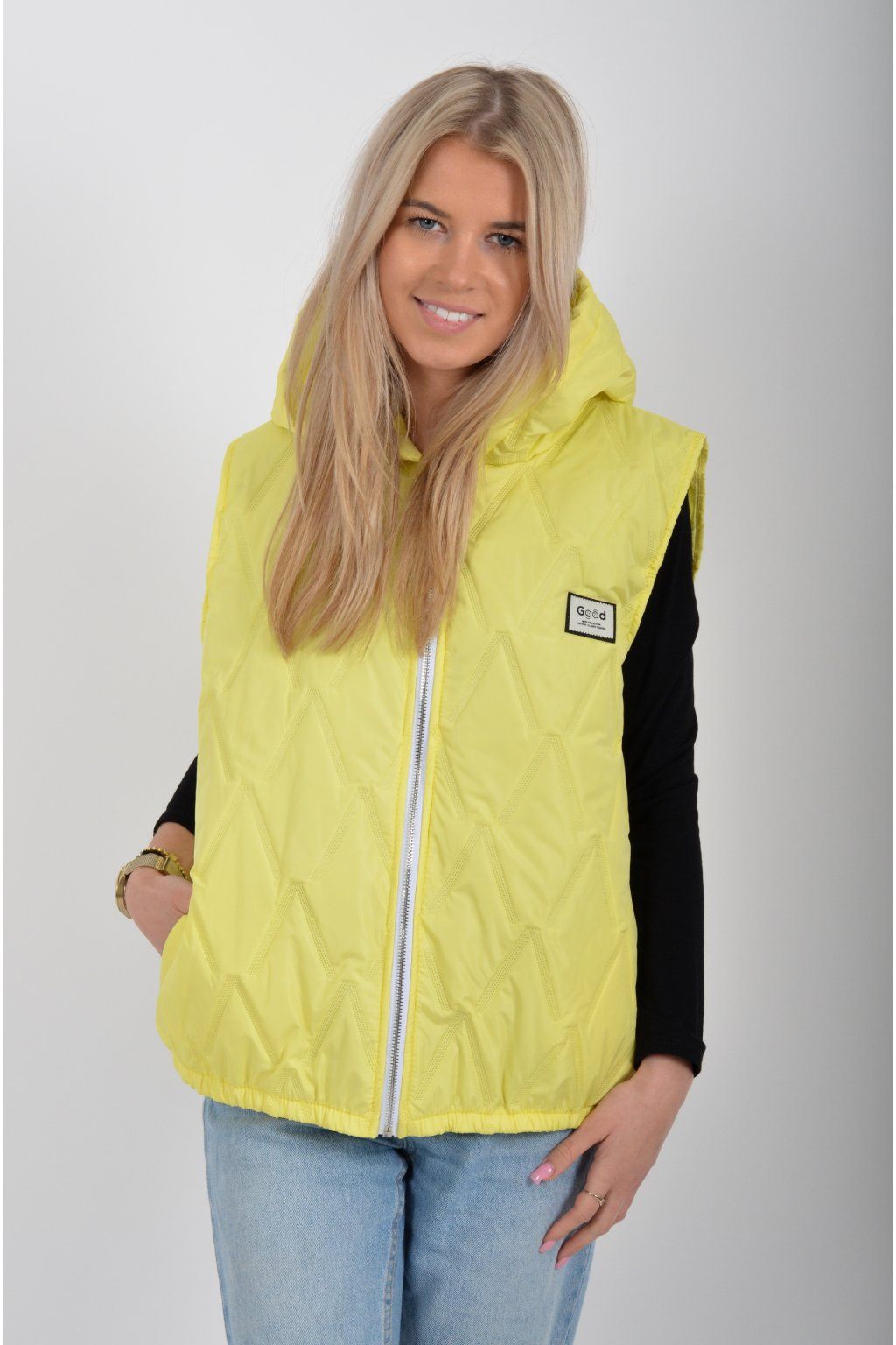 Prošívaná přechodová vesta rovného střihu s kapucí. Materiál vesty je z odlehčeného materiálu. Vesta nemá kapsy. Ve spodní části vesty je zapracovaná guma.