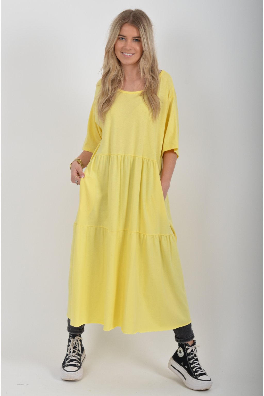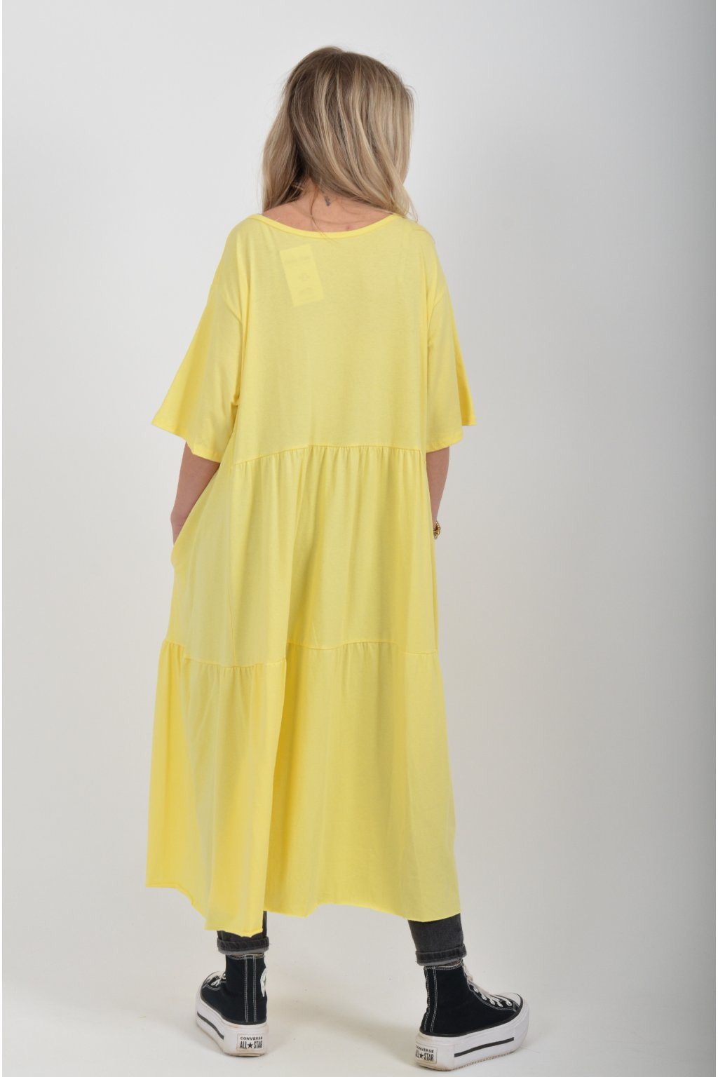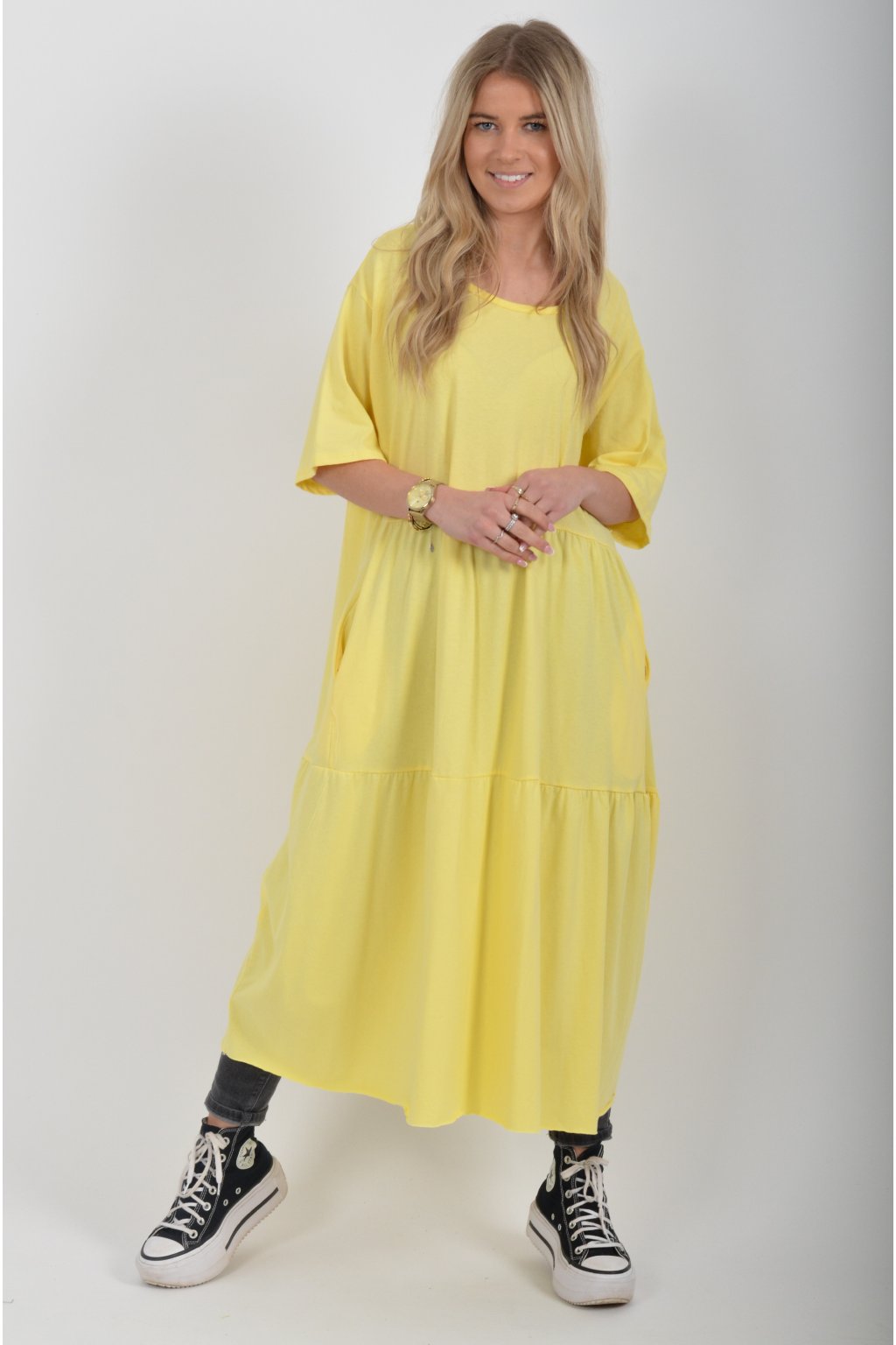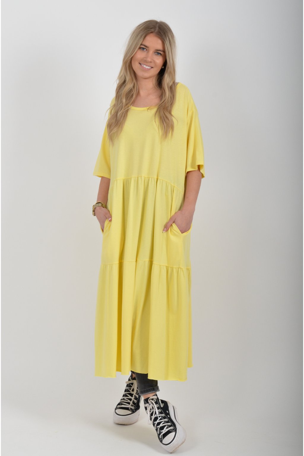 Jednobarevné dlouhé šaty s krátkým rukávem a kapsami na bocích. Jsou vyrobené z velice příjemné bavlny.