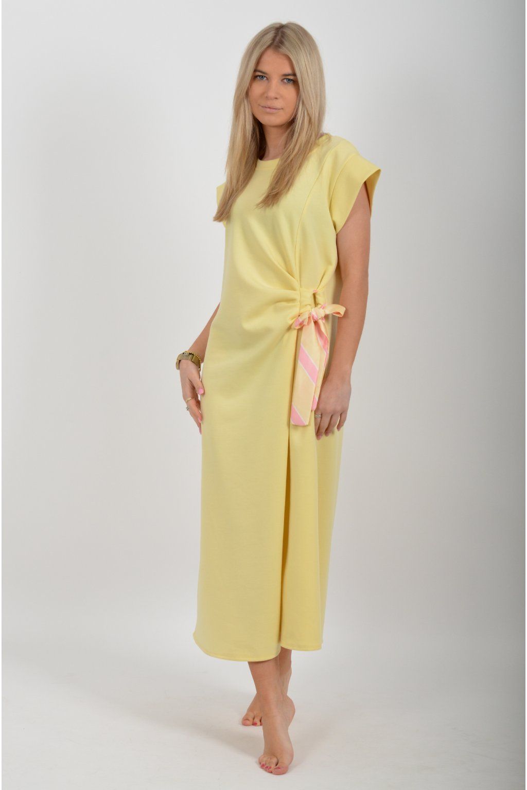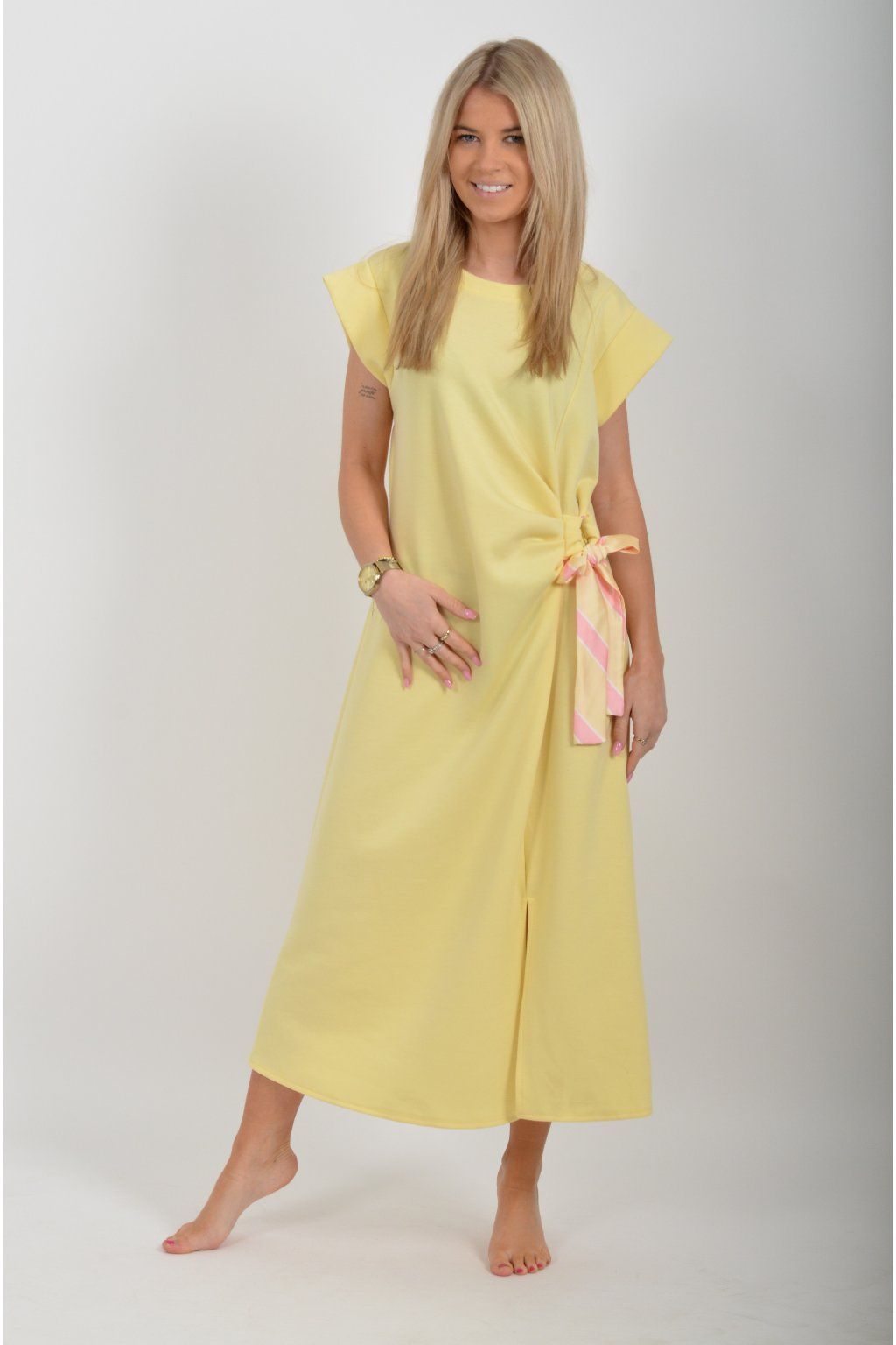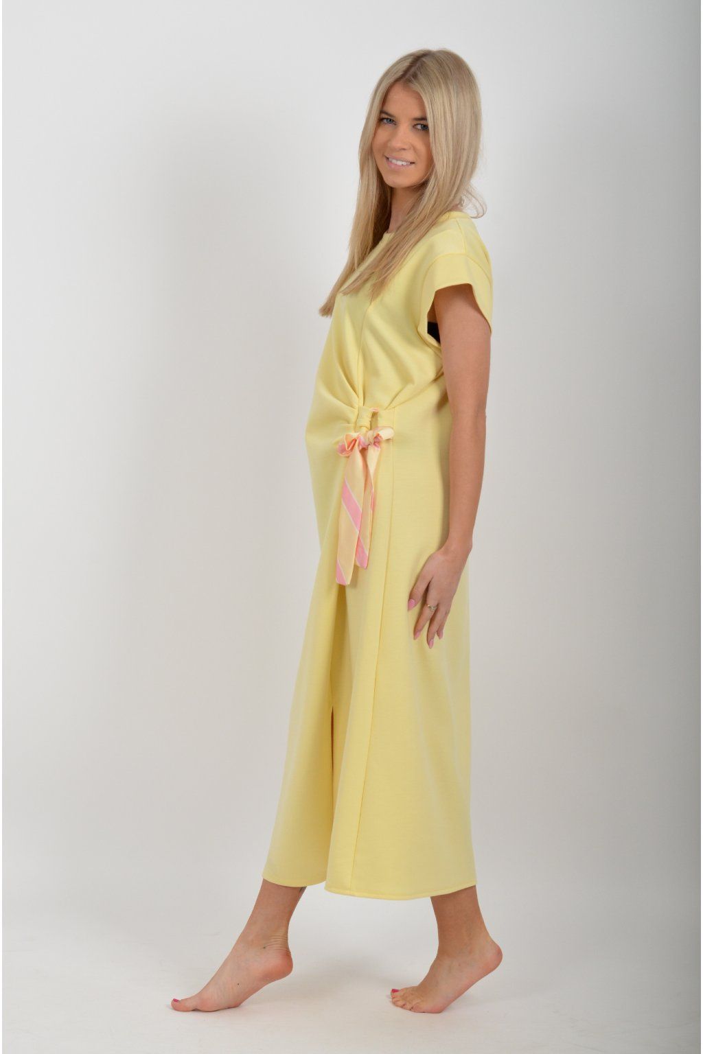 Dlouhé šaty vyrobené z velice příjemného máslového materiálu. Mají od pasu, který je lehce projmutý áčkový střih. V pase na boku mají "vázání" pomocí kterého lze šaty libovolně stáhnout aby dobře seděli na postavě. Ve spodní části májí rozparek a nemají kapsy.