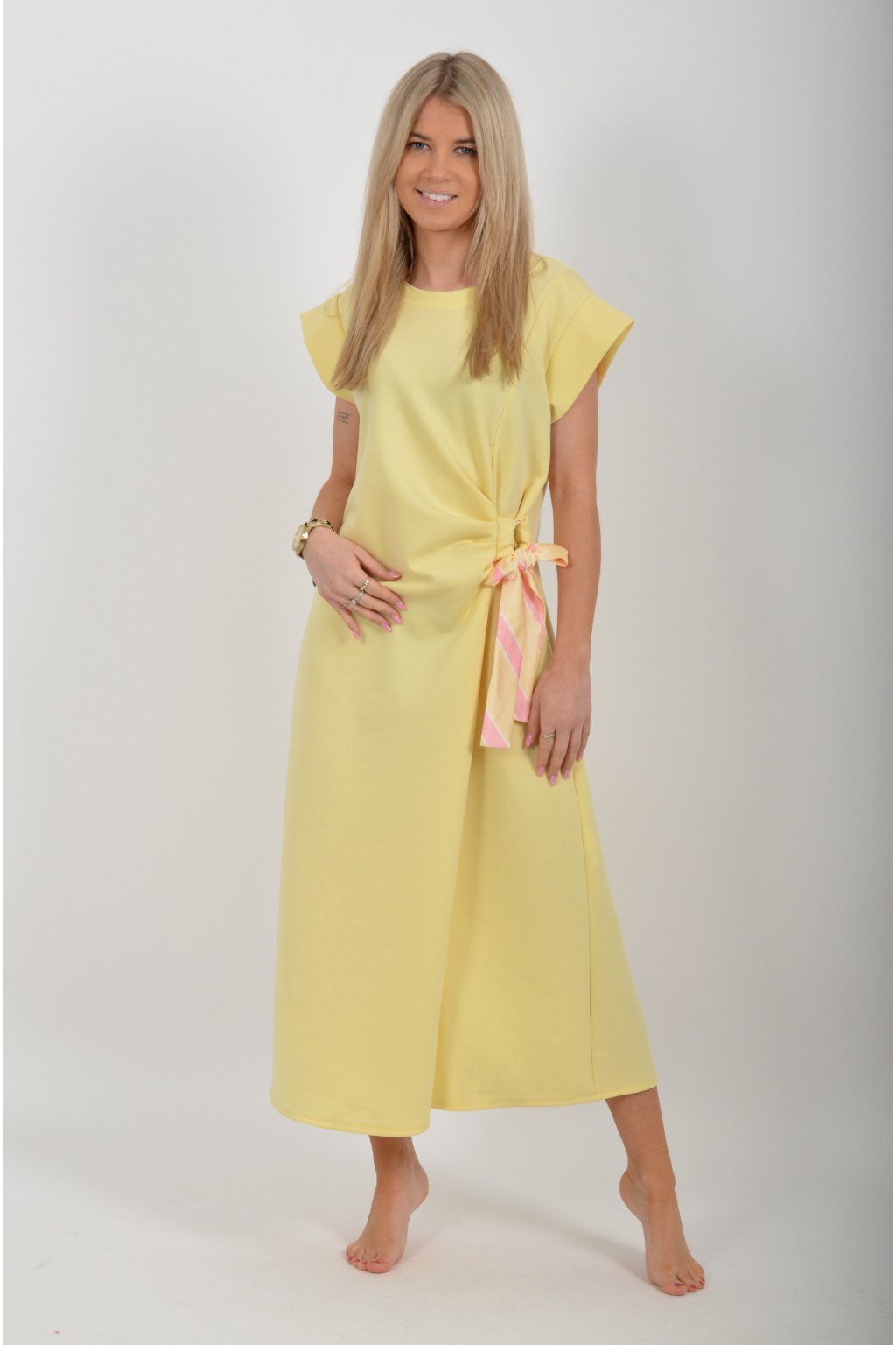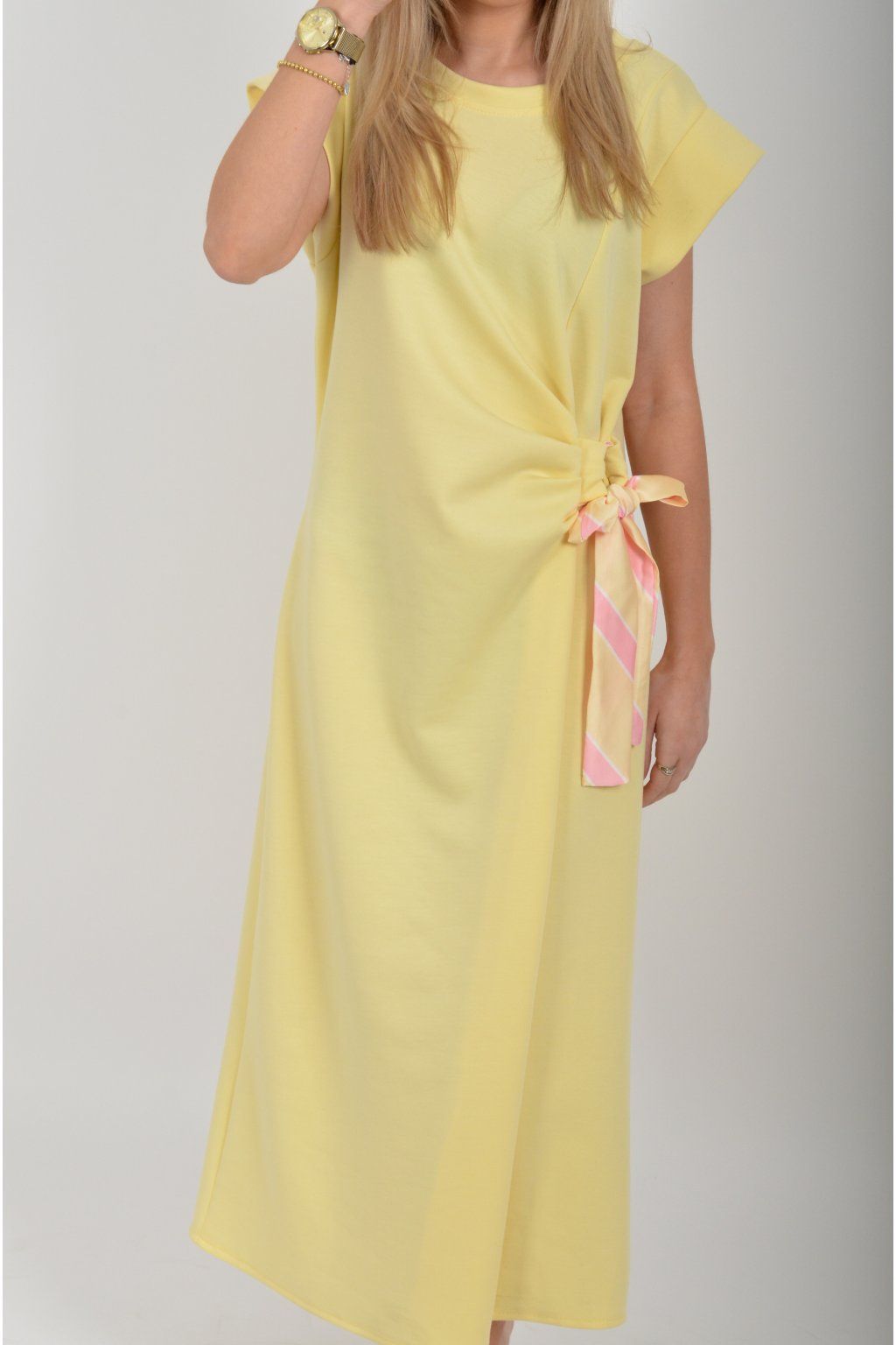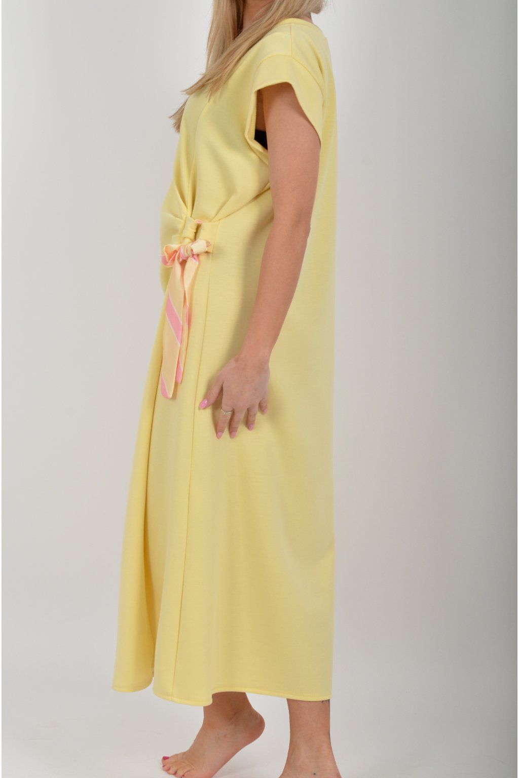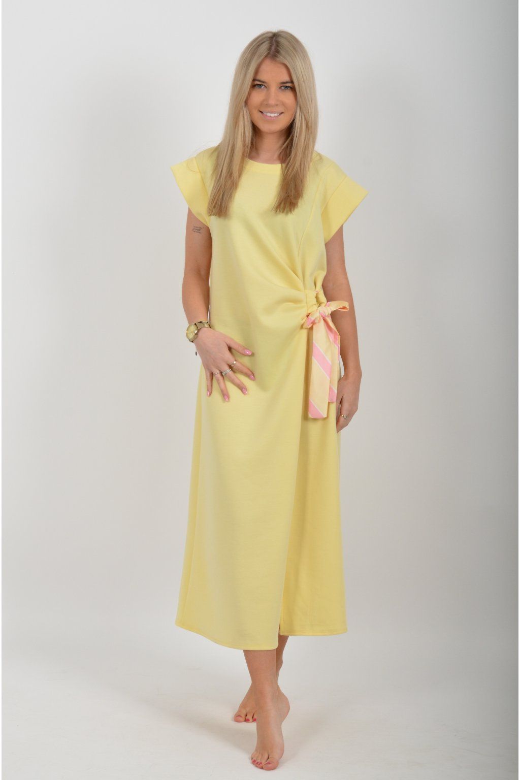 Dlouhé šaty vyrobené z velice příjemného máslového materiálu. Mají od pasu, který je lehce projmutý áčkový střih. V pase na boku mají "vázání" pomocí kterého lze šaty libovolně stáhnout aby dobře seděli na postavě. Ve spodní části májí rozparek a nemají kapsy.