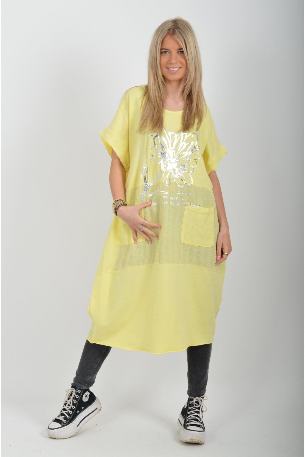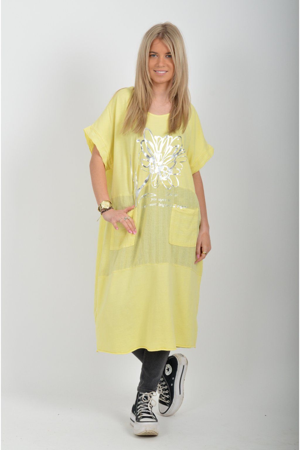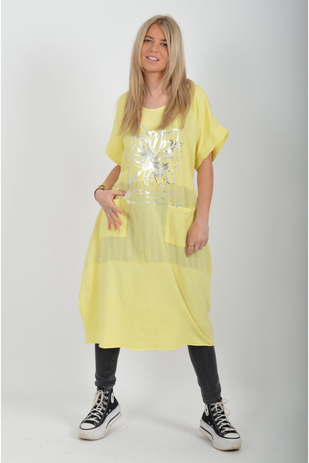 Zajímavé bavlněné šaty se stříbrným potiskem a kapsami v přední části.. Mají balónový střih a krátké rukávy. Jsou vyrobené z velice příjemného a pružného materiálu.