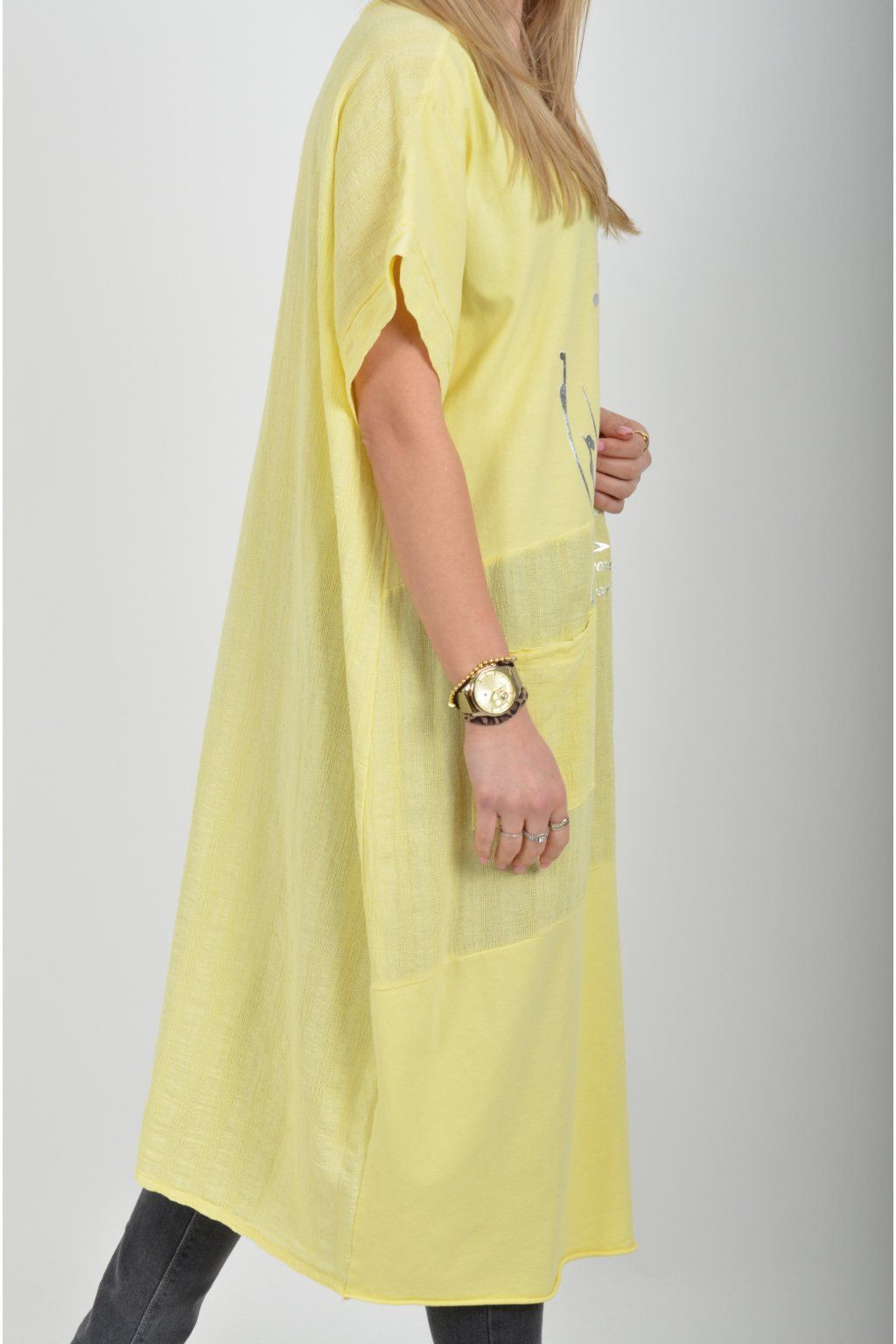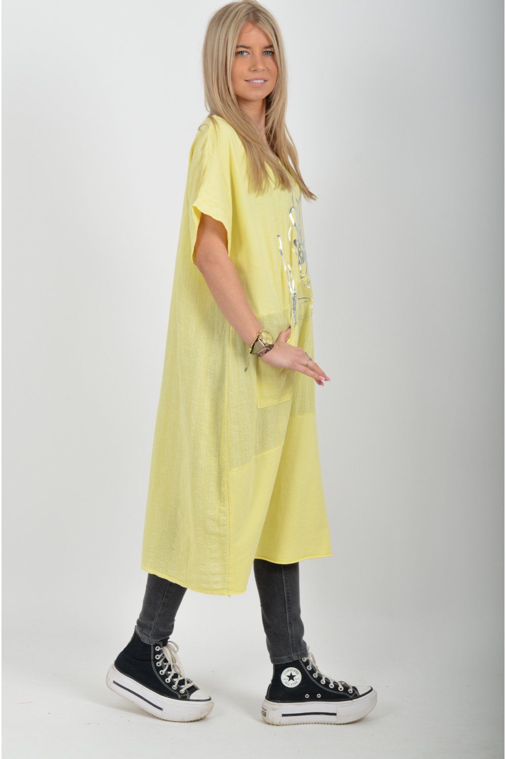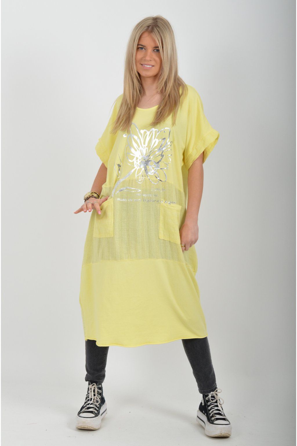 Zajímavé bavlněné šaty se stříbrným potiskem a kapsami v přední části.. Mají balónový střih a krátké rukávy. Jsou vyrobené z velice příjemného a pružného materiálu.